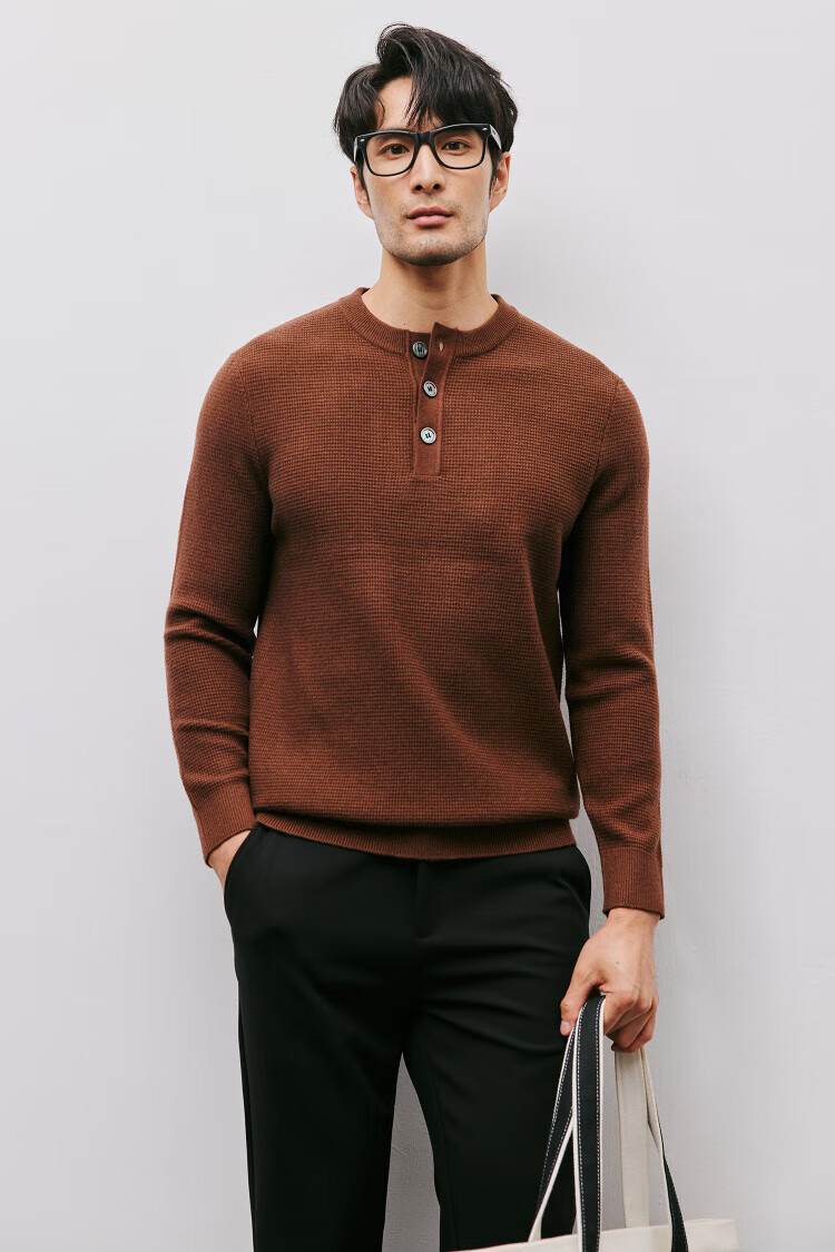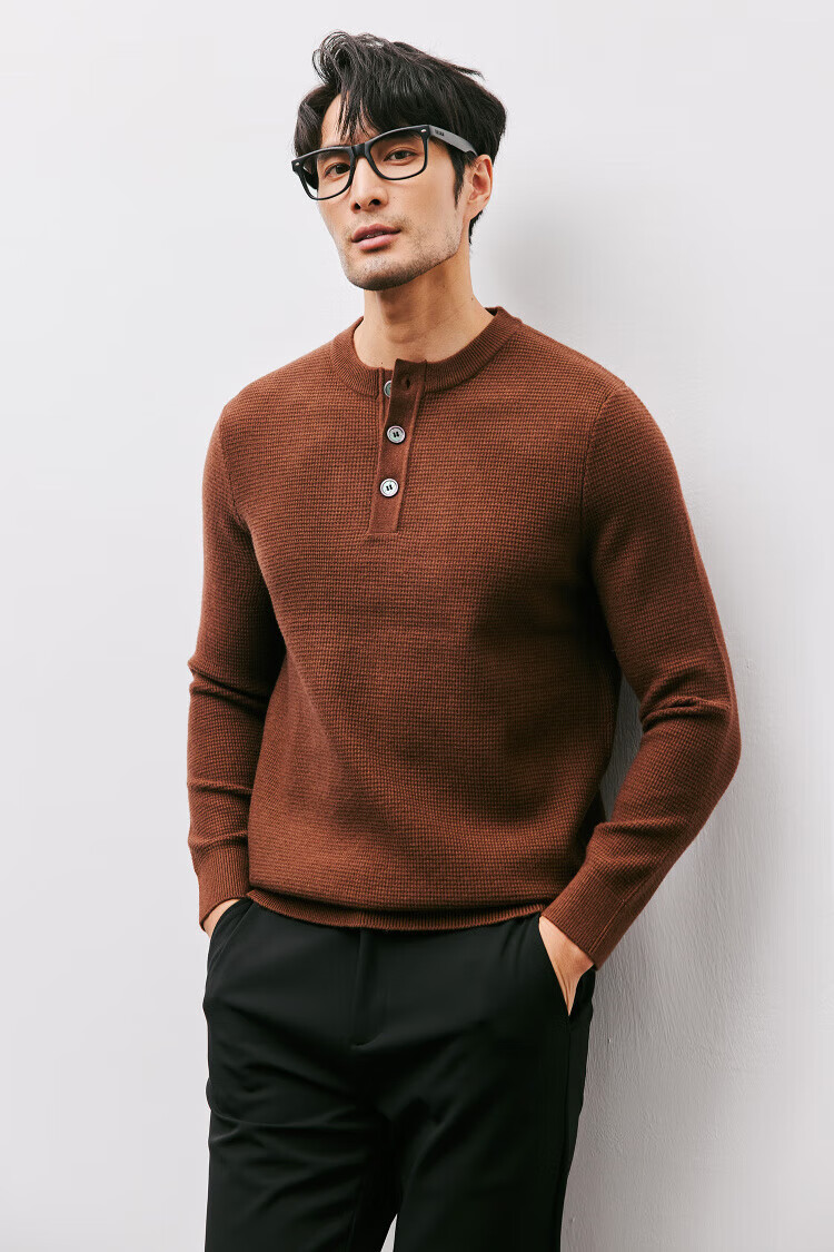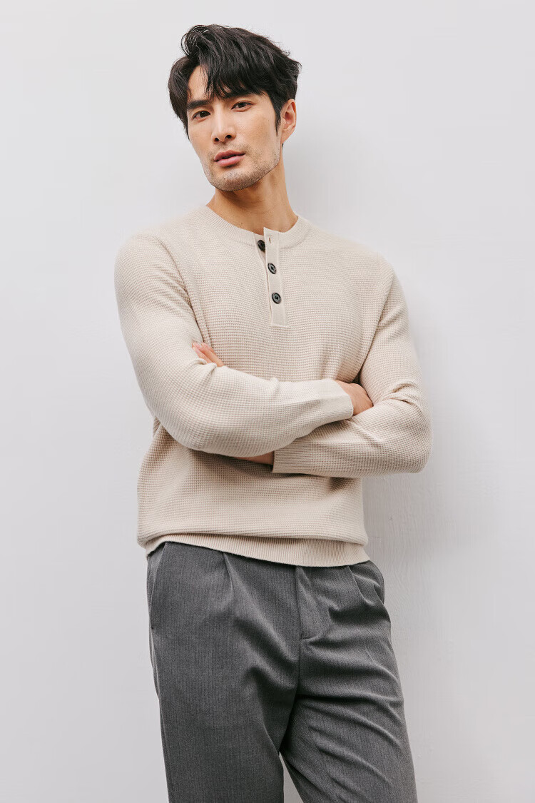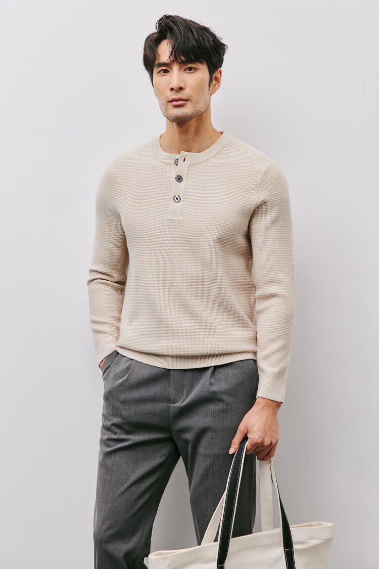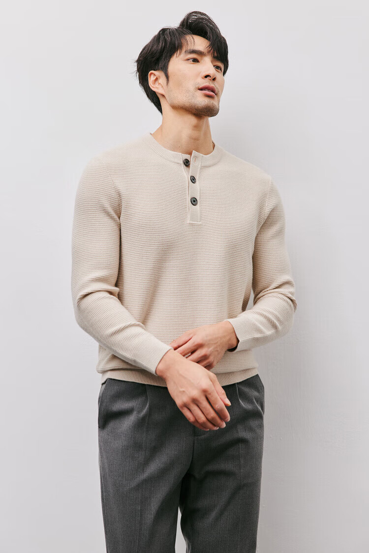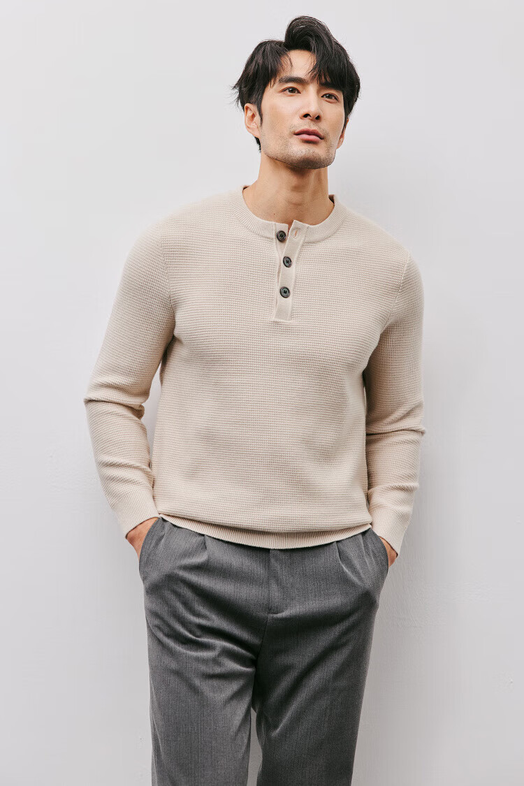 ONEDEW sweater men's spring and autumn new business casual slim henley collar long-sleeved sweater solid color wool sweater apricot M