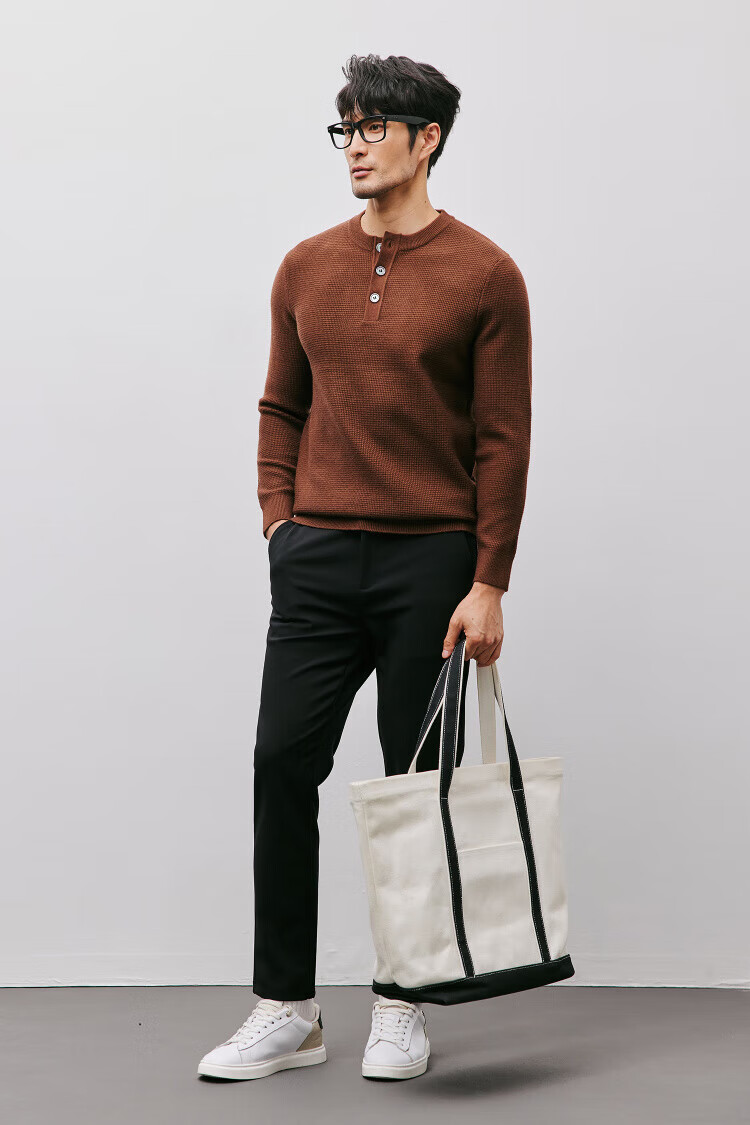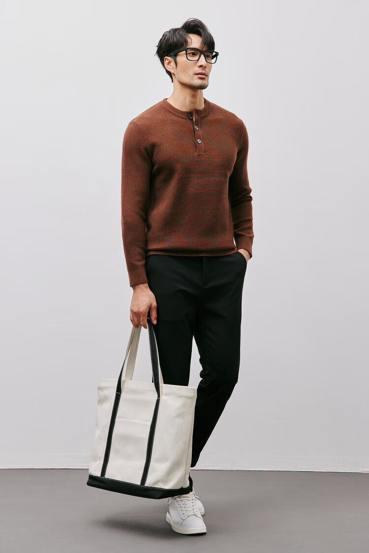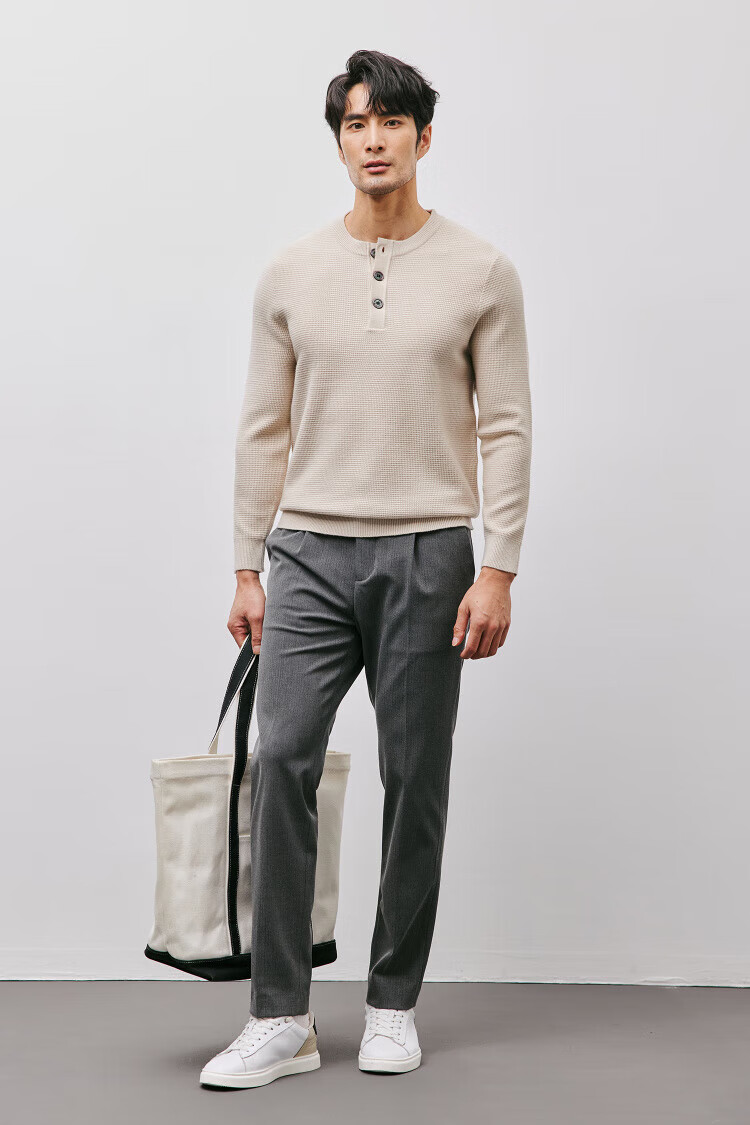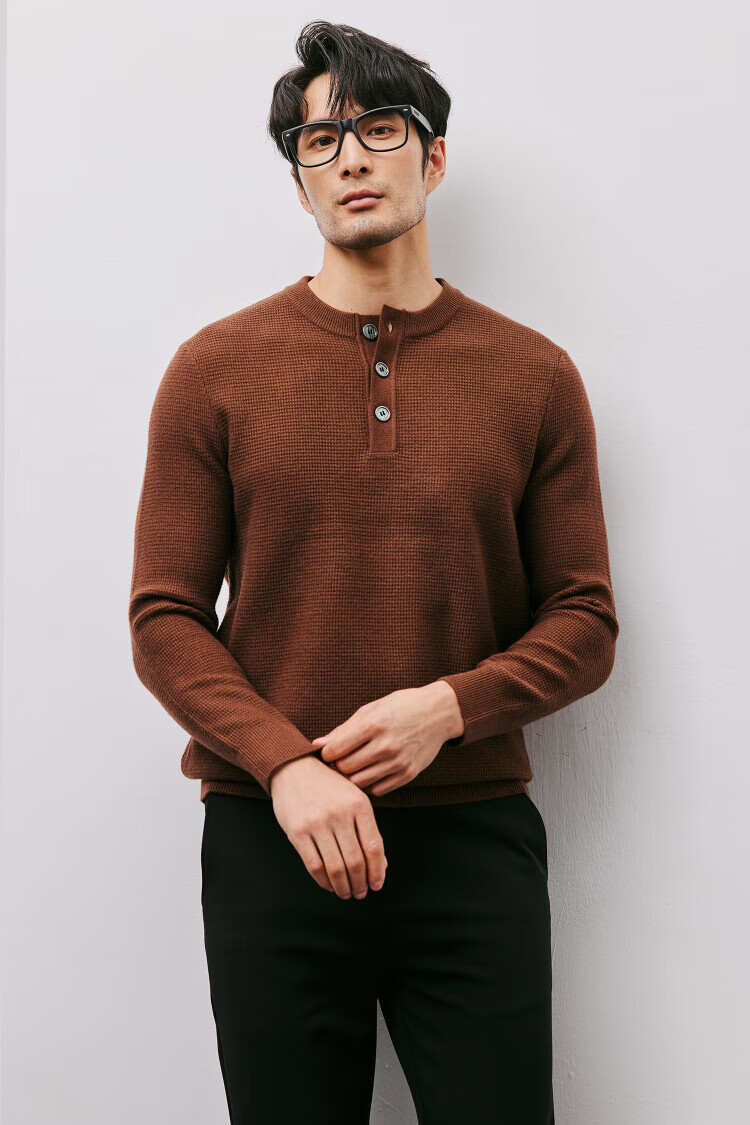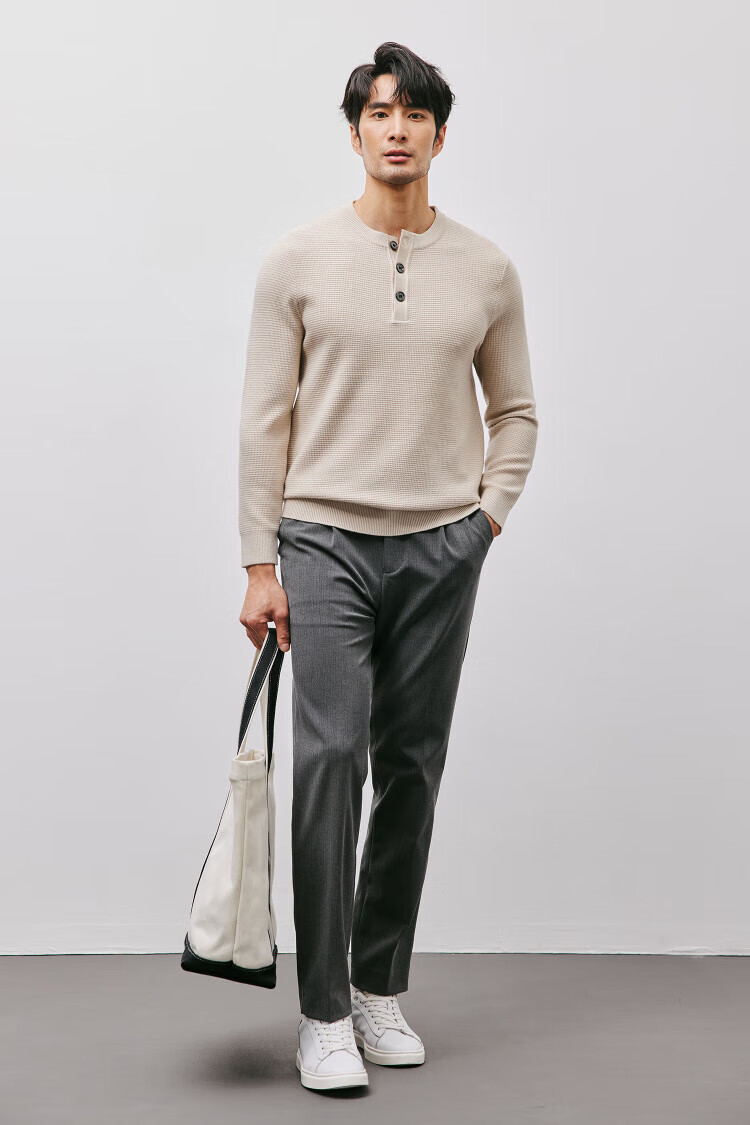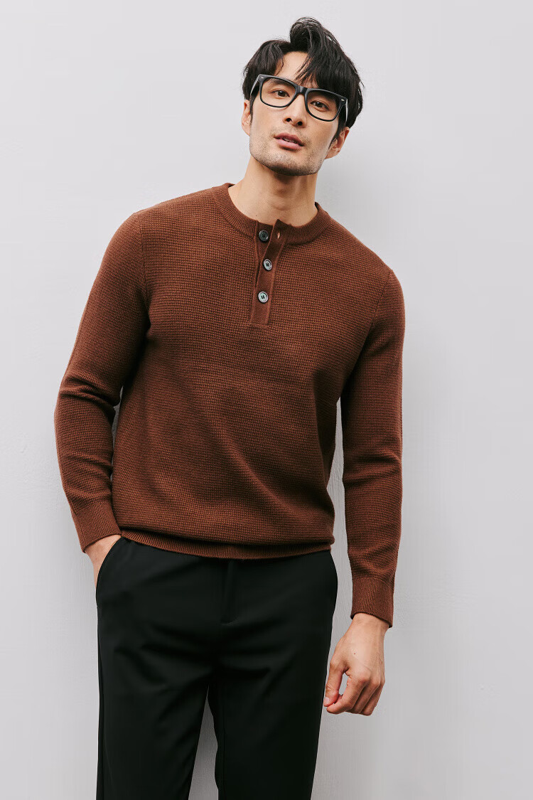 ONEDEW sweater men's spring and autumn new business casual slim henley collar long-sleeved sweater solid color wool sweater apricot M