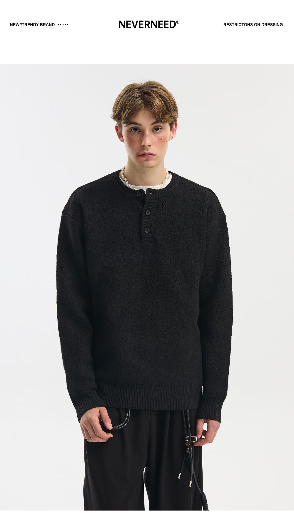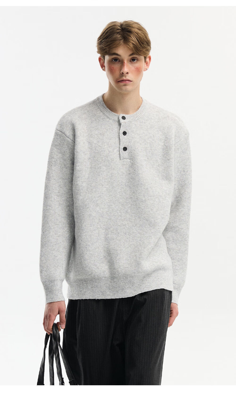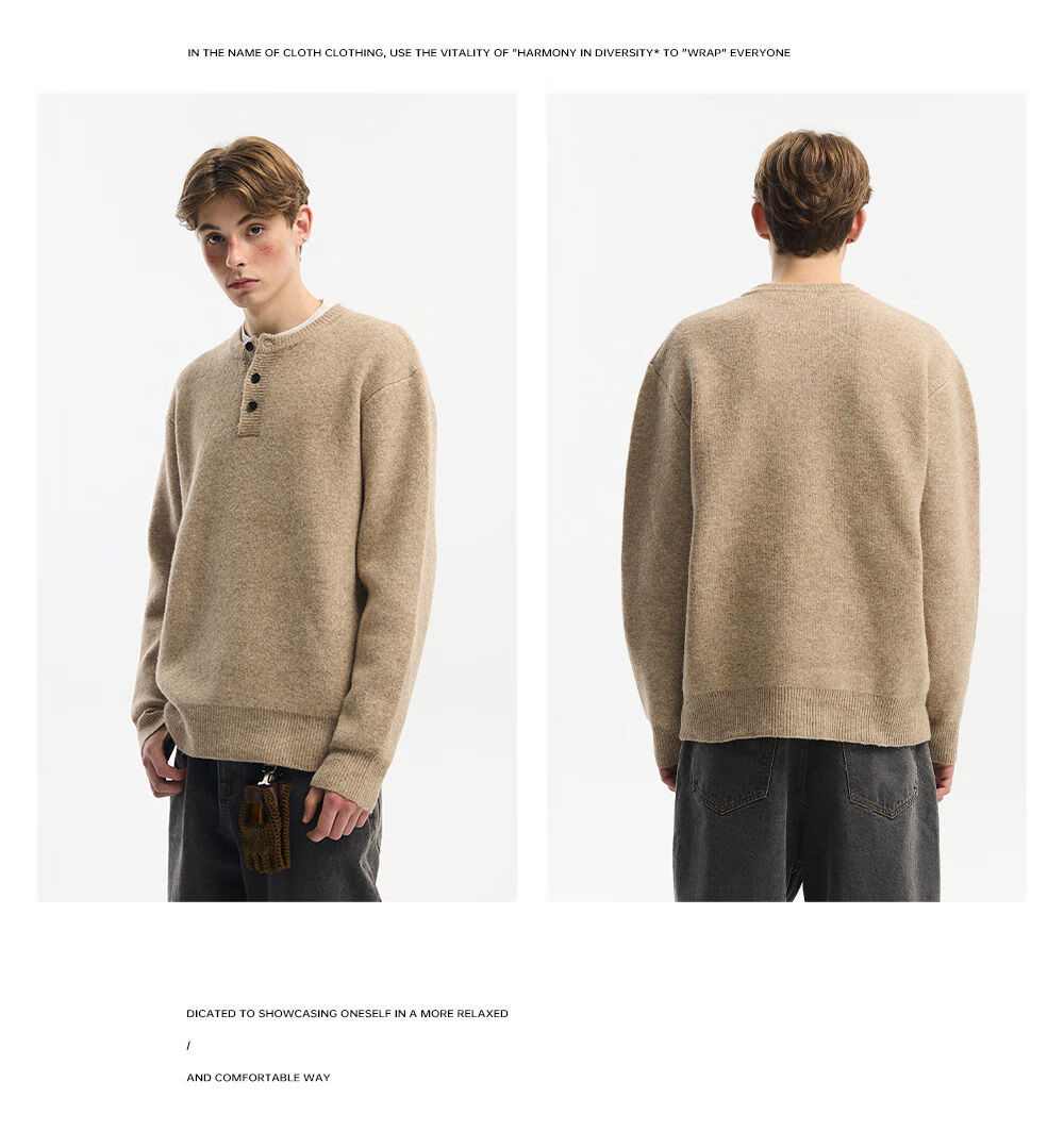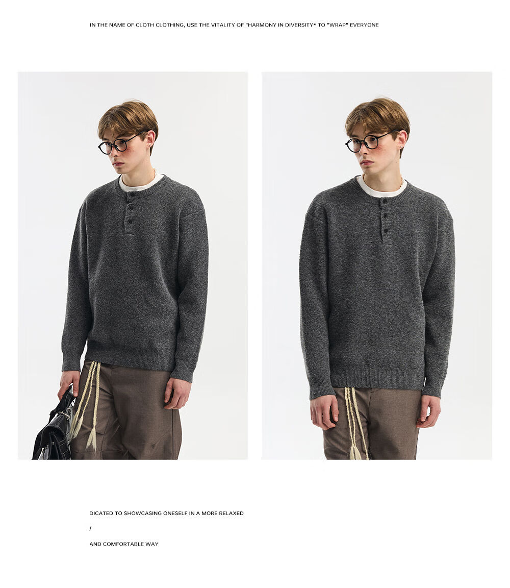 NEVERNEED Henry collar pullover men's autumn and winter American lazy style sheep wool sweater jacket light gray M M