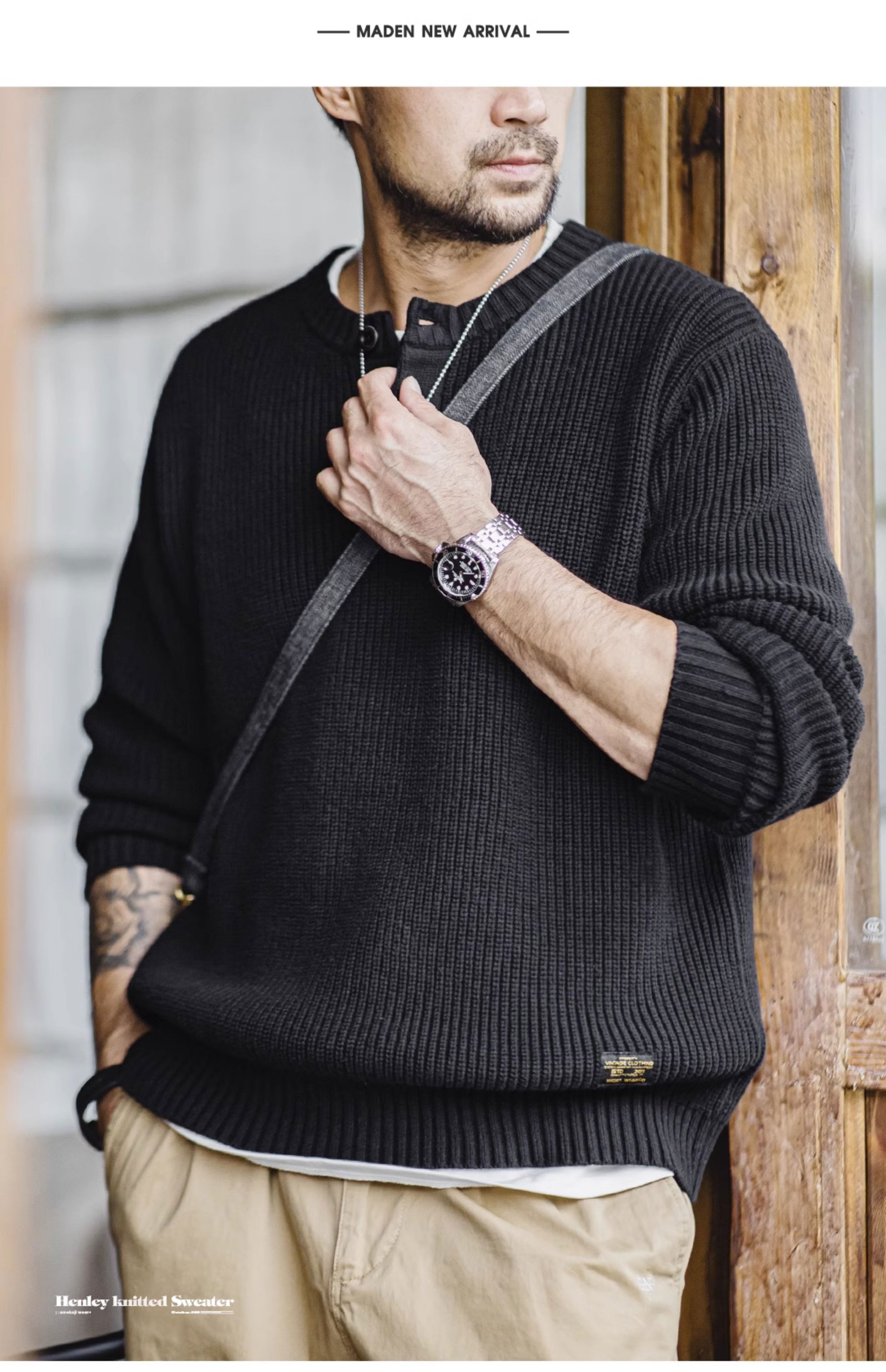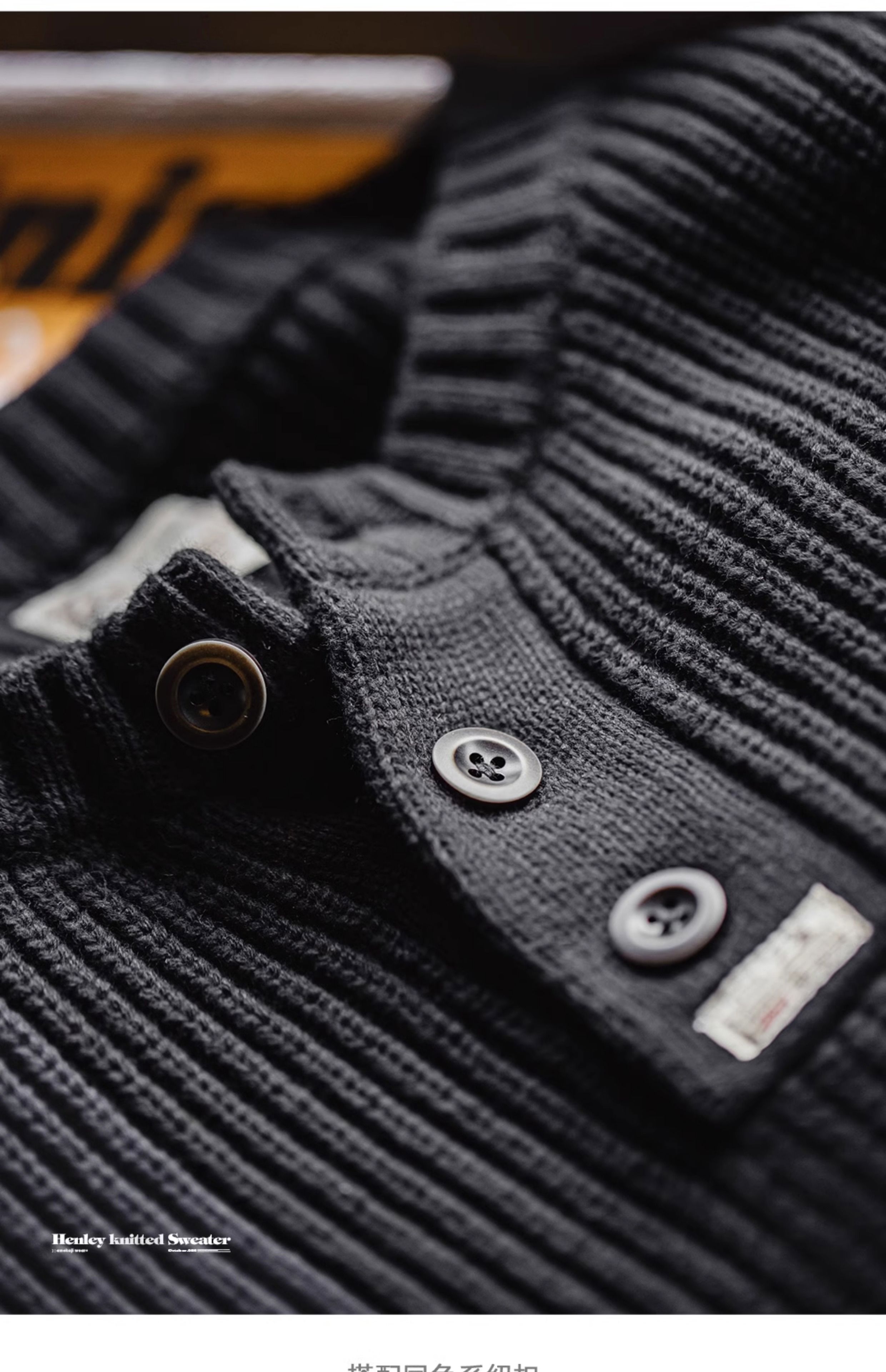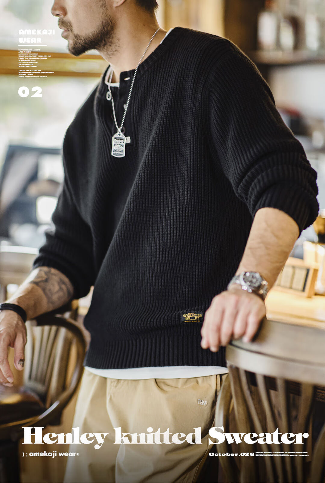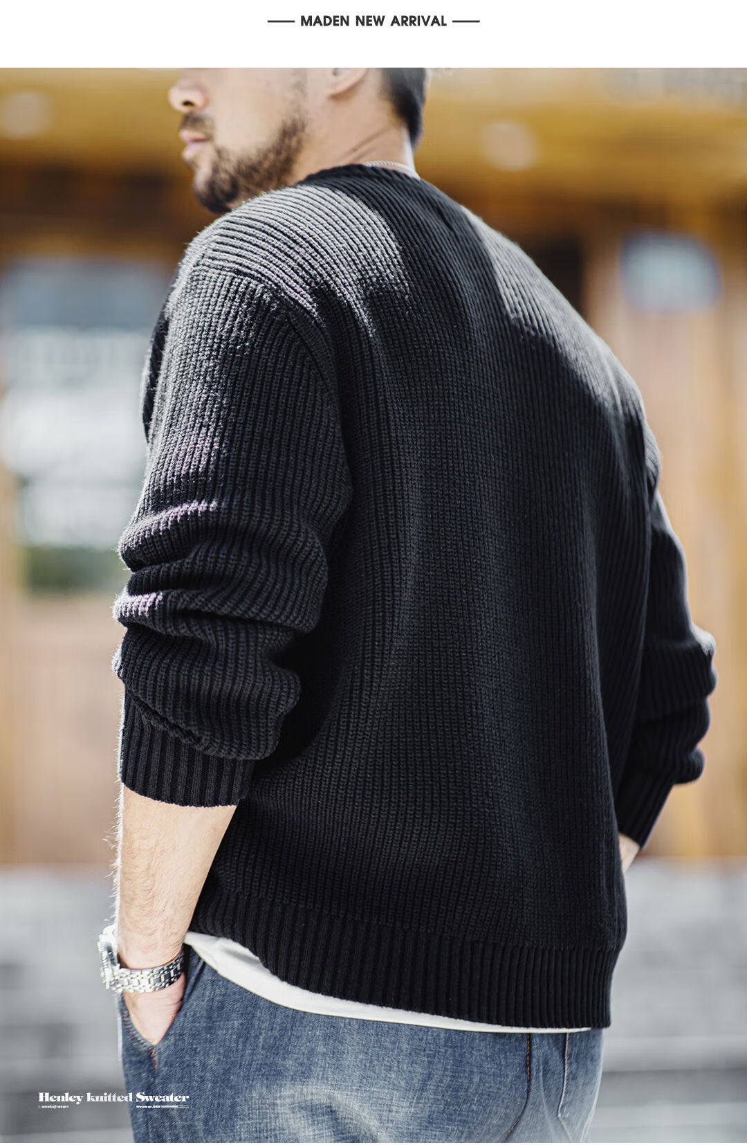 Workwear American retro vertical striped Henry collar sweater loose thickened black bottoming sweater for men autumn and winter black M M
