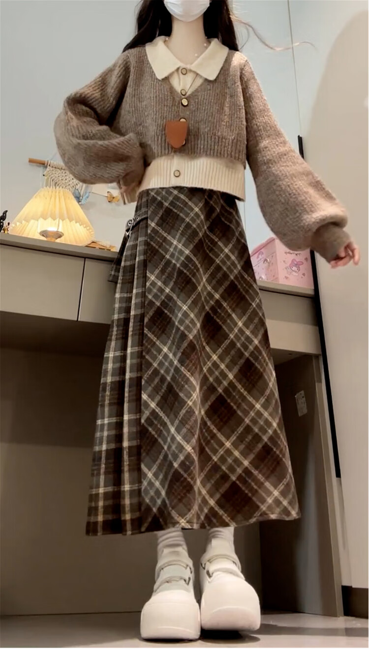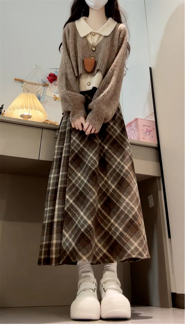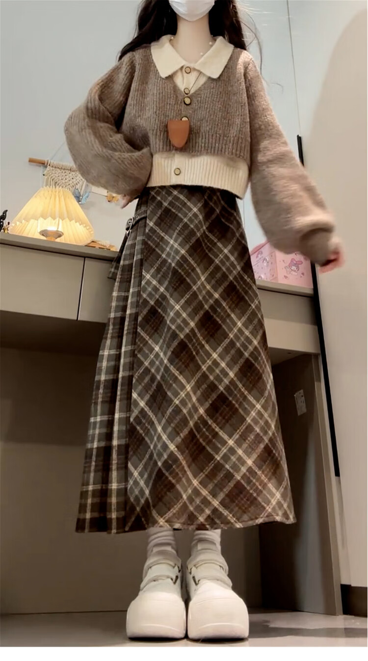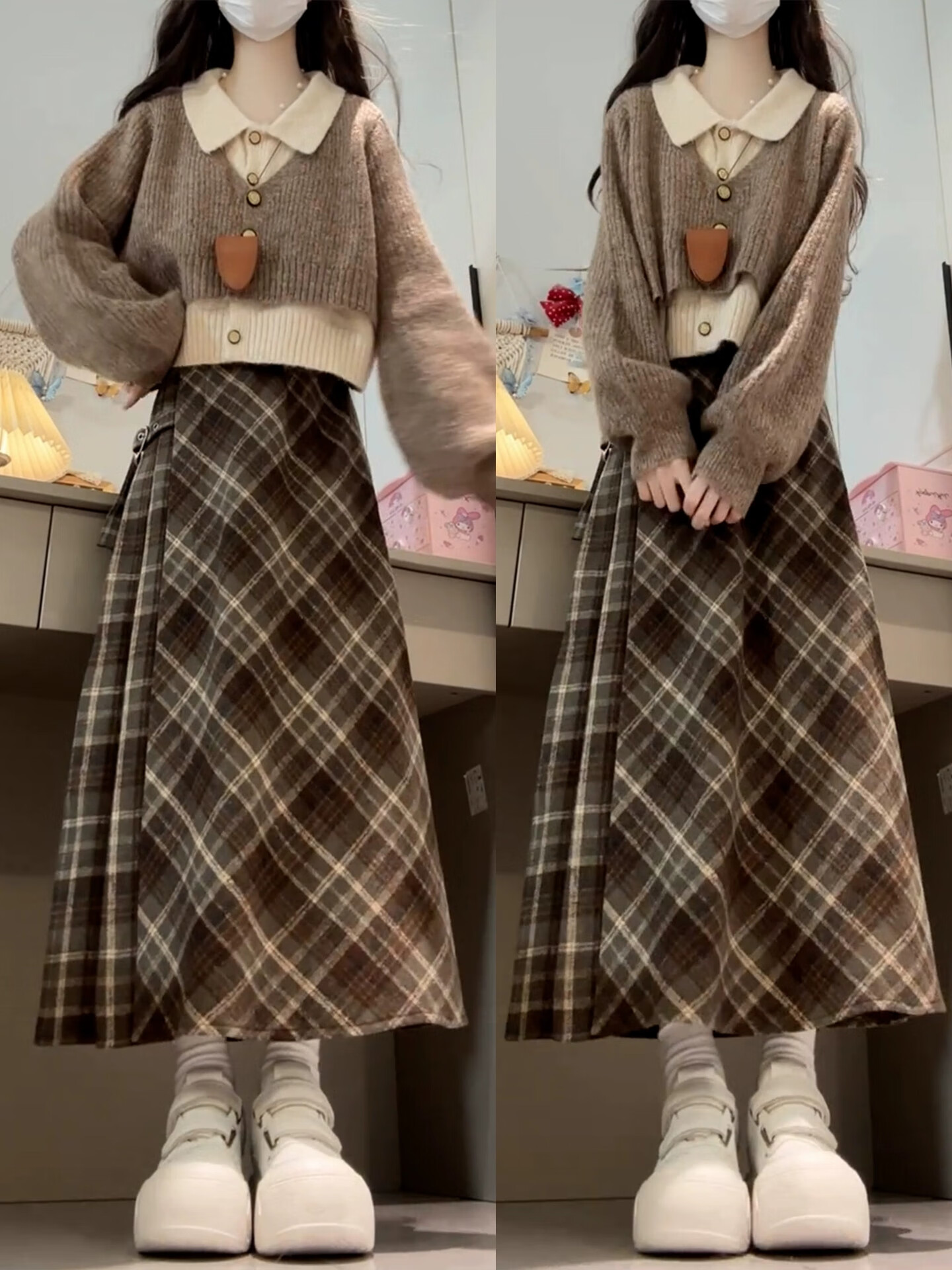 Maili Dress Women's Autumn and Winter 2025 New College Fragrance Style Complete Set Temperament Knitted Sweater Skirt Fake Two-piece Top + Skirt M