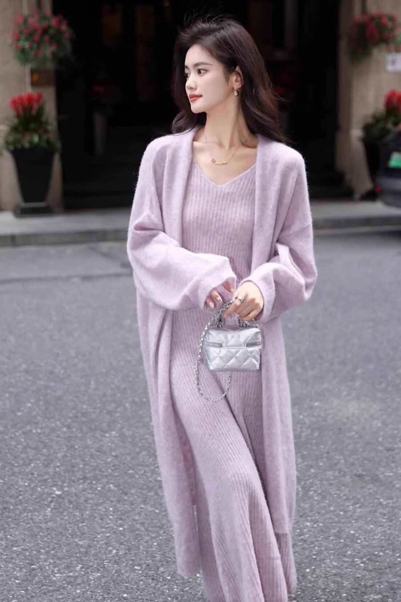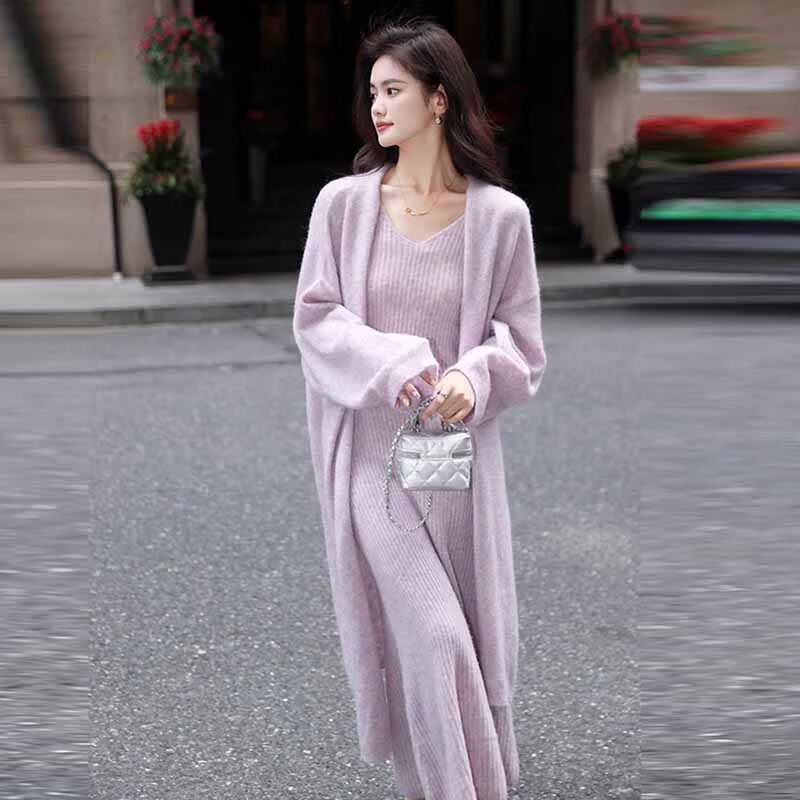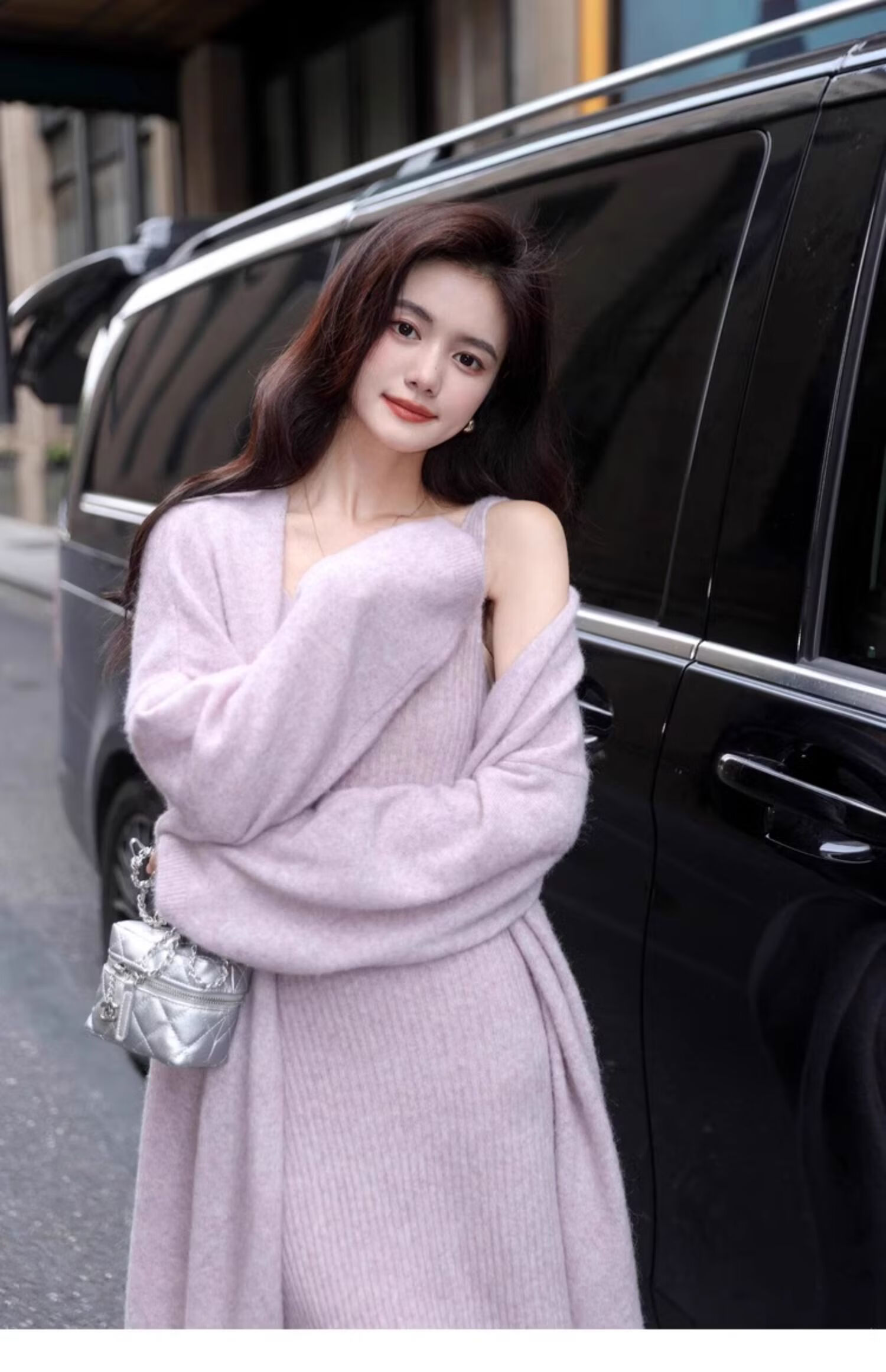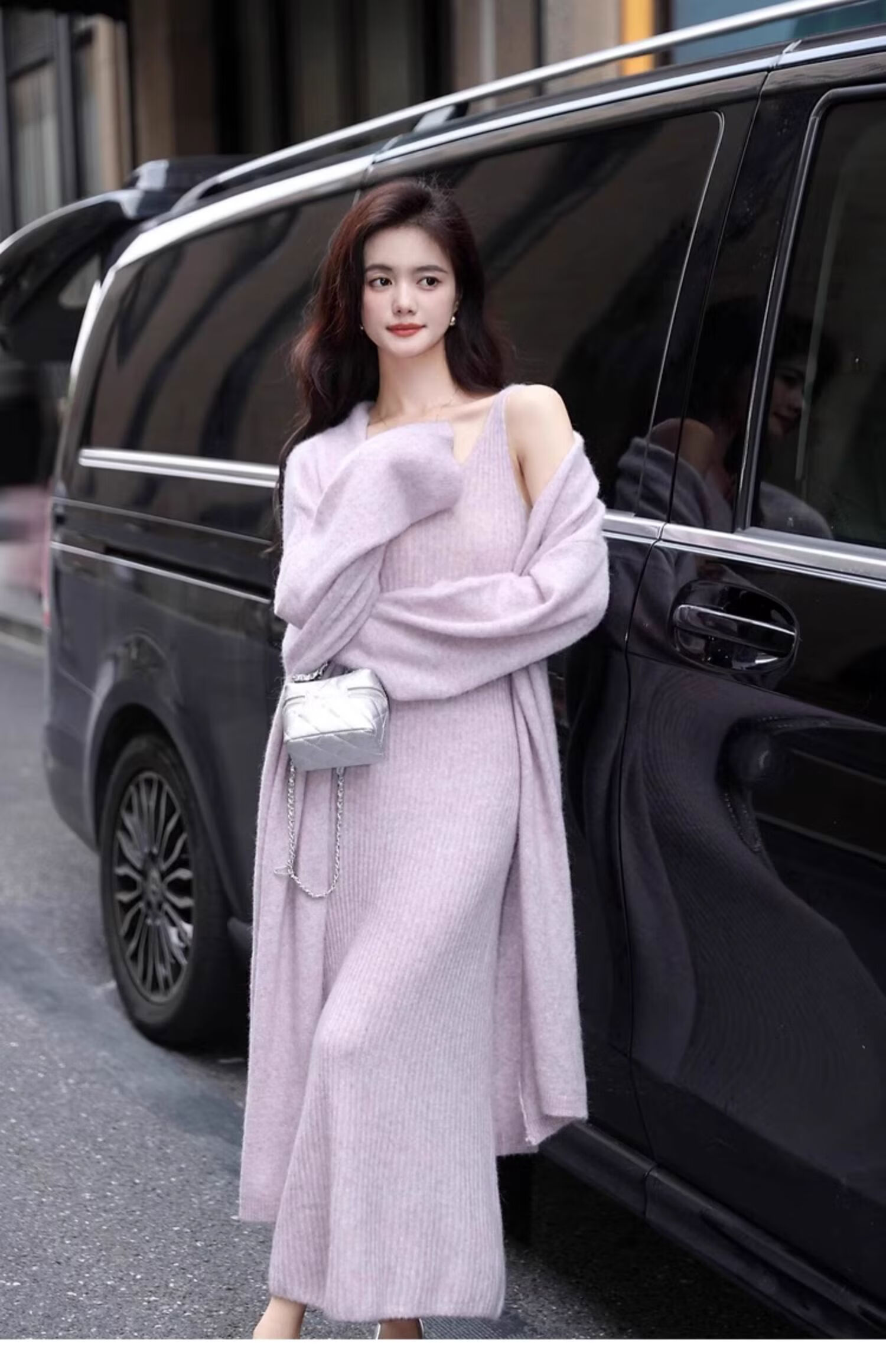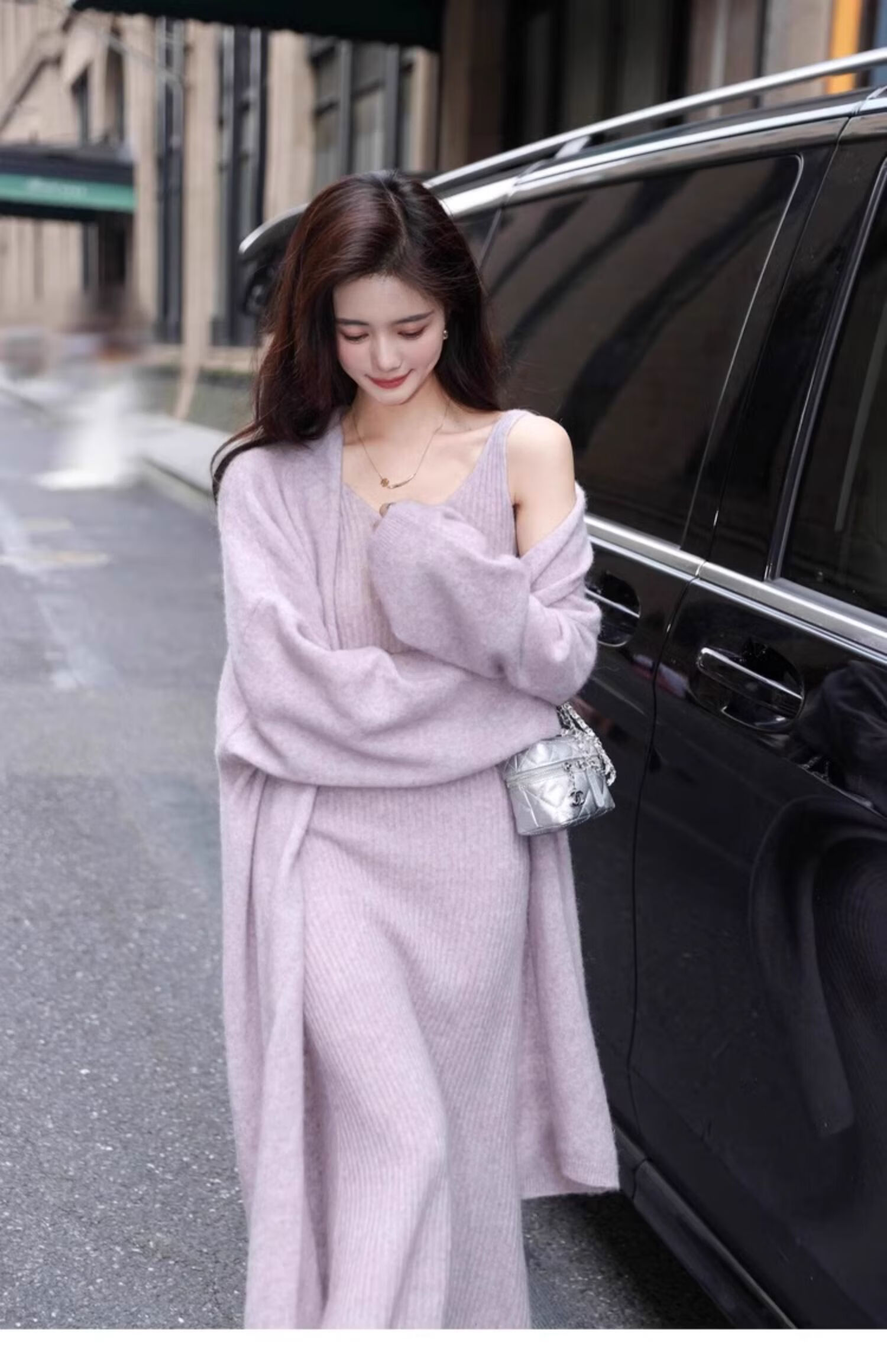 French gentle style style sweater knitted dress suit spring and autumn cardigan suspender long skirt two-piece set for women purple factory straight hair S S recommended 80Jin Jin equals 0.5kg -95Jin Jin equals 0.5kg