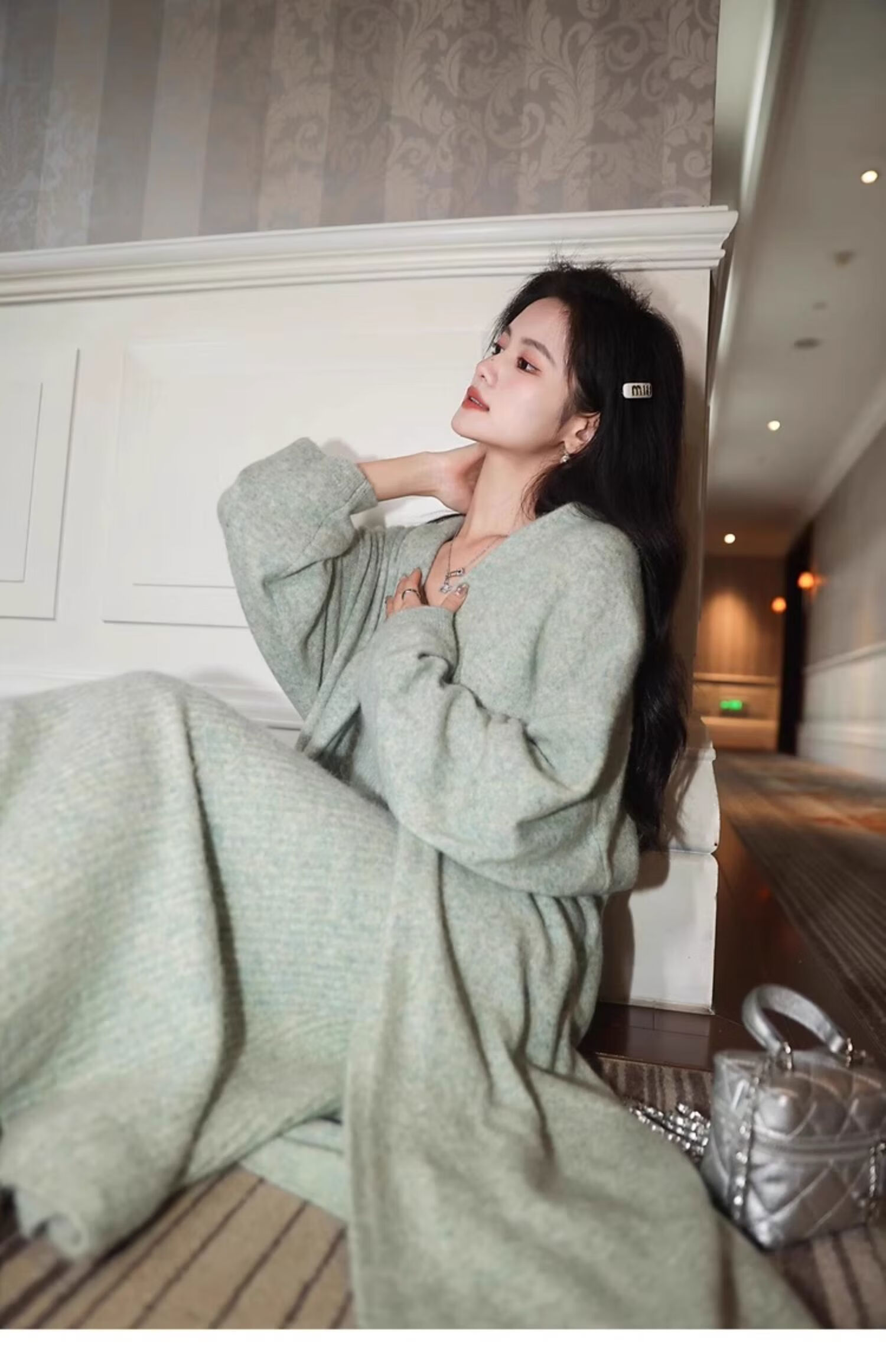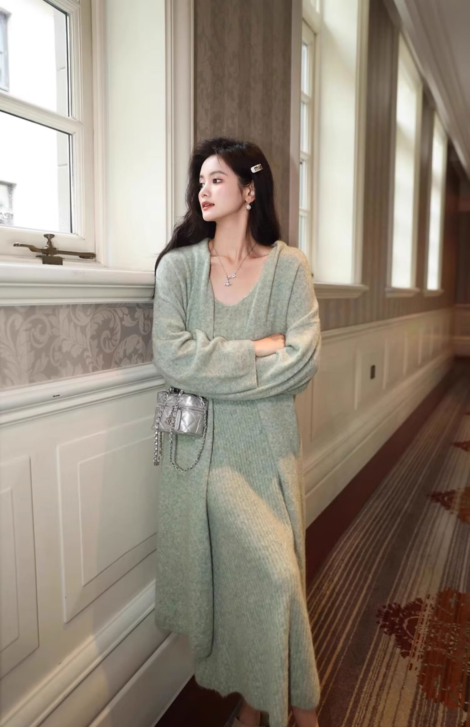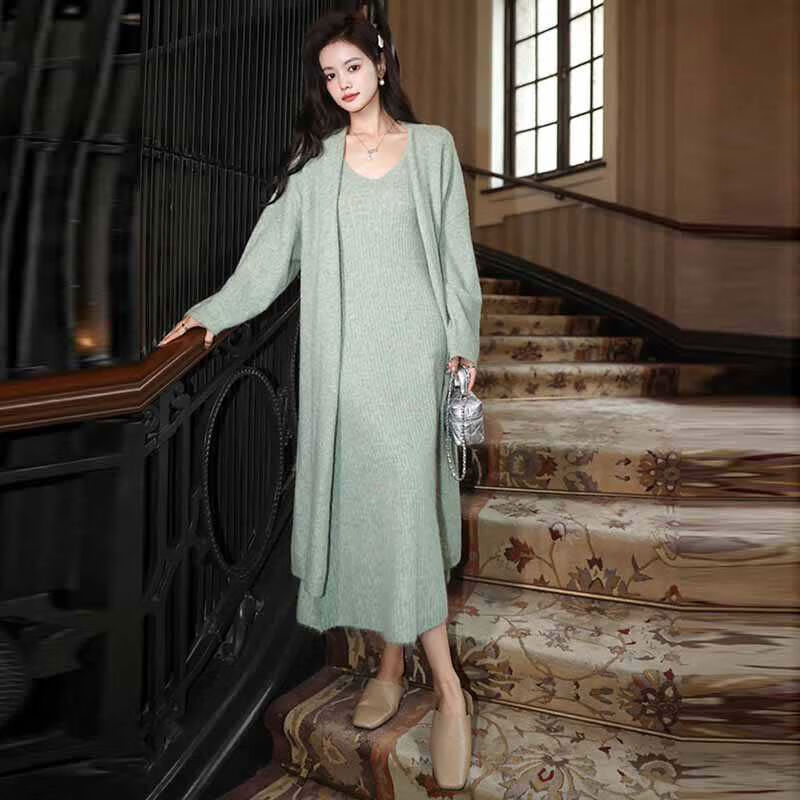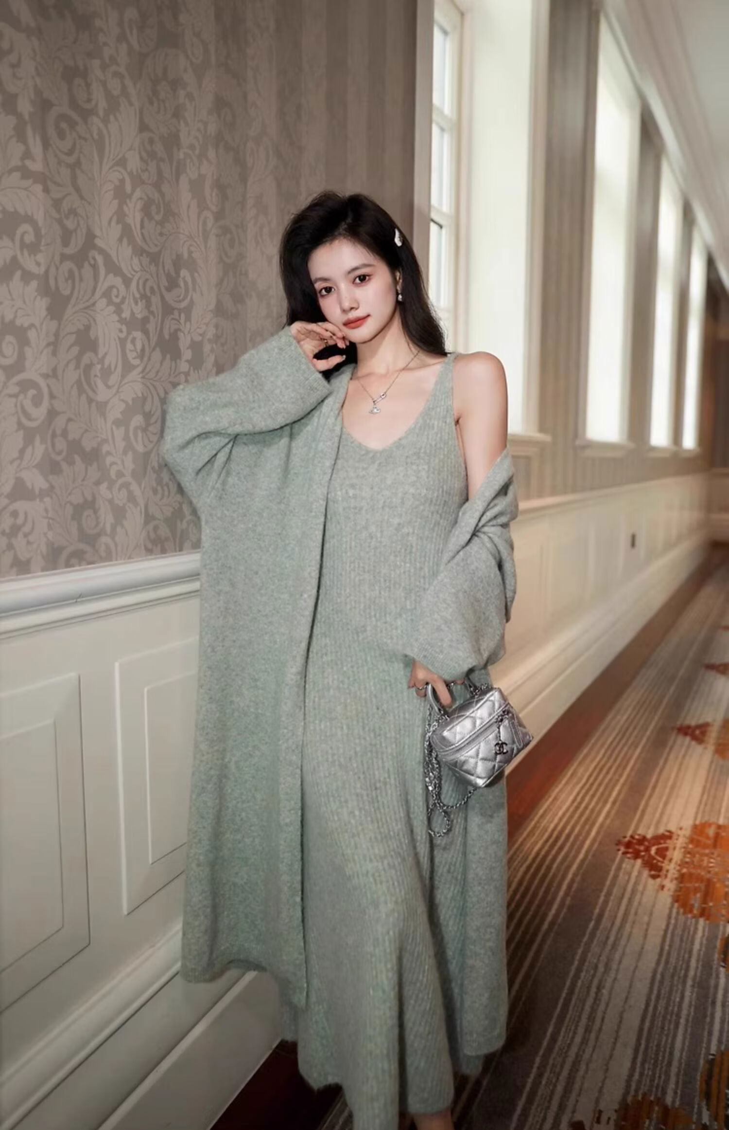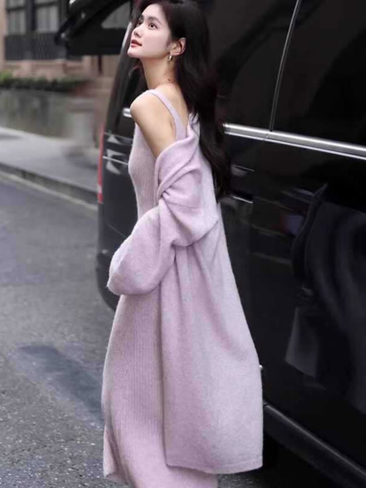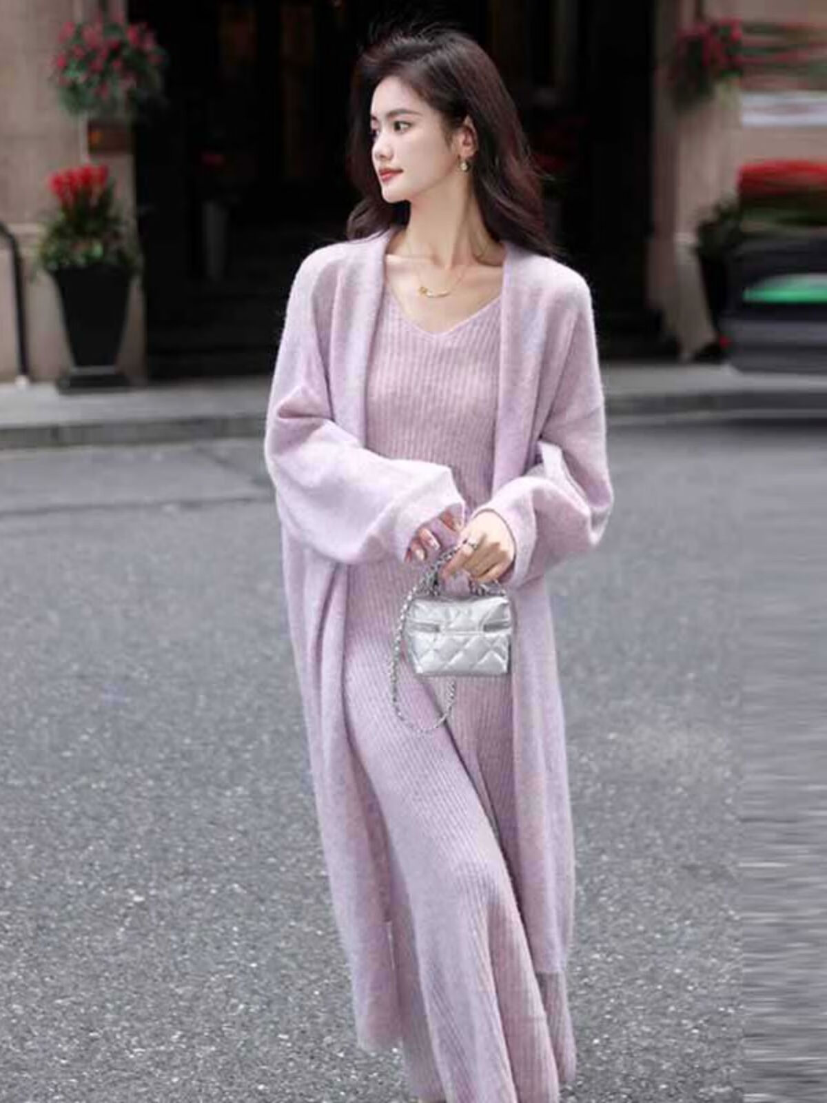 French gentle style style sweater knitted dress suit spring and autumn cardigan suspender long skirt two-piece set for women purple factory straight hair S S recommended 80Jin Jin equals 0.5kg -95Jin Jin equals 0.5kg
