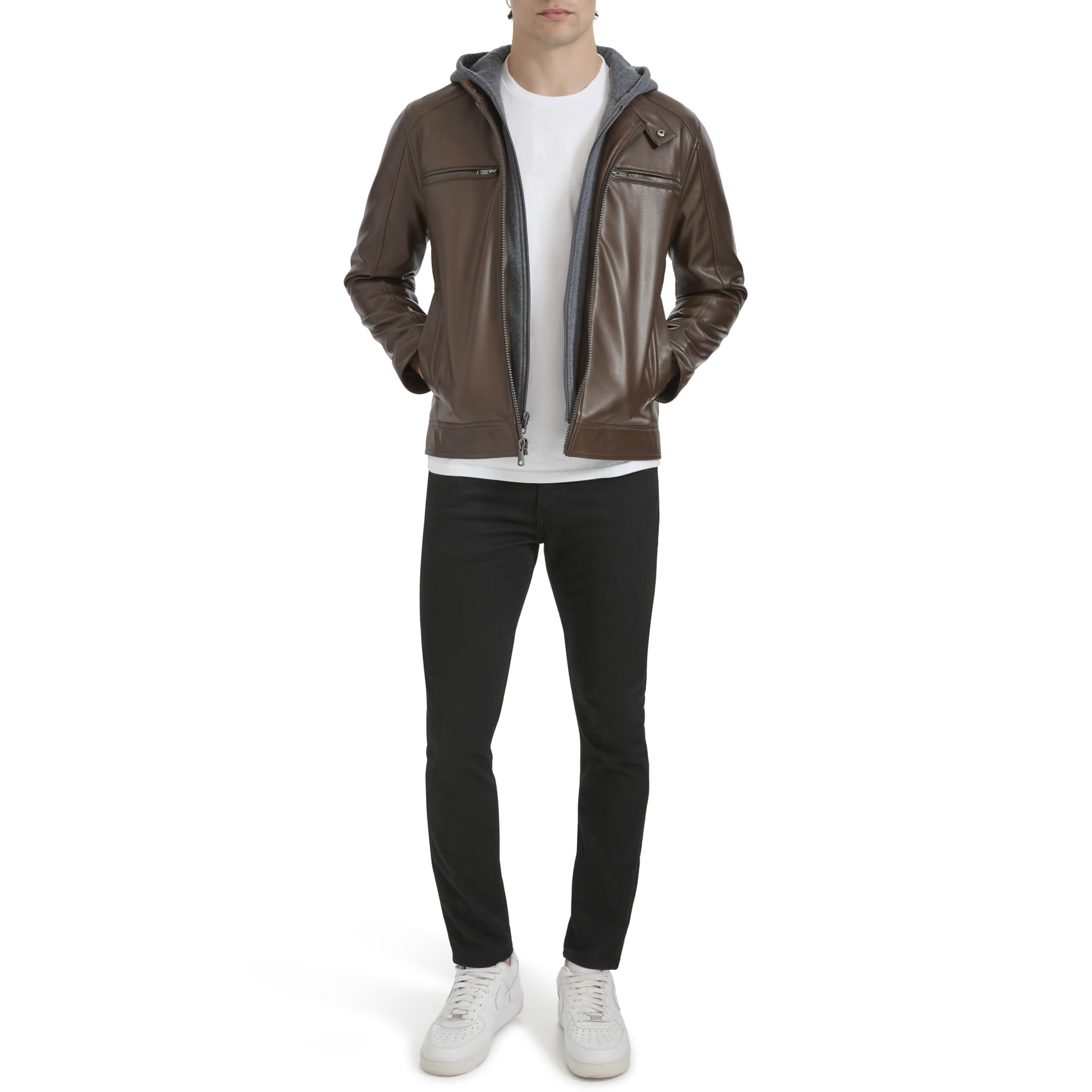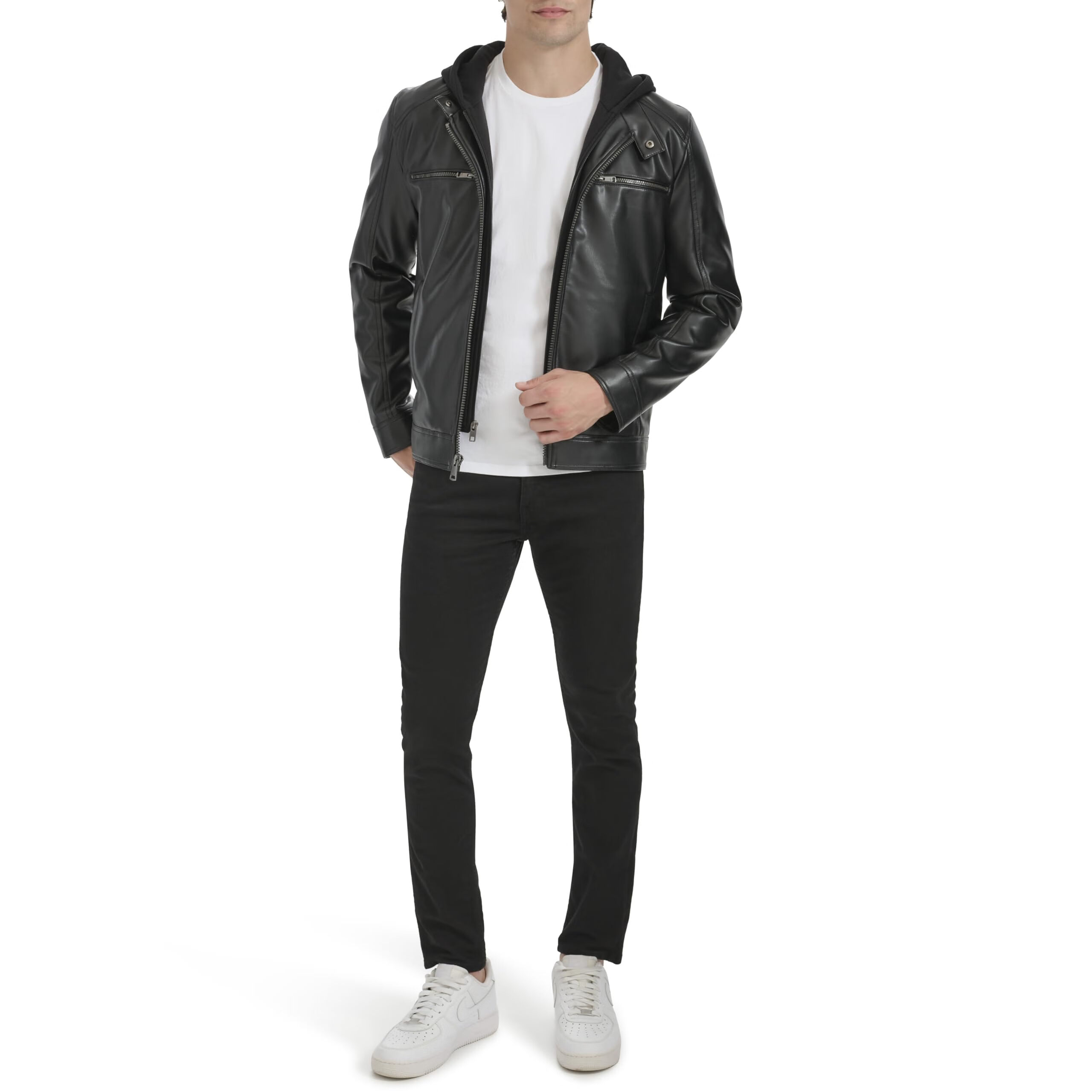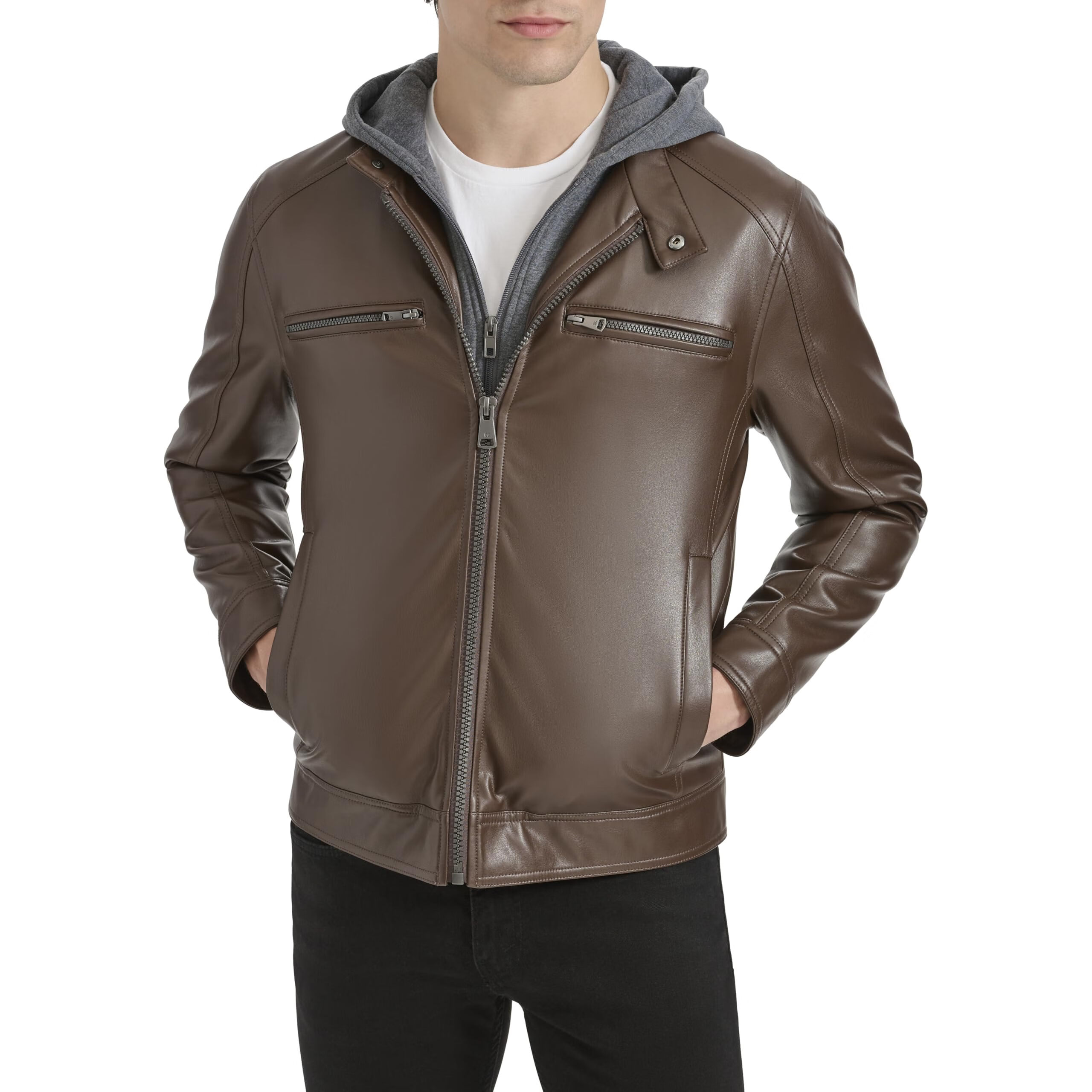 KENNETH COLE 男式人造皮革机车 带针织连帽 黑色 Medium