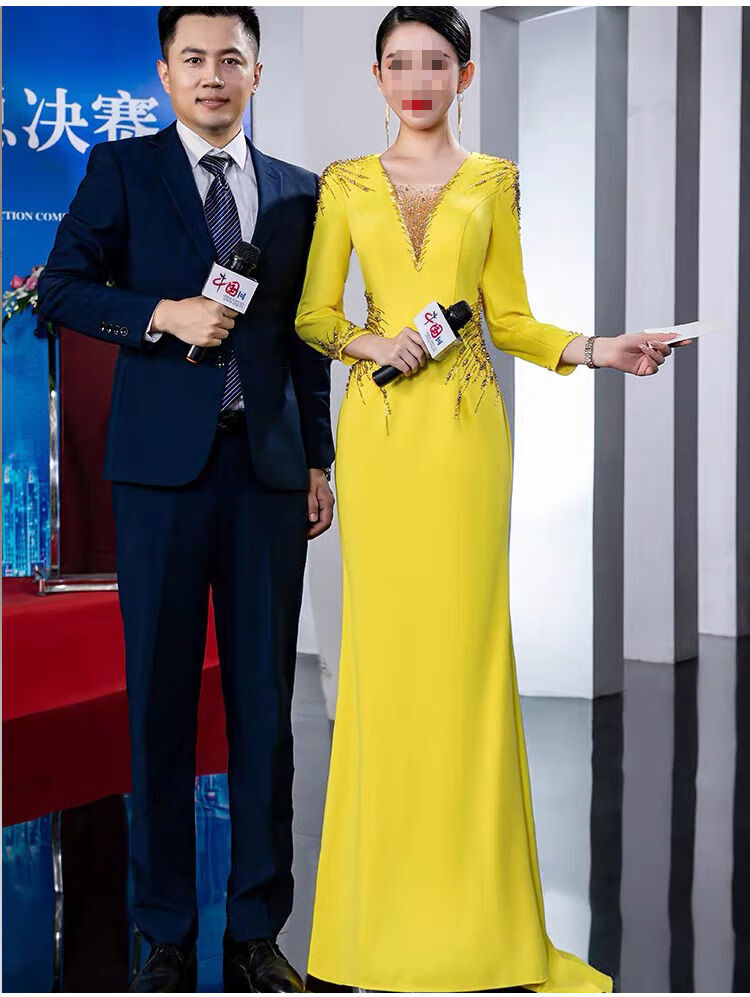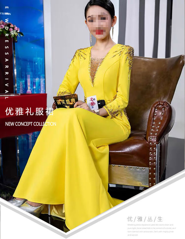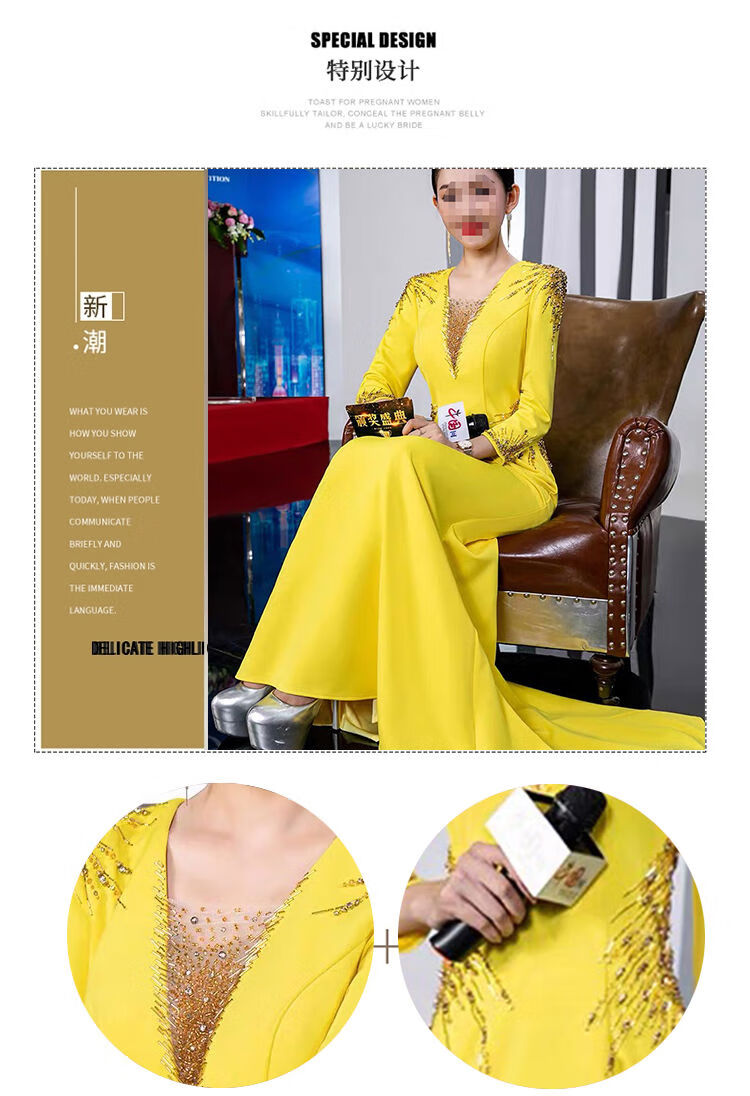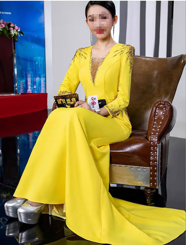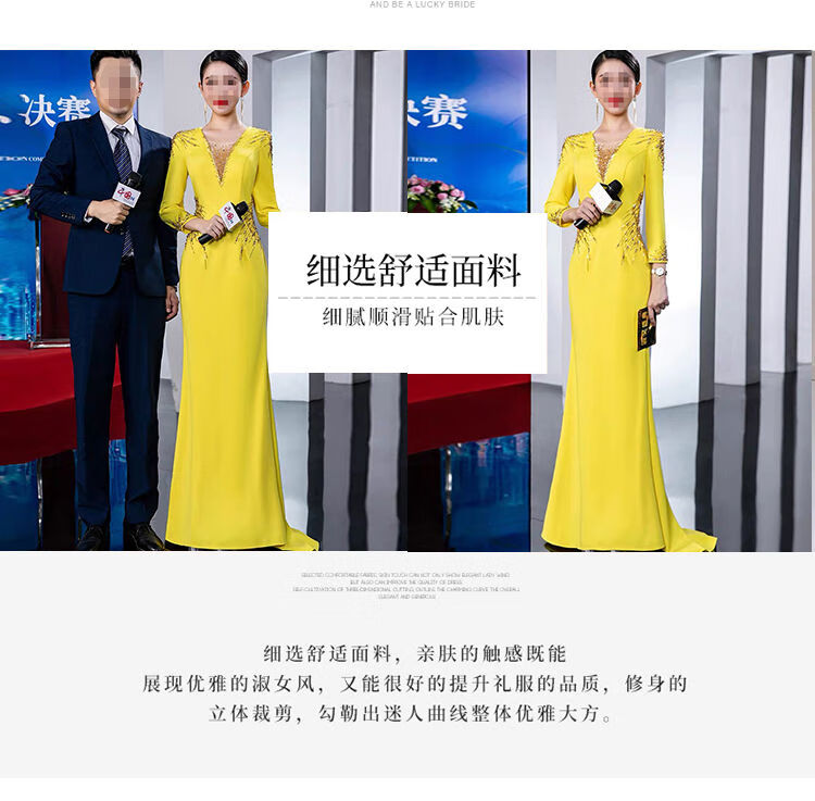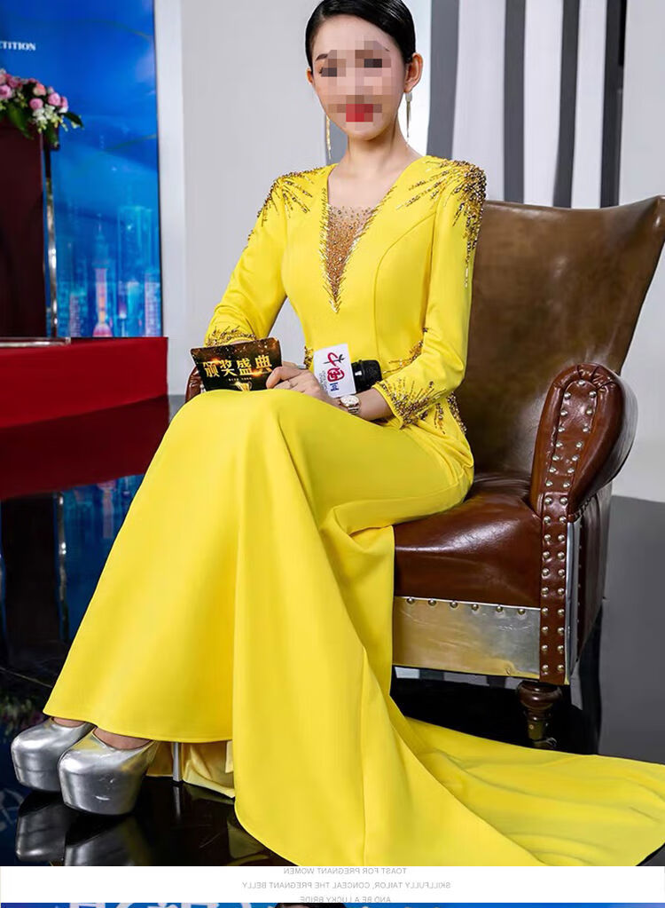 Banquet Evening Dress 2025 New High-end Light Luxury Niche Host Temperament Performance Clothes Long Version Women Yellow 3XL 3XL