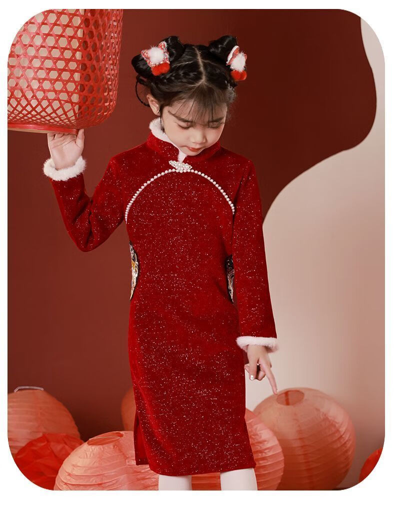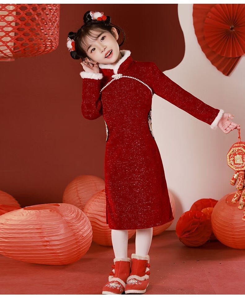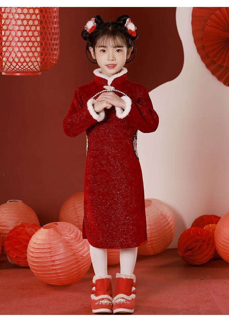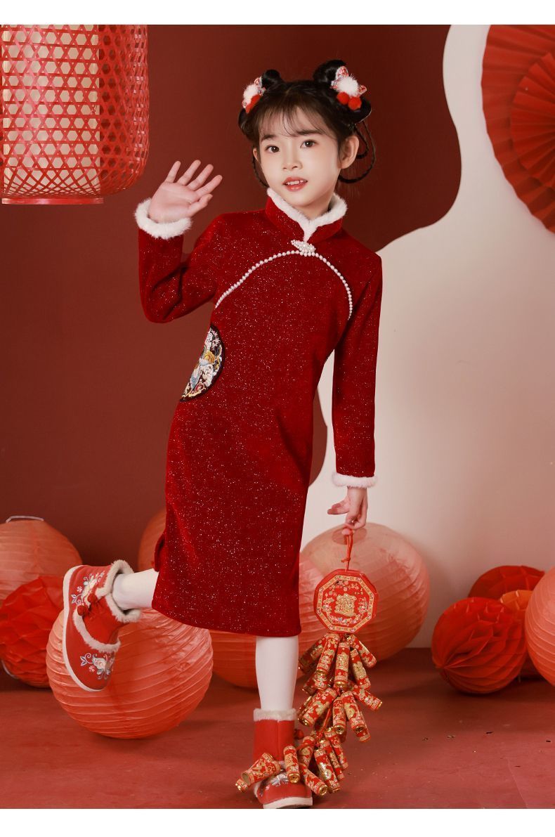 G.duck children's winter cheongsam for New Year's greetings thickened Chinese style plus velvet Chinese style red New Year's dress dress for girls red cheongsam with velvet lining inside 120