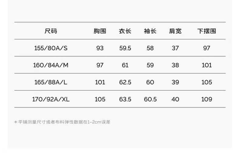 China (cm) 160-165/84-86 165-170 / 88-90 167-172 / 92-96 168-173 / 98-102 170-176 / 106-110