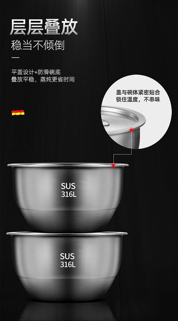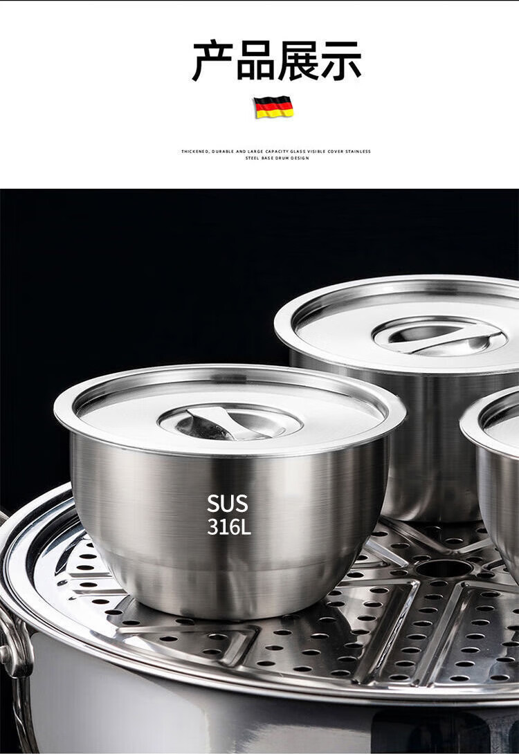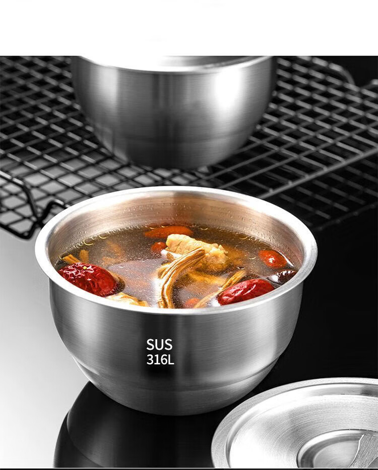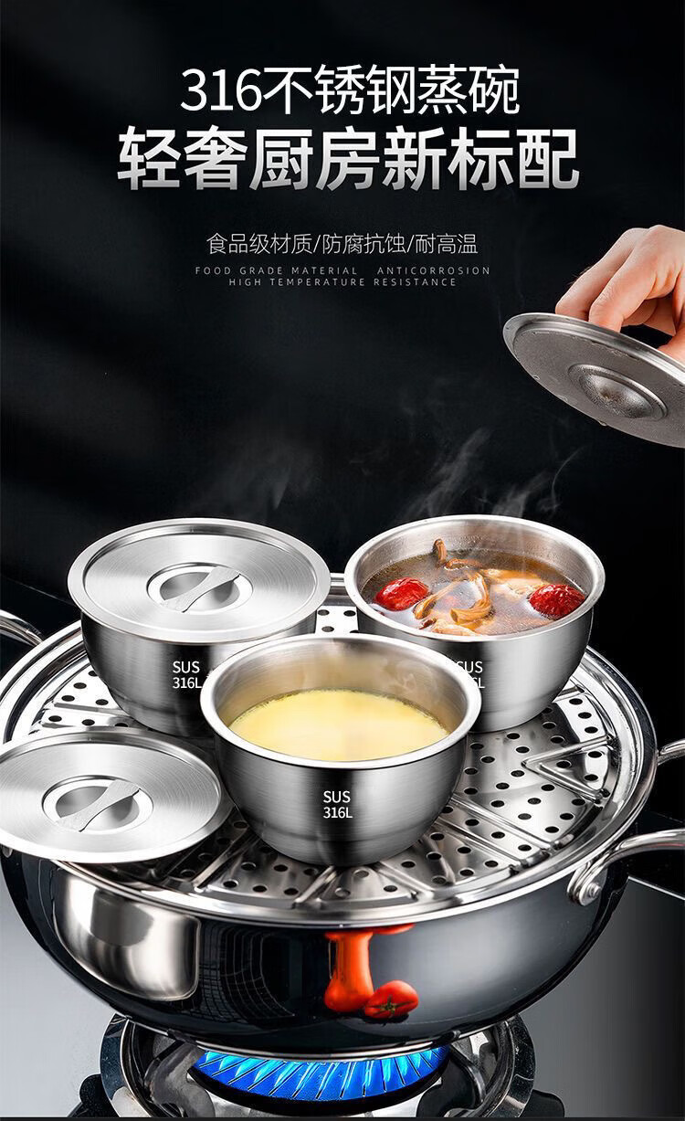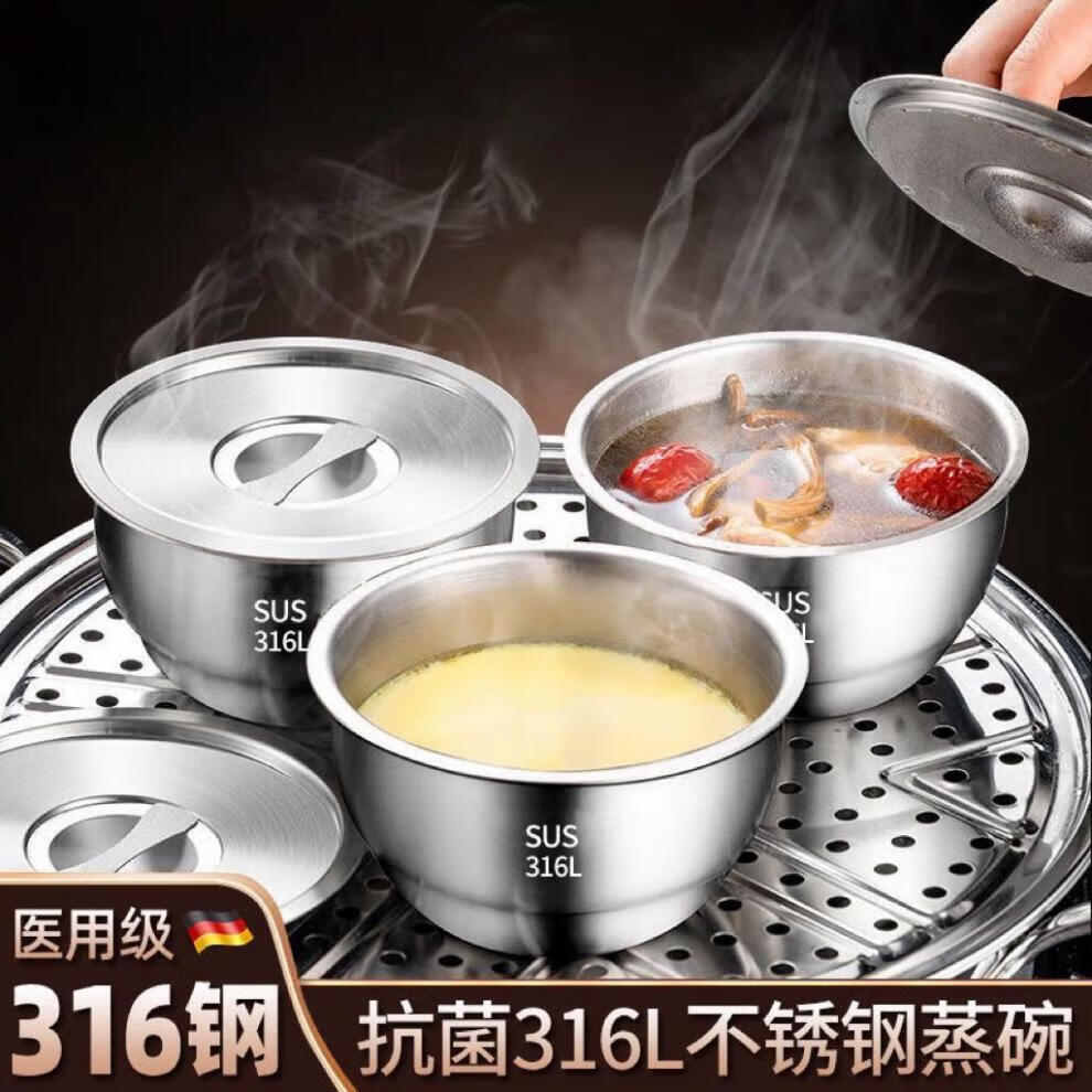 New 316 stainless steel steamed egg bowl with lid, baby stew pot, household steamed egg custard, high temperature resistant 316 extra thick round style + lid, capacity about 500 milliliters