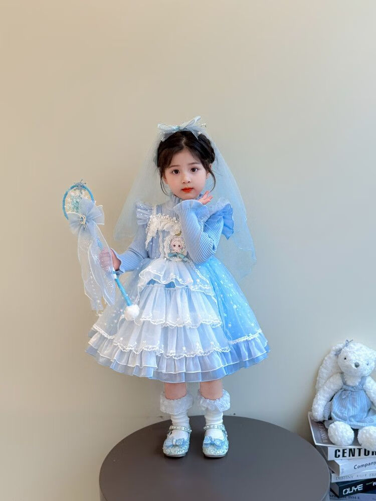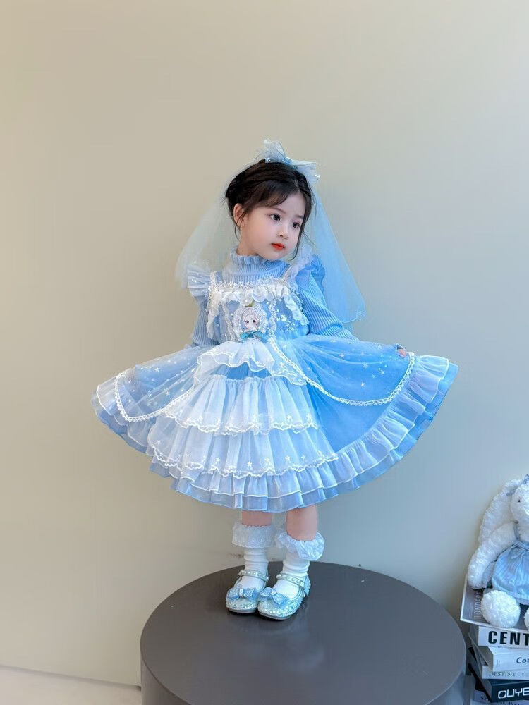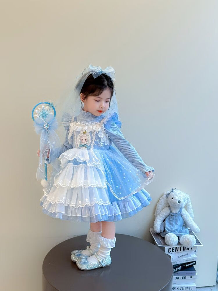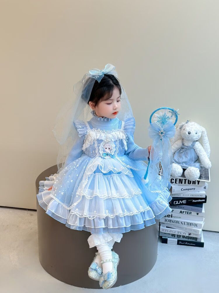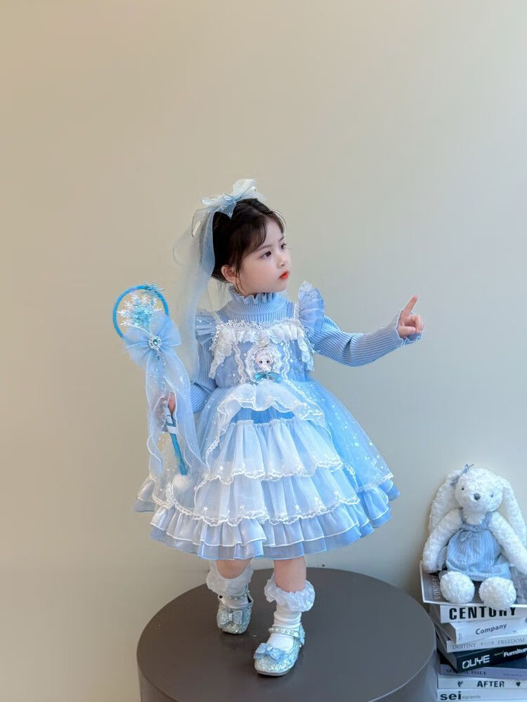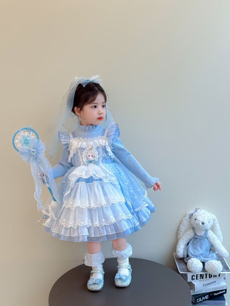 G.duck Girls Dress Set Autumn 2025 New Style Children's Lace Elsa Lolita Baby Girl Princess Dress Blue Skirt 90