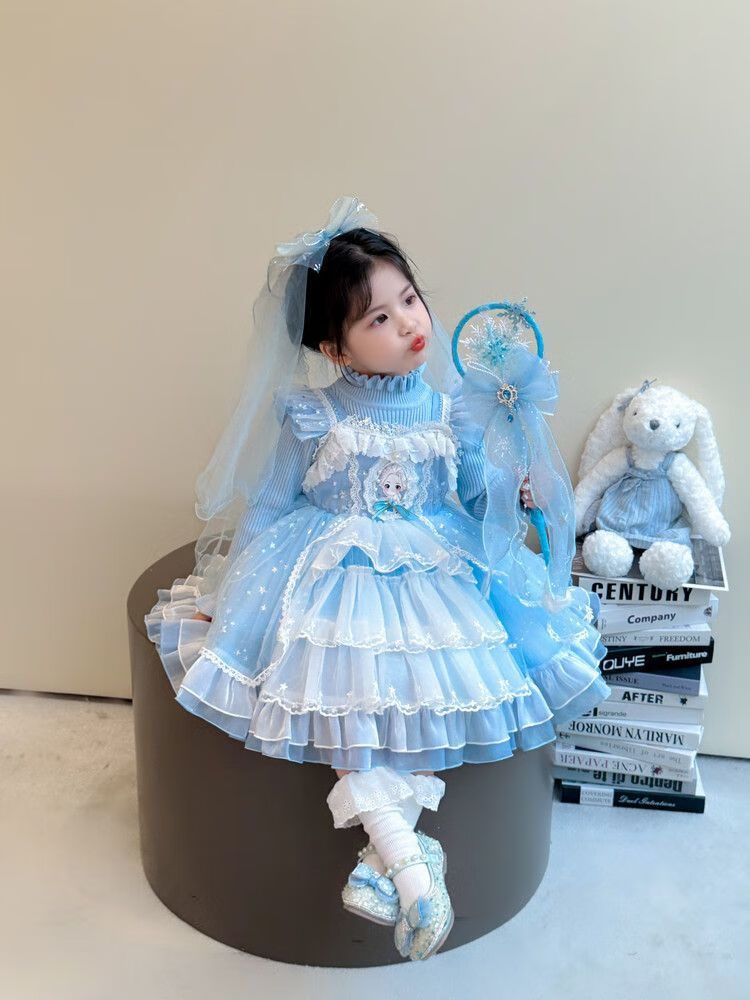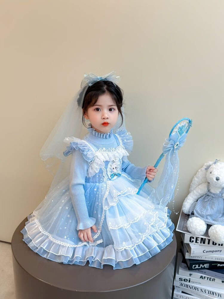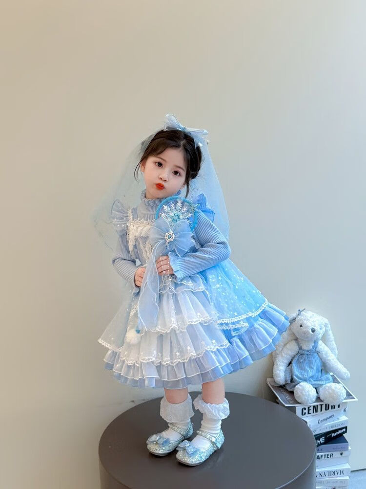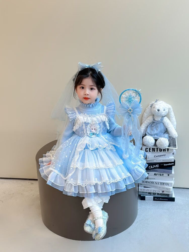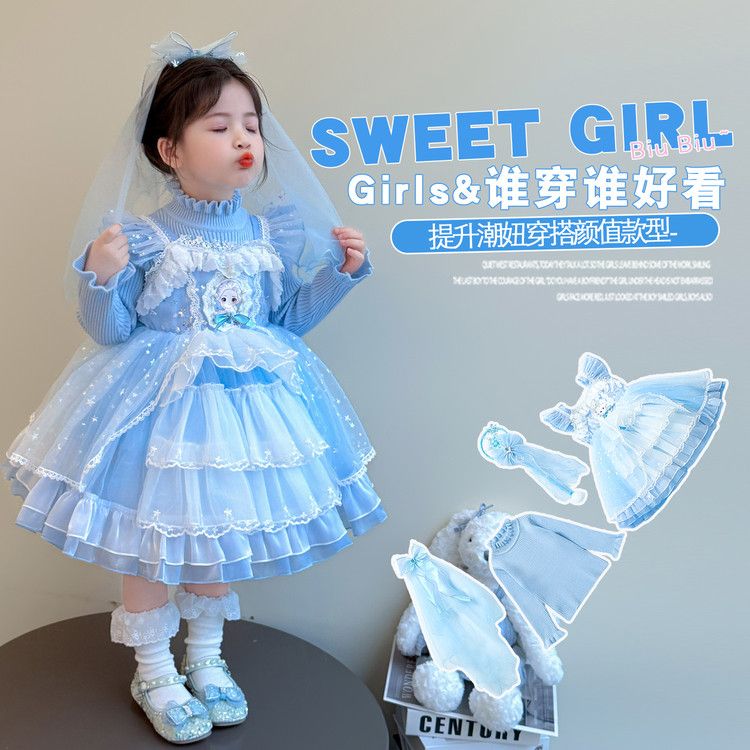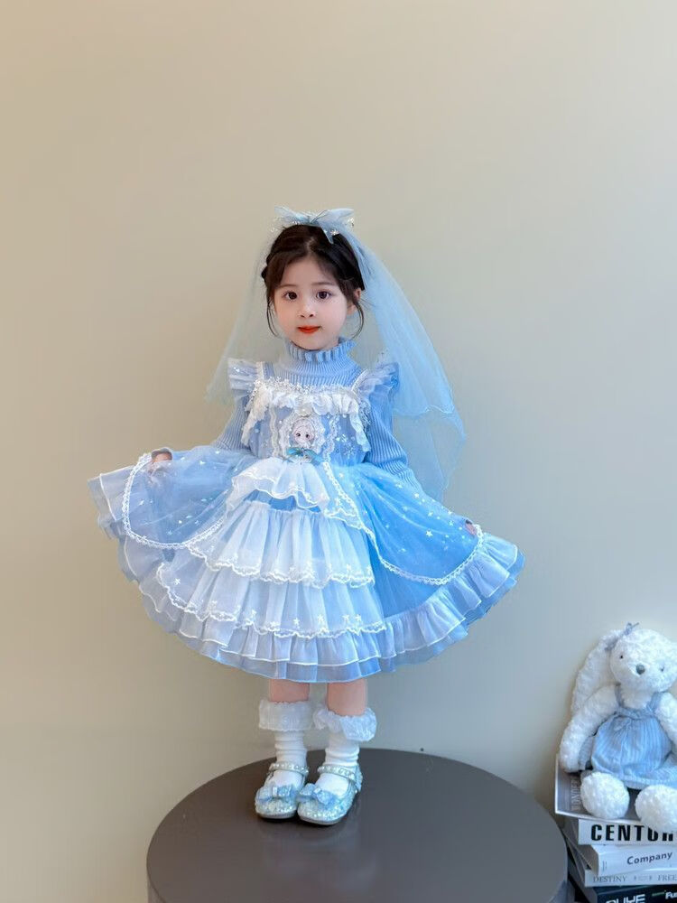 G.duck Girls Dress Set Autumn 2025 New Style Children's Lace Elsa Lolita Baby Girl Princess Dress Blue Skirt 90