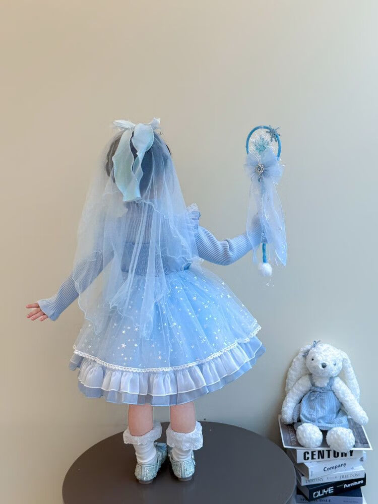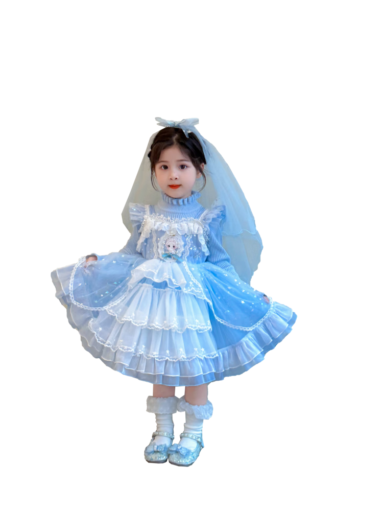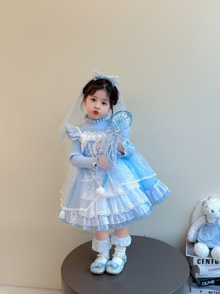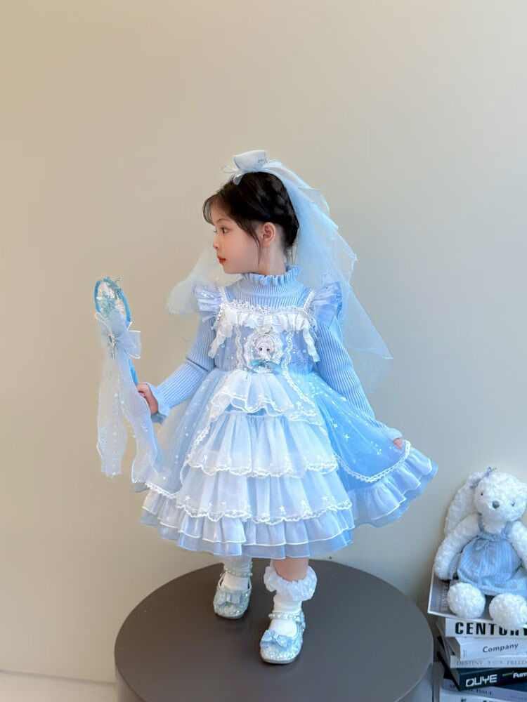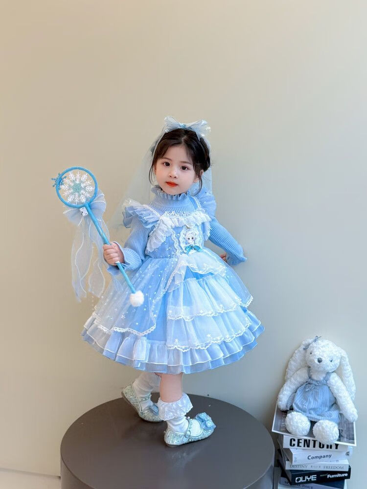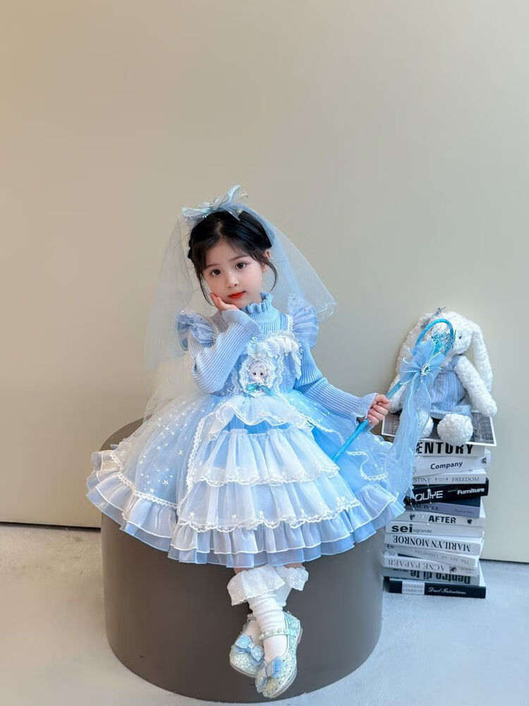 G.duck Girls Dress Set Autumn 2025 New Style Children's Lace Elsa Lolita Baby Girl Princess Dress Blue Skirt 90