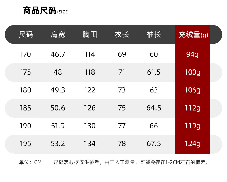 China (cm) 165 / 88-90 170 / 96-98 175 / 108-110 180 / 118-122 185 / 126-130