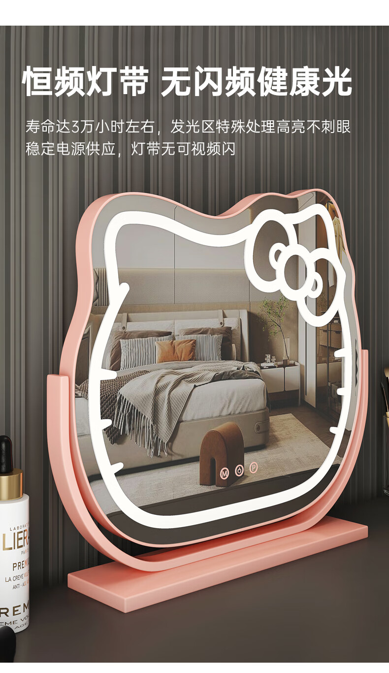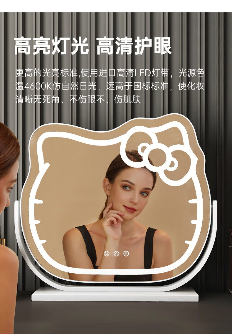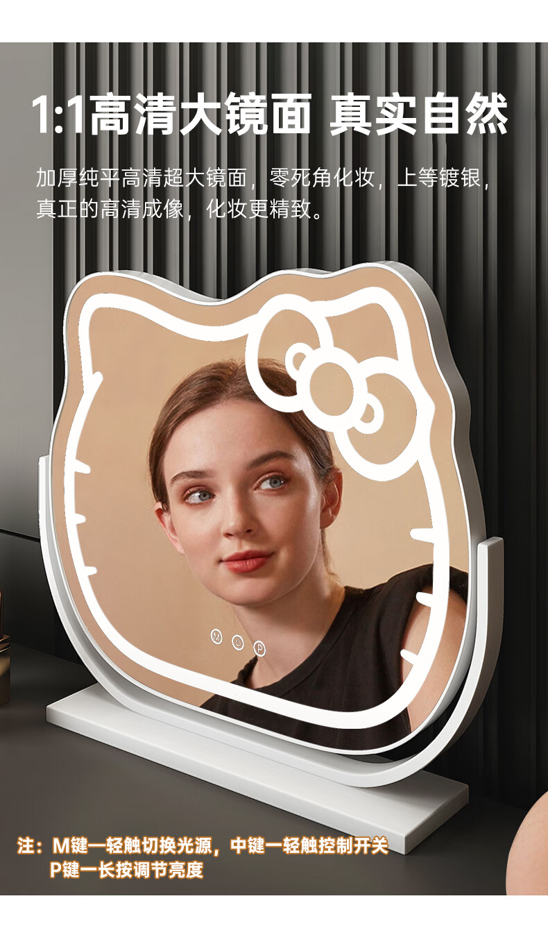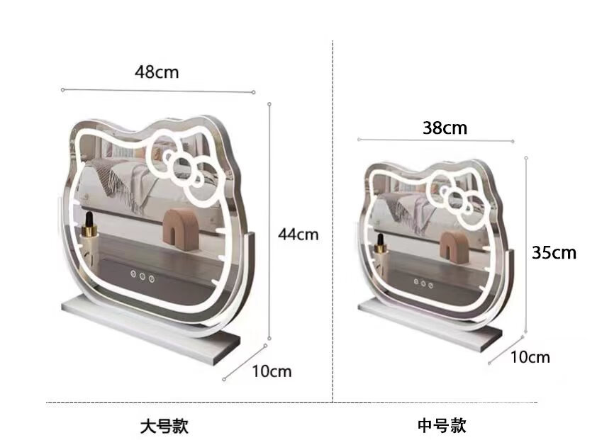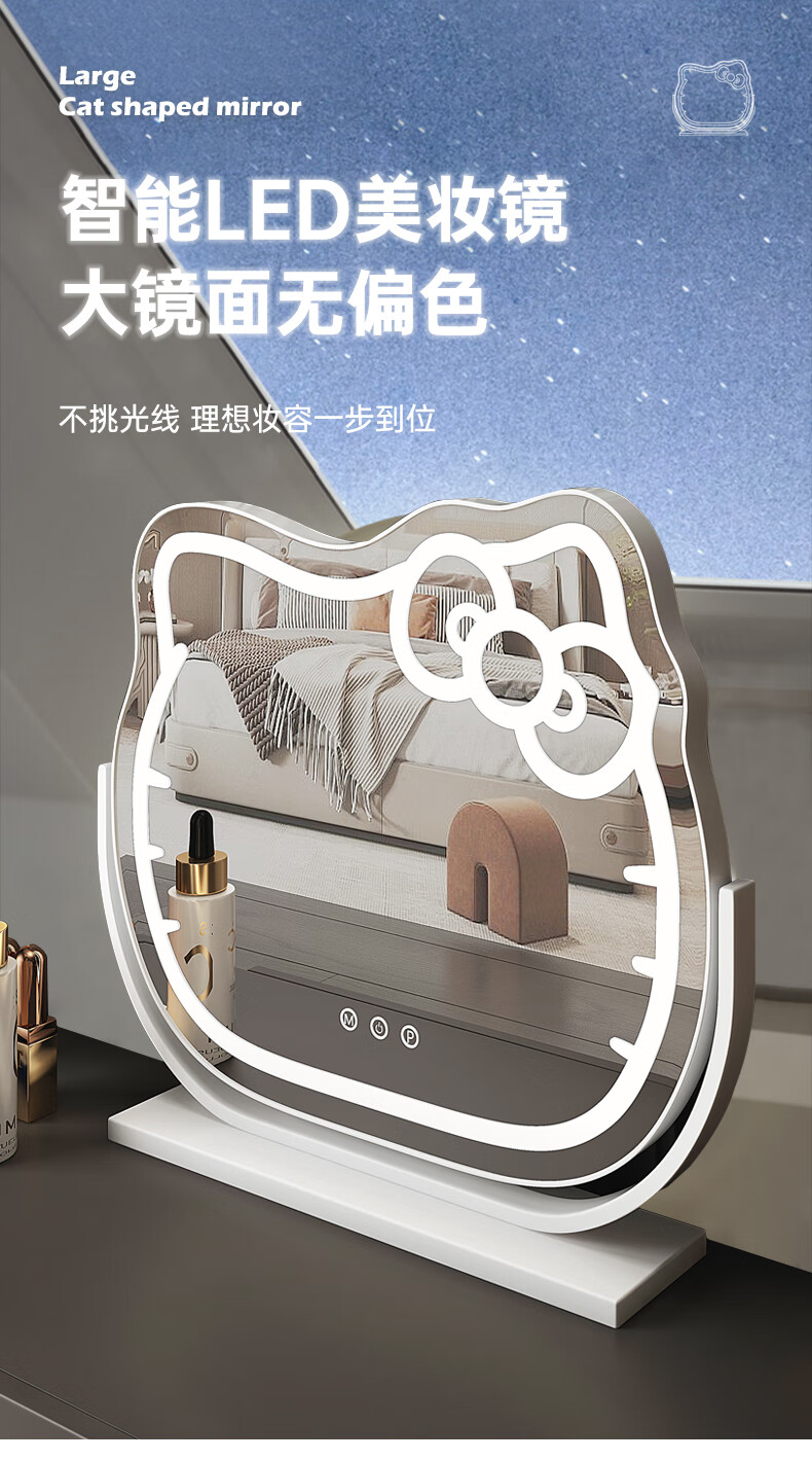 Mirror Kitty Makeup Mirror LED Desktop with Lights Smart Rechargeable Bedroom Makeup Mirror Hello Kitty Internet Celebrity Mirror Cat Large Milky White_Rechargeable Model