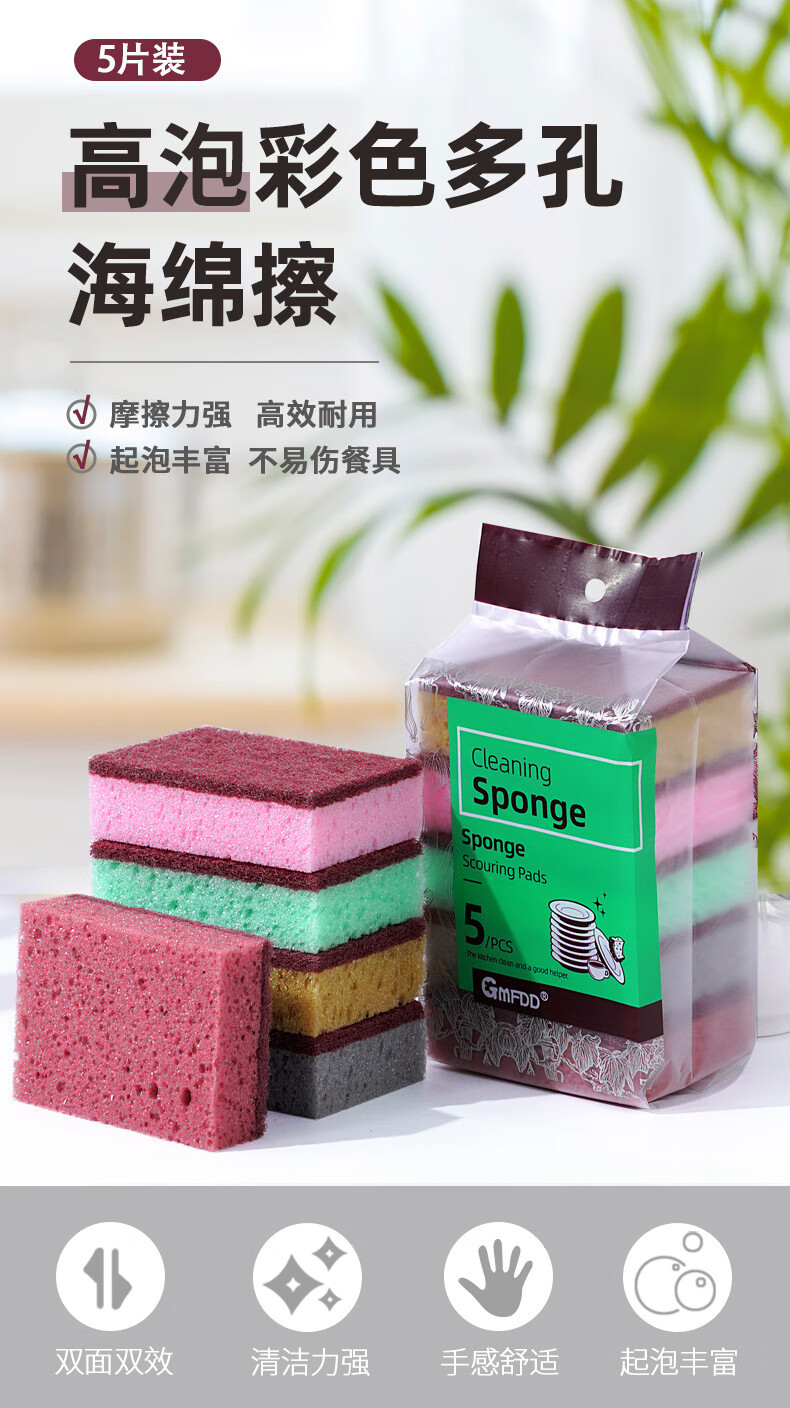 Dishwashing sponge double-sided household sponge rag thickened scouring sponge scouring pad dishwashing cloth kitchen housework magic wipe two colors 5 pieces 3 bags 10*7*3cm random color