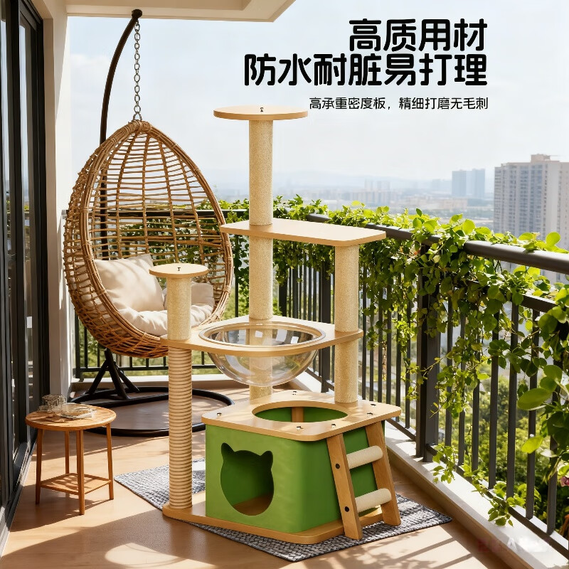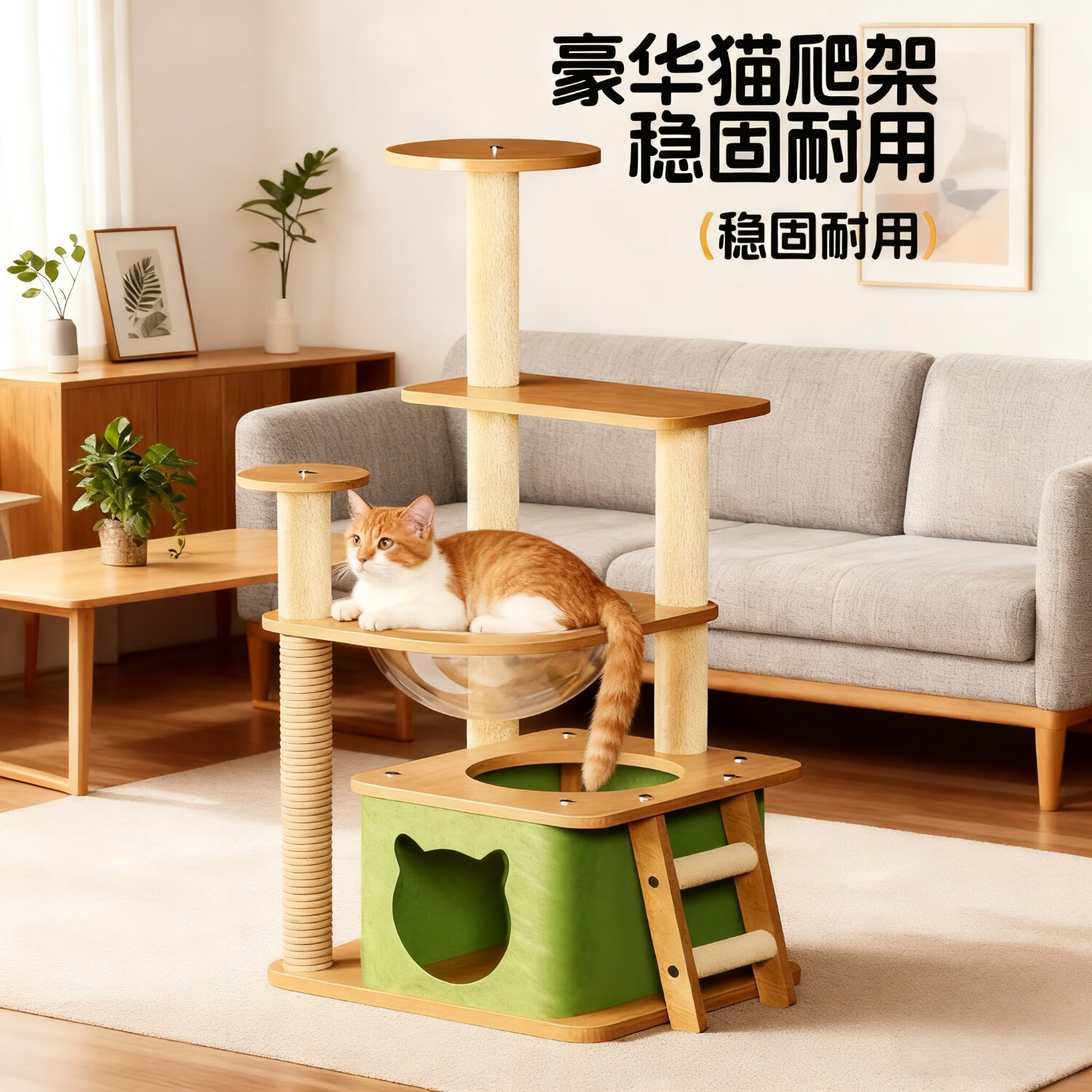 Katzenklettergerüst, Katzennest, in den Kratzbaum integrierte Raumkapselplattform, Sisal-Katzenregal, hoch aufragende Säule, nicht besetzendes Katzenkratzbrettspielzeug, Meow Time – Grün, 5 Schichten + Raumkapsel + Plattform + lustiger Katzenball