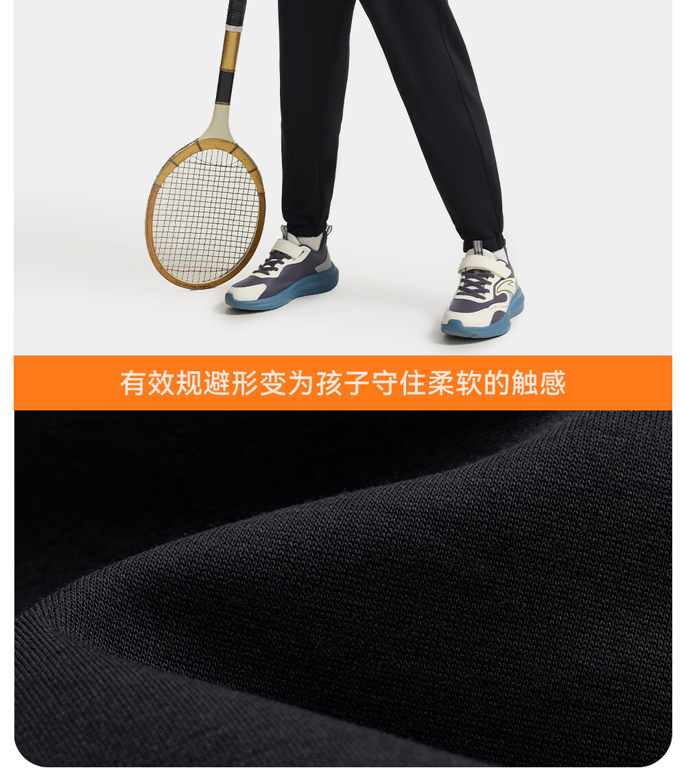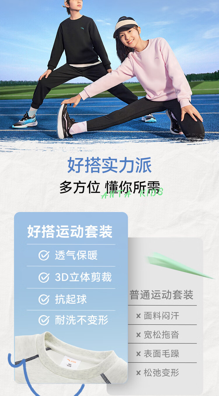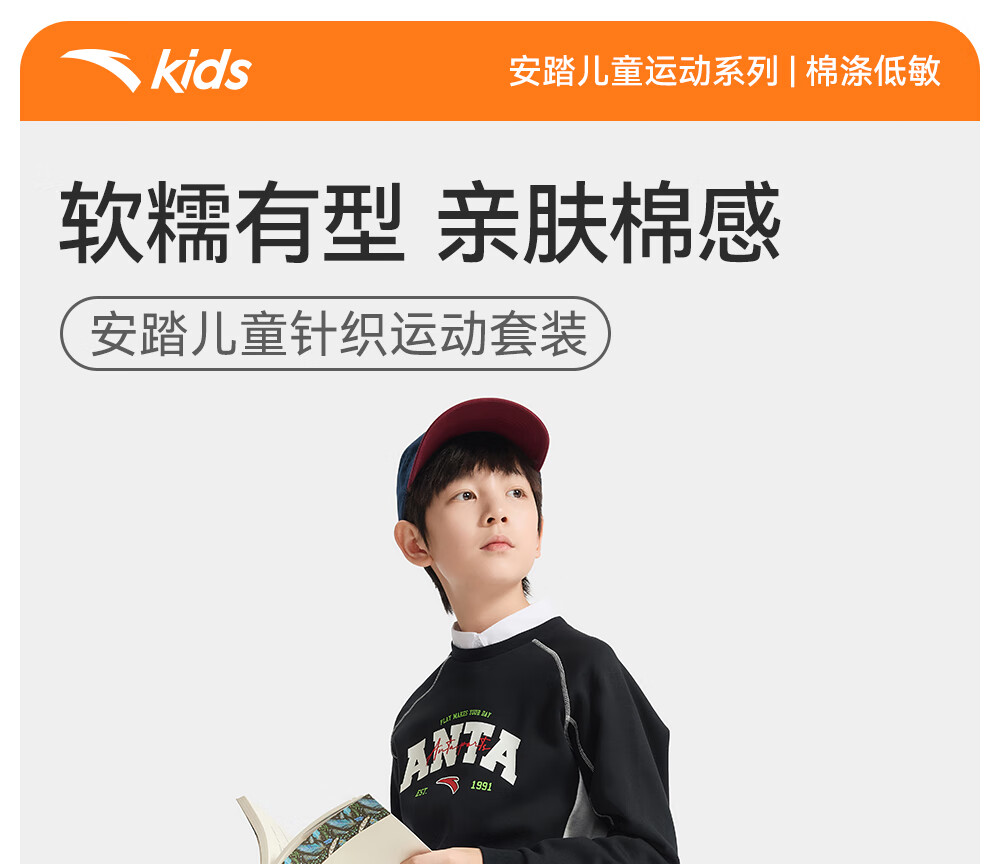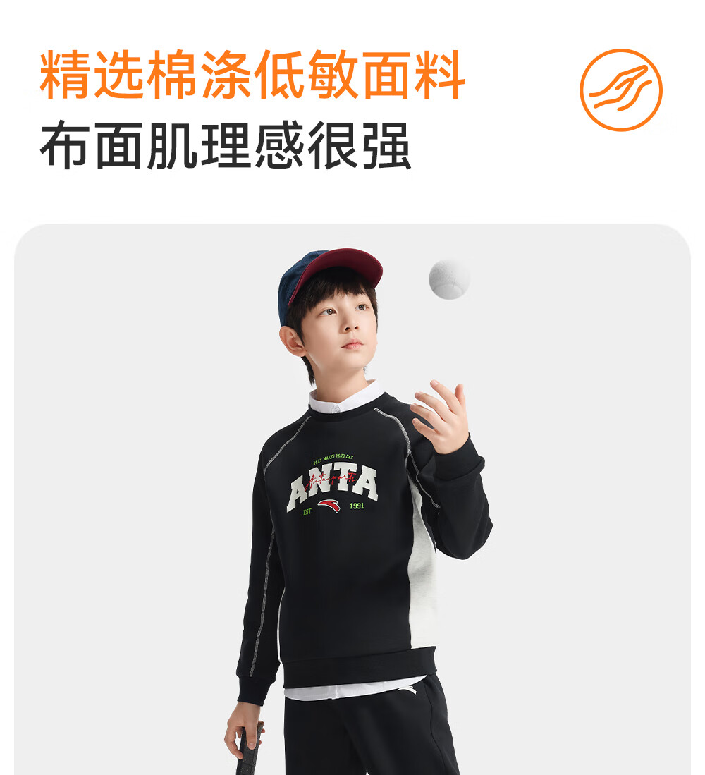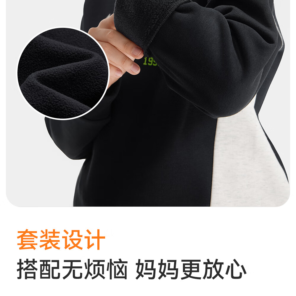 ANTA Children's Suit for Boys and Girls 2025 Autumn School Sports Children's Clothing Outdoor Running Training Knitted Sports Clothes Plus Velvet Style Black Letter Sweatshirt + Black Trousers Skin Warm Velvet 150 cm