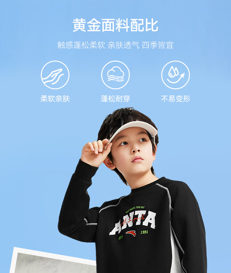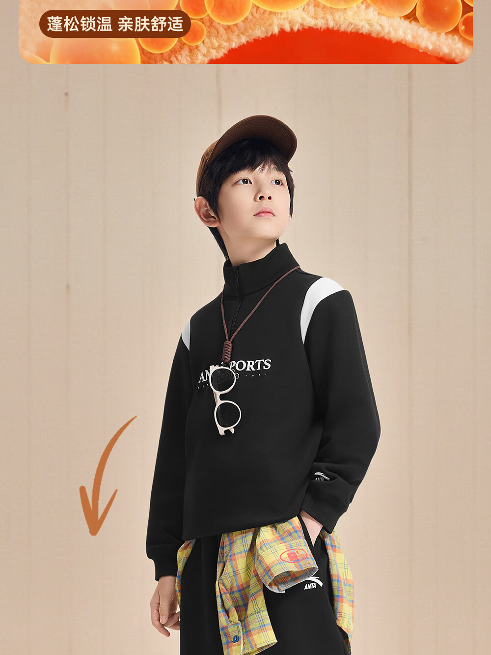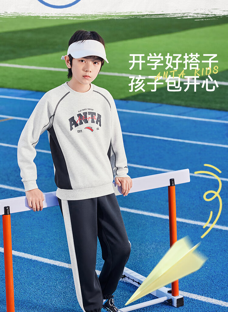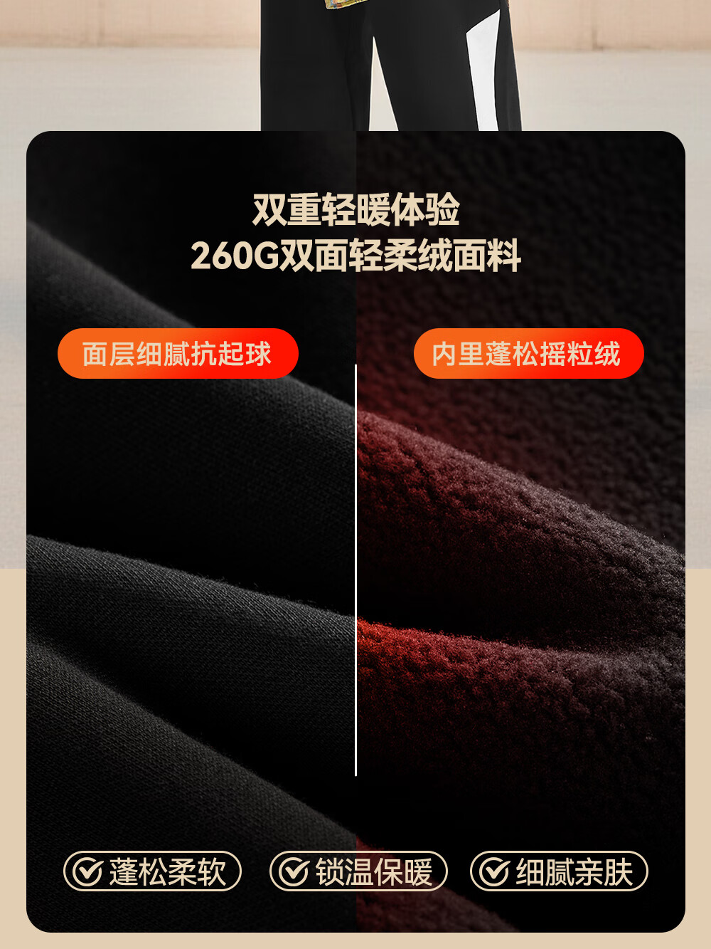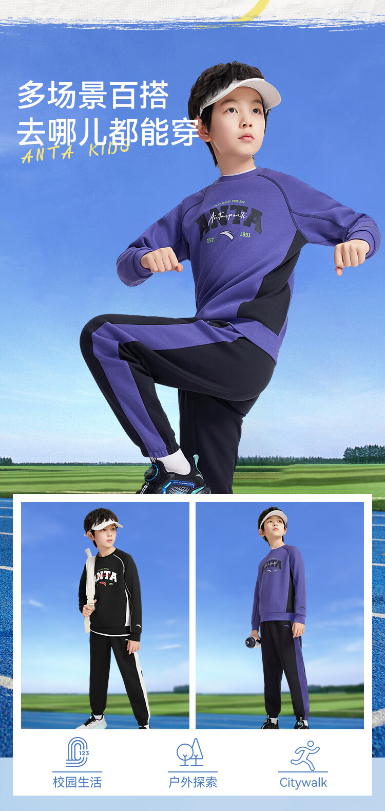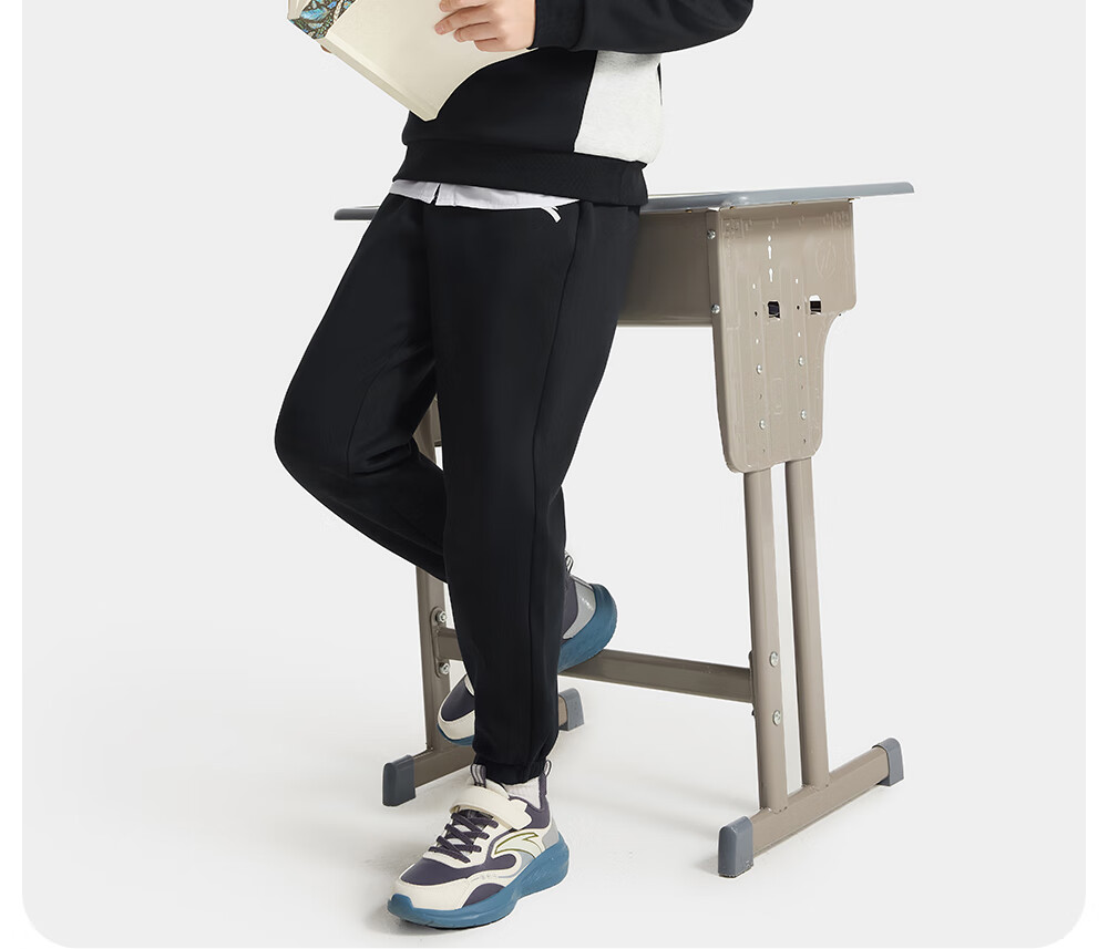 ANTA Children's Suit for Boys and Girls 2025 Autumn School Sports Children's Clothing Outdoor Running Training Knitted Sports Clothes Plus Velvet Style Black Letter Sweatshirt + Black Trousers Skin Warm Velvet 150 cm