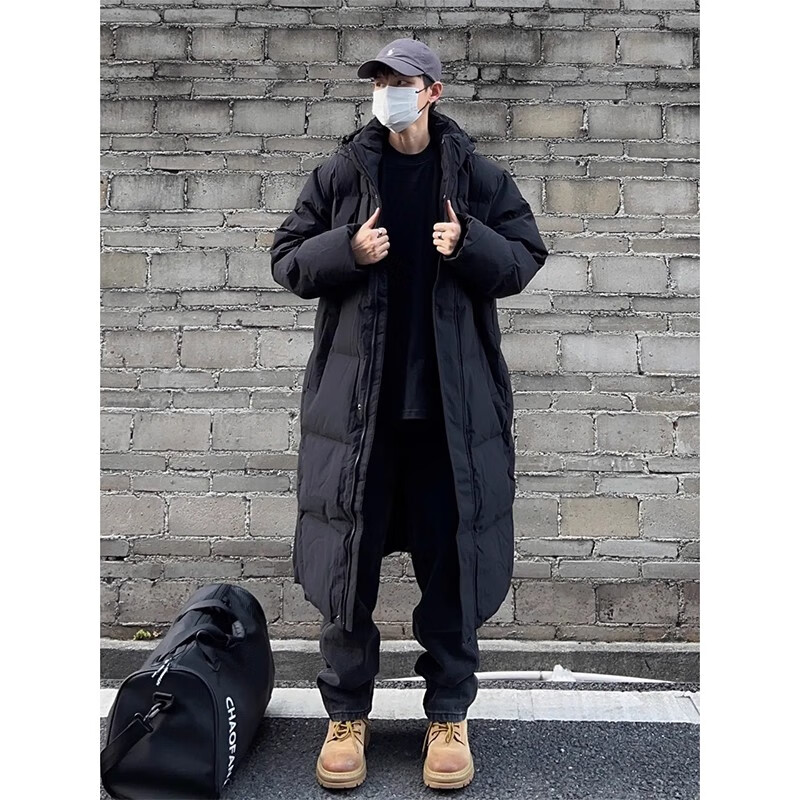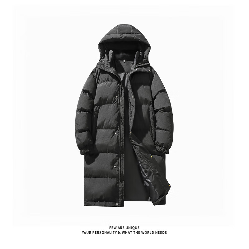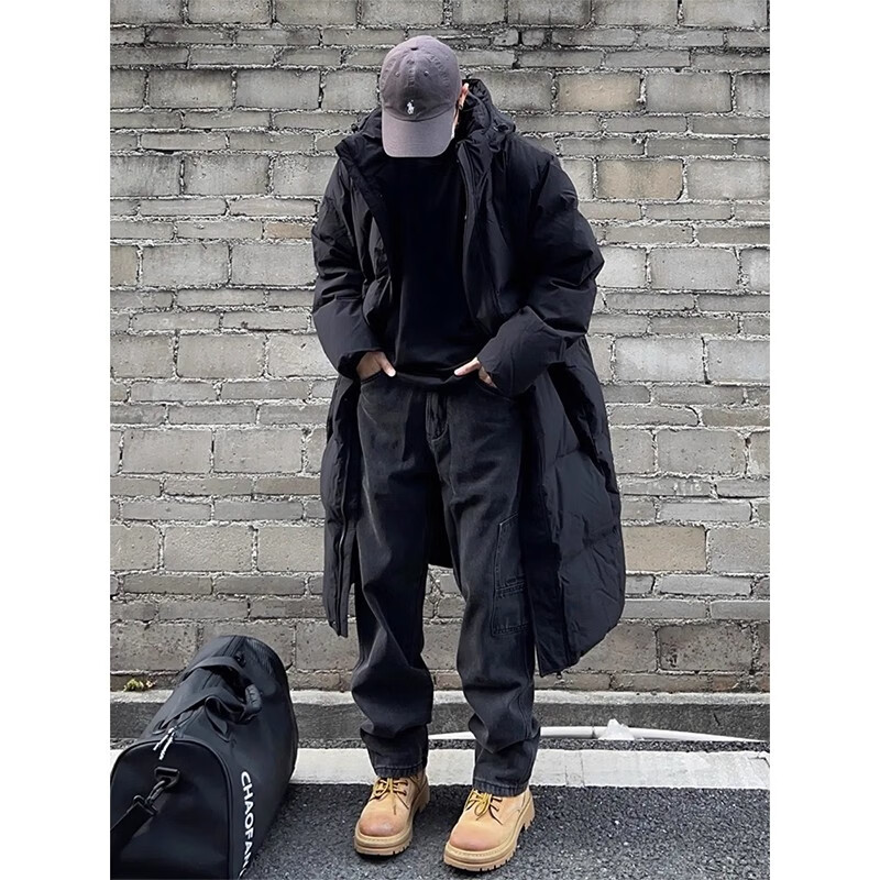 Maycaur black American hooded mid-length velvet cotton coat for men in winter thickened over the knee Northeast cold-resistant handsome coat black L _100-115Jin Jin equals 0.5 kg