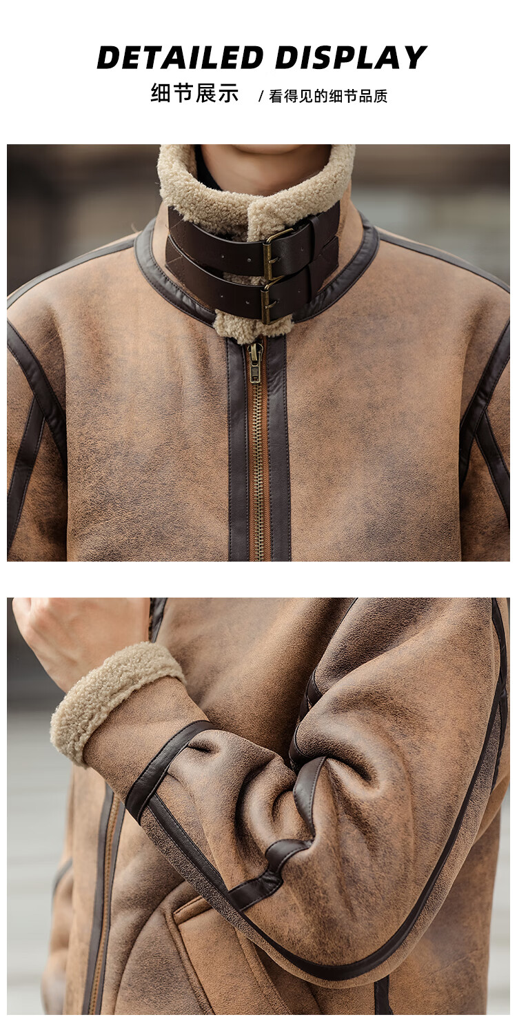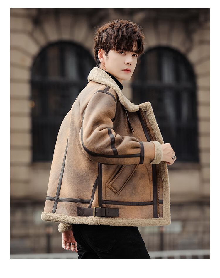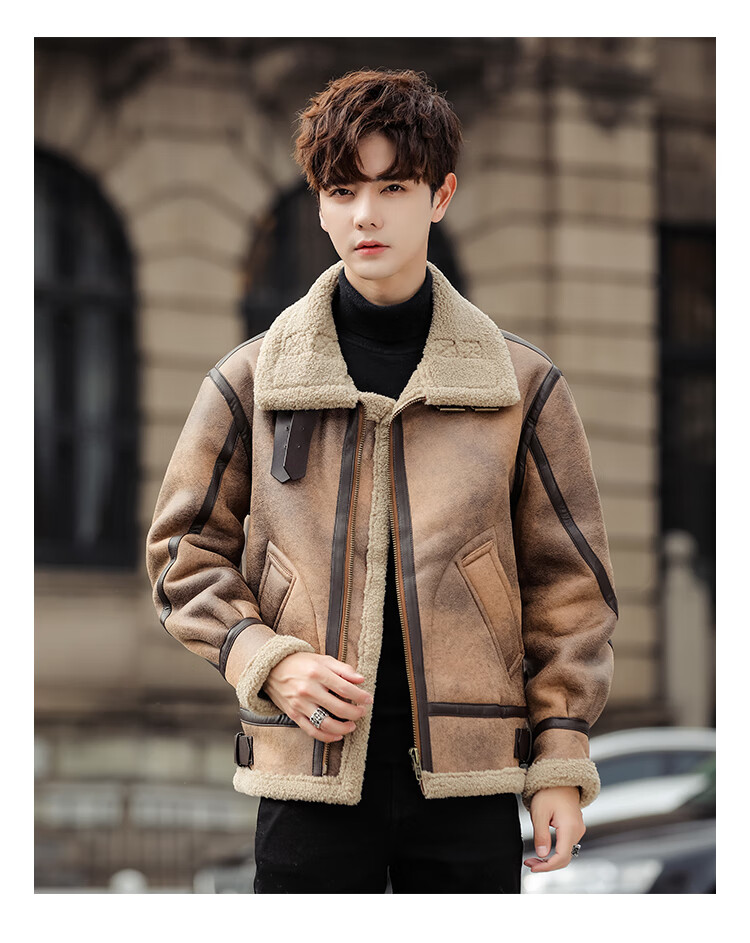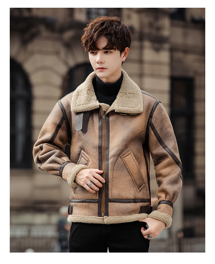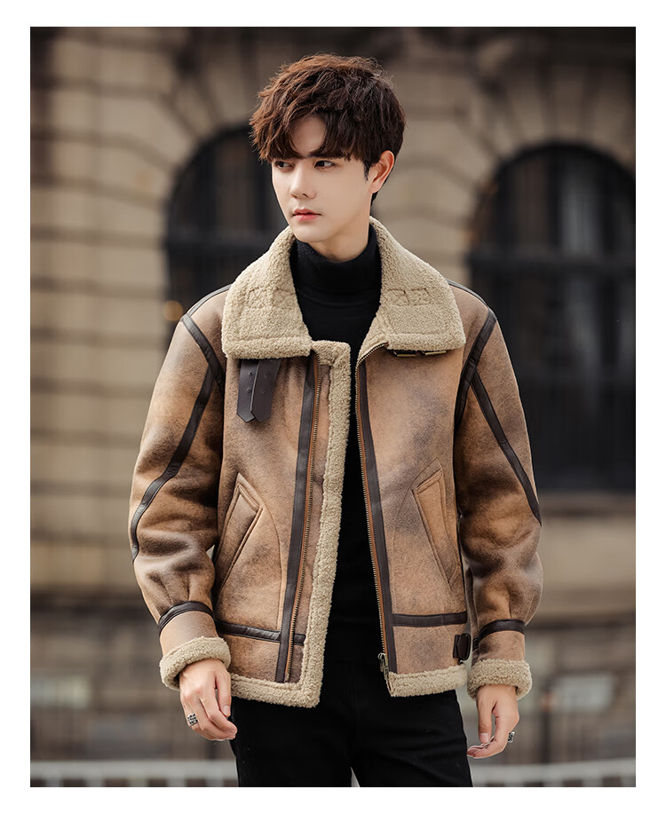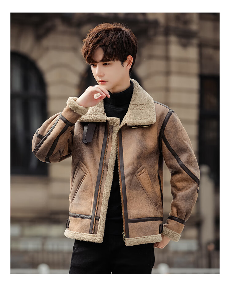 Falling retro flight jacket men's fur one-piece suede lambswool jacket thickened large size couple leather jacket trend retro brown 4XL
