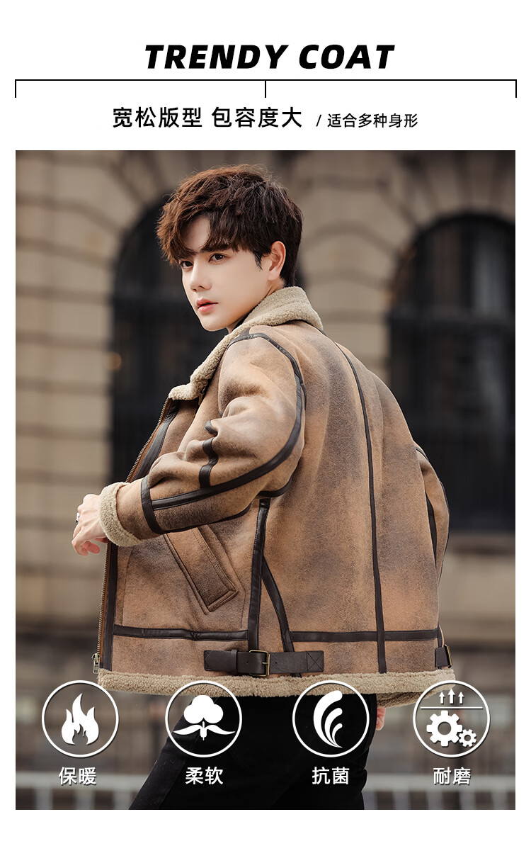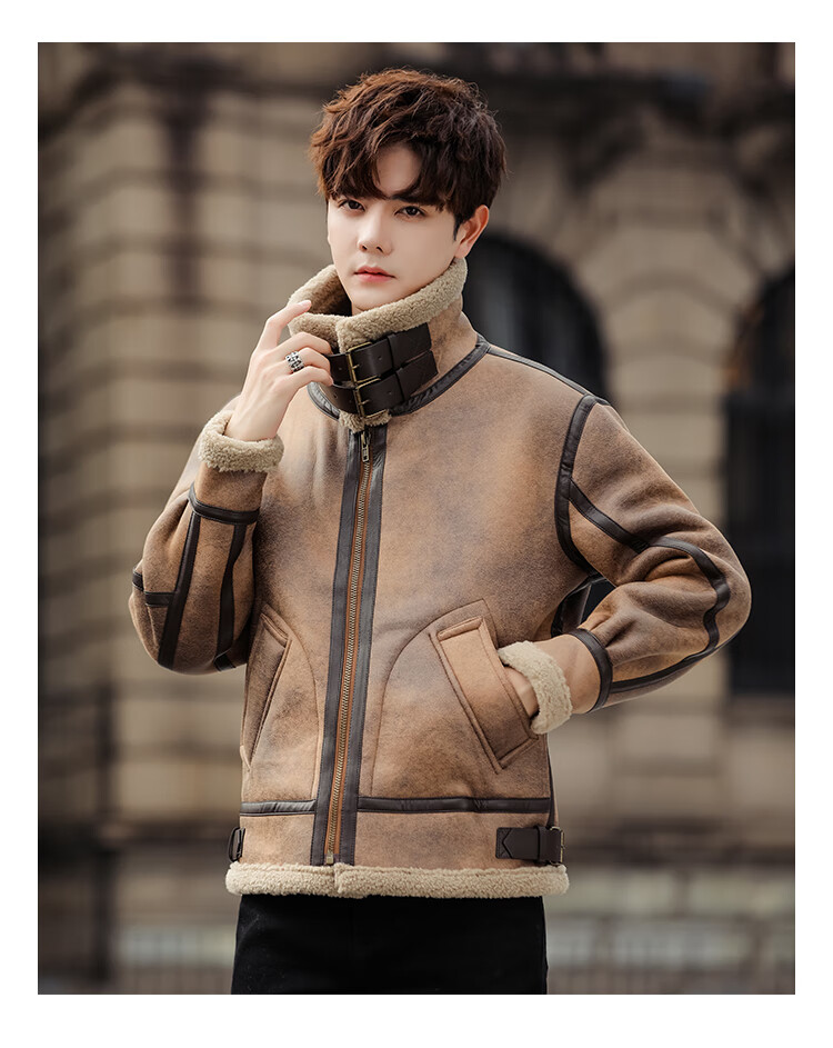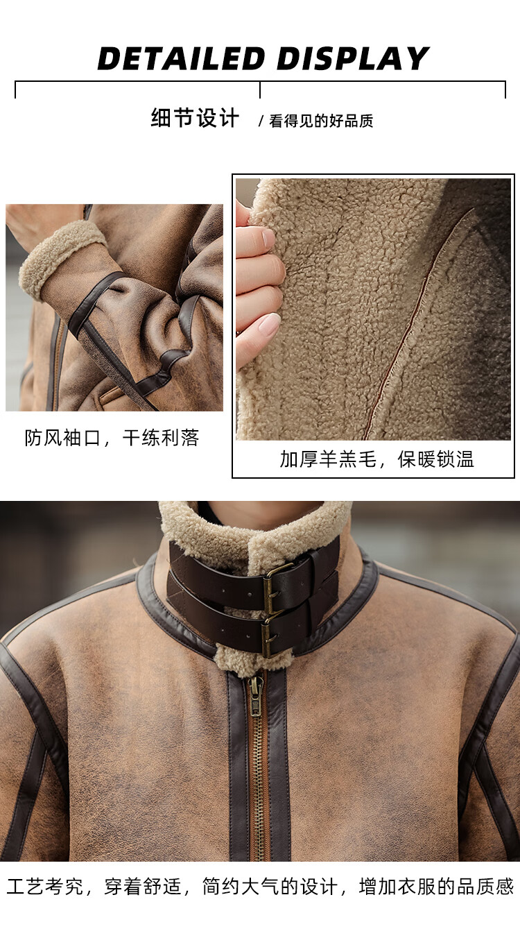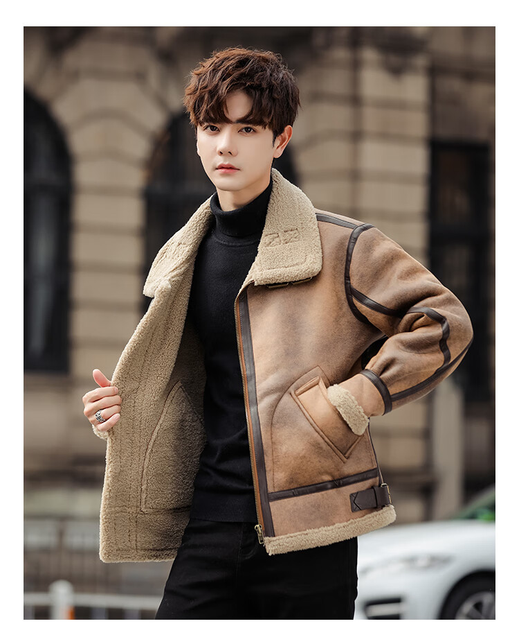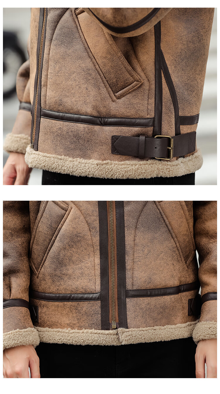Falling retro flight jacket men's fur one-piece suede lambswool jacket thickened large size couple leather jacket trend retro brown 4XL