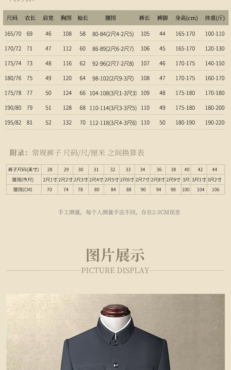 China (cm) 165 / 88-90 170 / 96-98 175 / 108-110 180 / 118-122 185 / 126-130