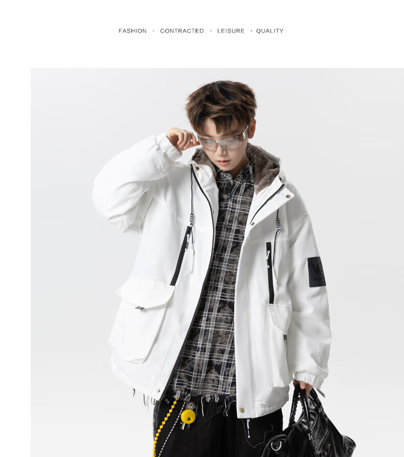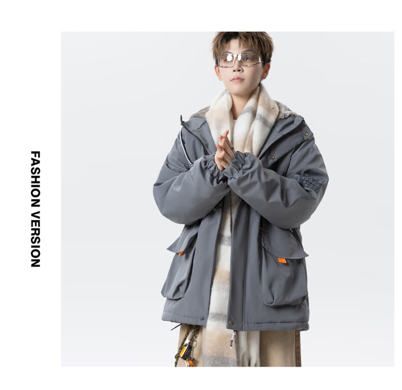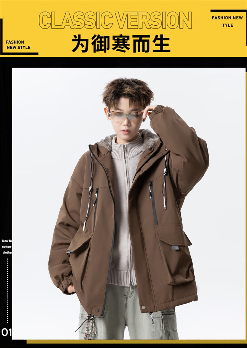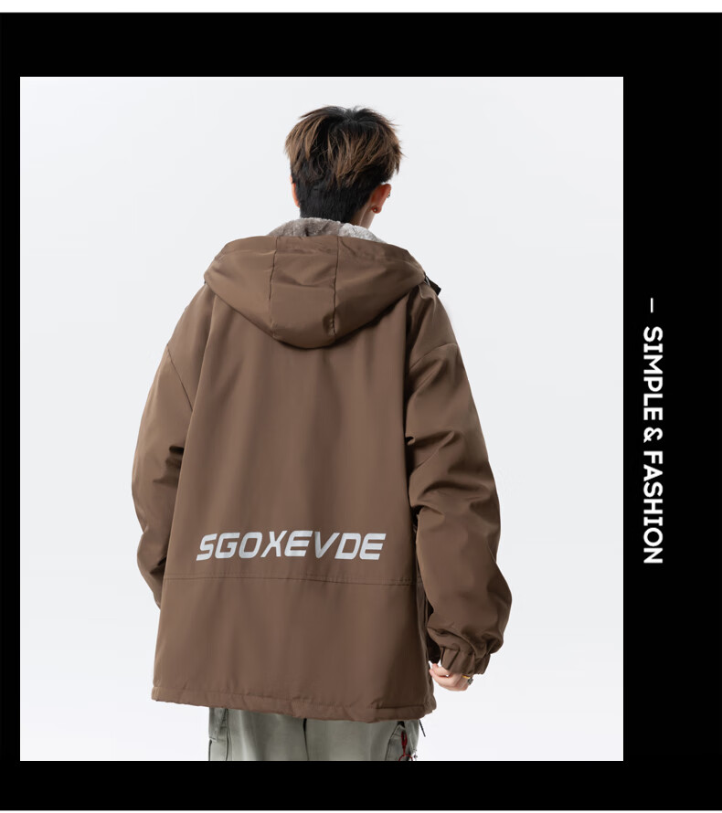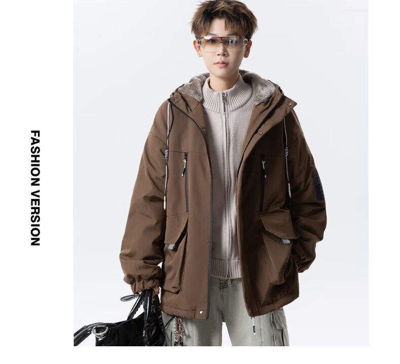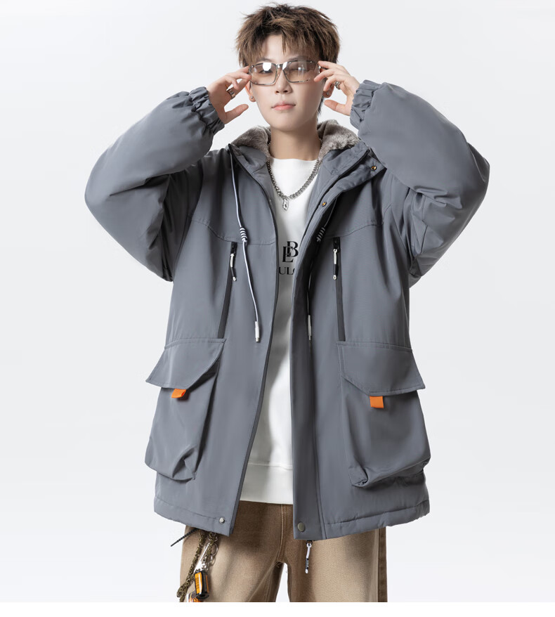 Teenage men's trendy autumn and winter workwear windproof jacket loose hooded jacket plus velvet thickened parka beige 4XL 195 size 180-200Jin Jin equals 0.5 kg