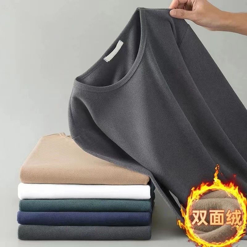 2025 new bottoming men's long-sleeved T-shirt autumn and winter double-sided velvet warm plus velvet round neck top with dark gray 3XL