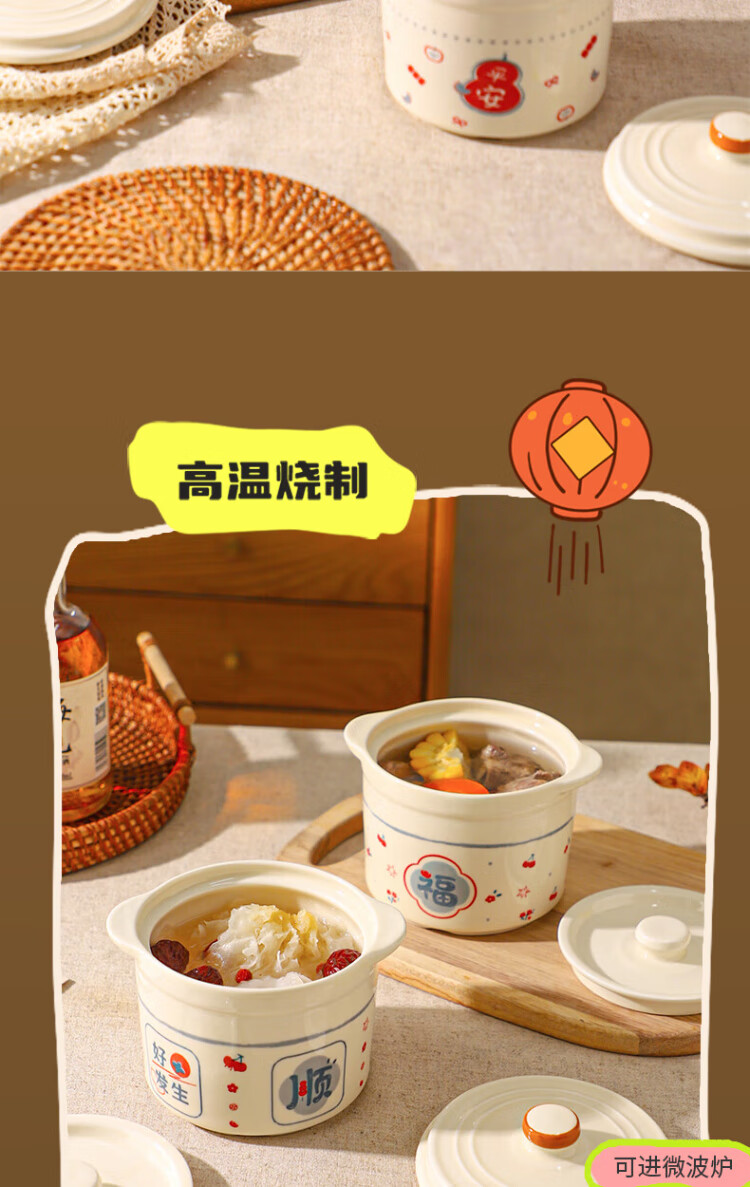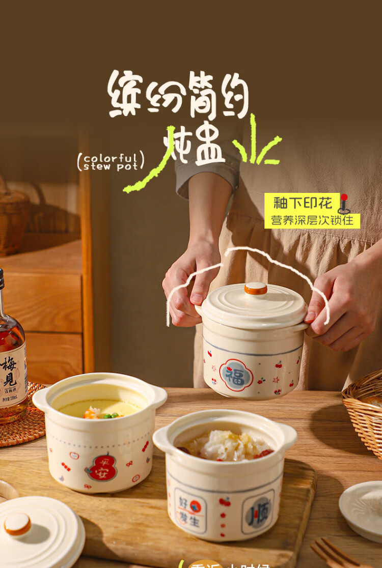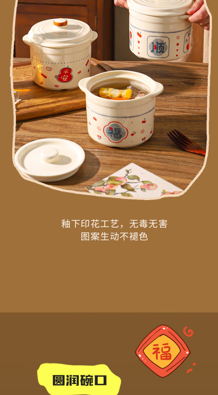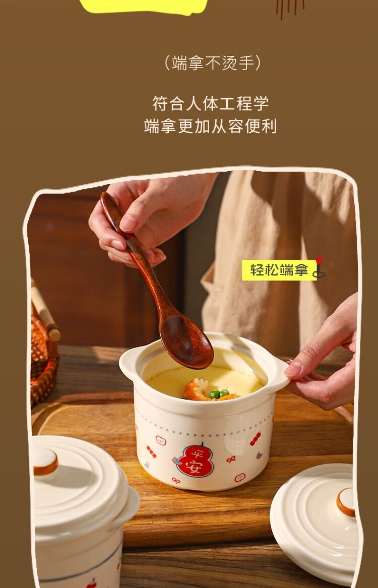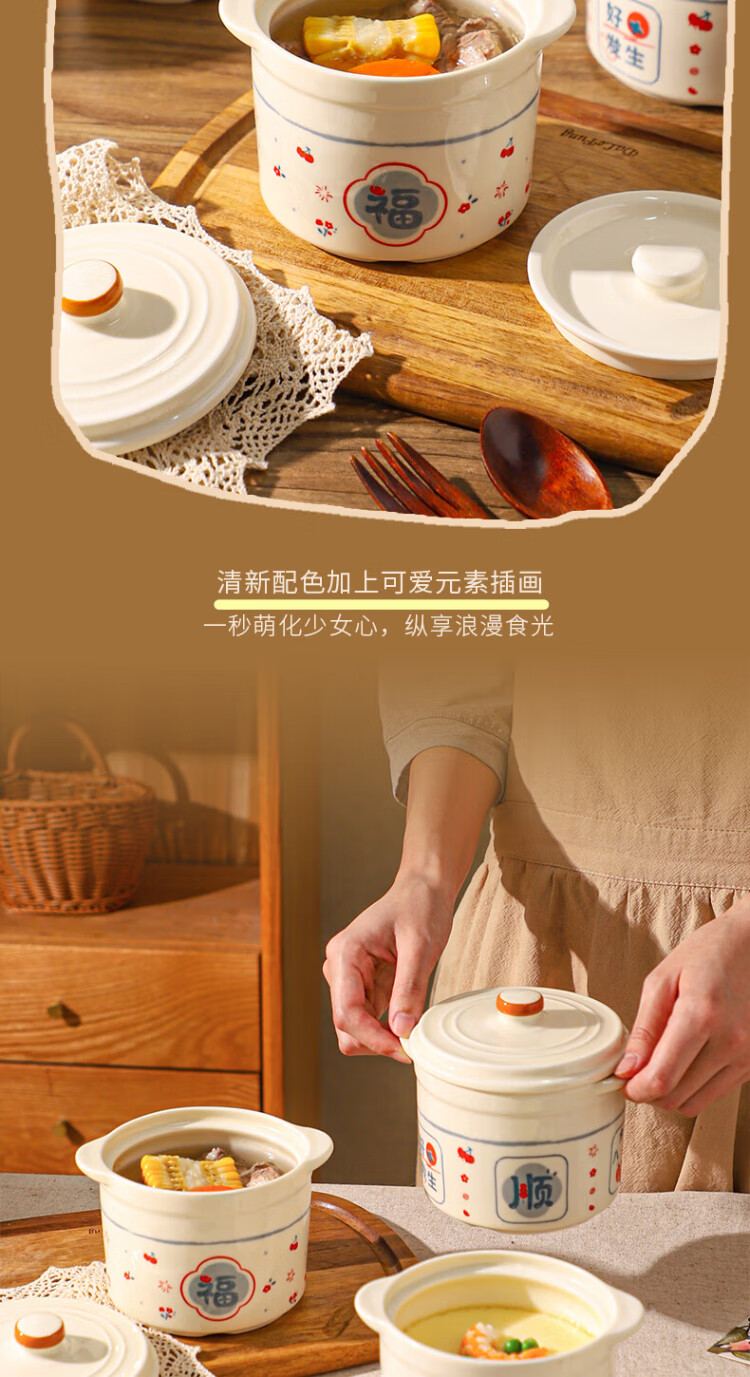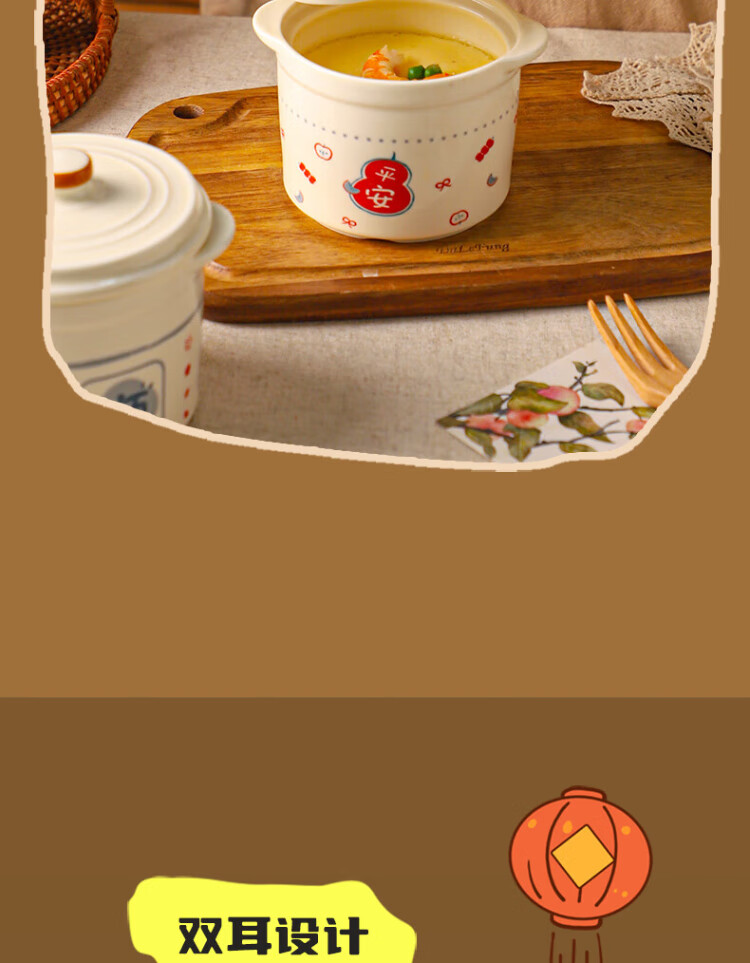 Sheli Chinese double-lid stew pot, double-ear ceramic water-proof stew steamed egg bowl, stew pot, household dessert bird's nest special soup cup, two packs, Fu style + Ping An style/small spoon, 550ml, can be steamed and baked | double cover to lock in freshness