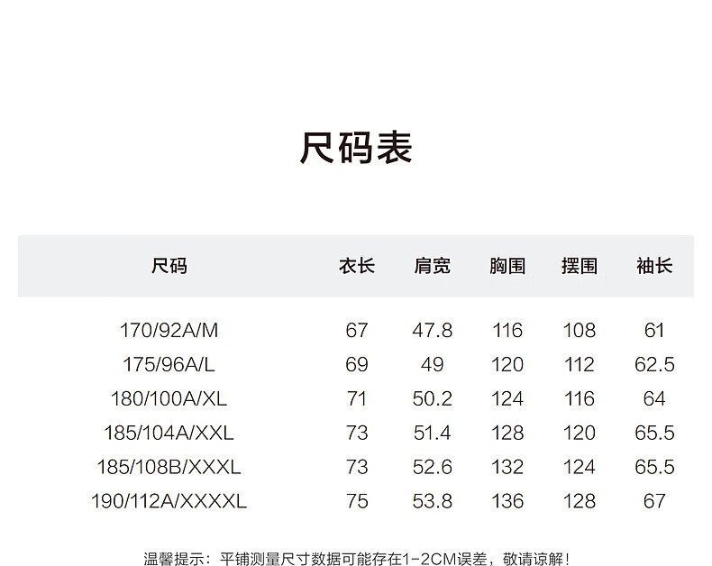 China (cm) 165 / 88-90 170 / 96-98 175 / 108-110 180 / 118-122 185 / 126-130