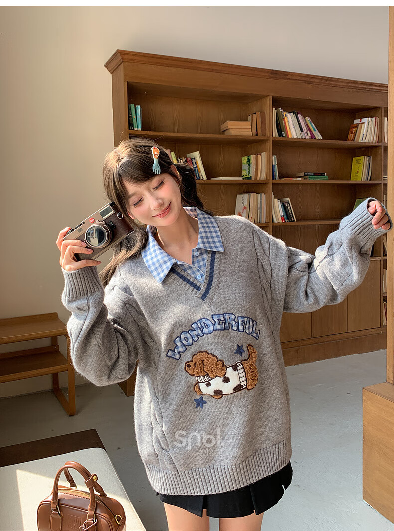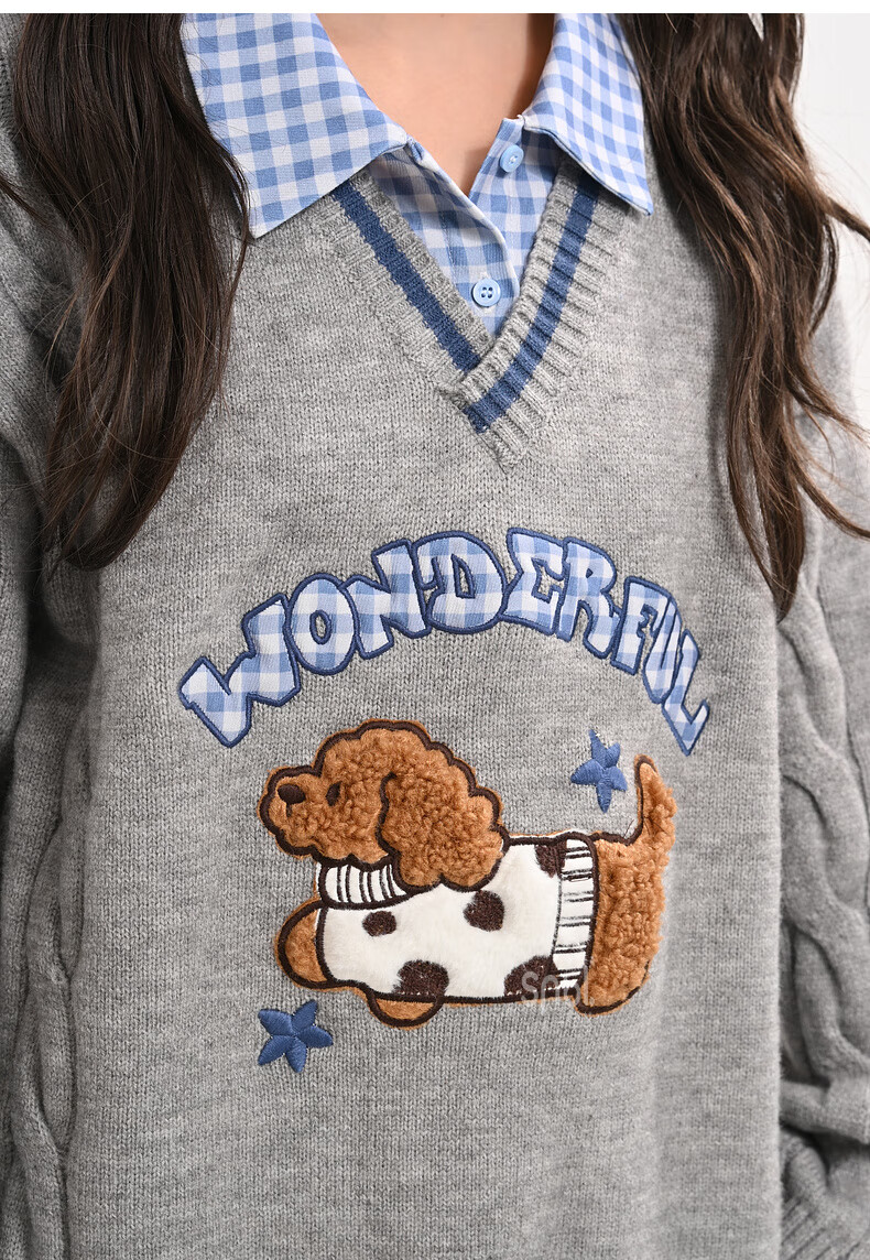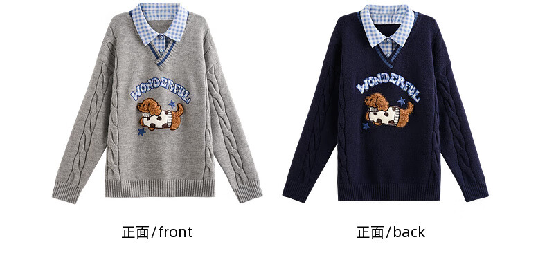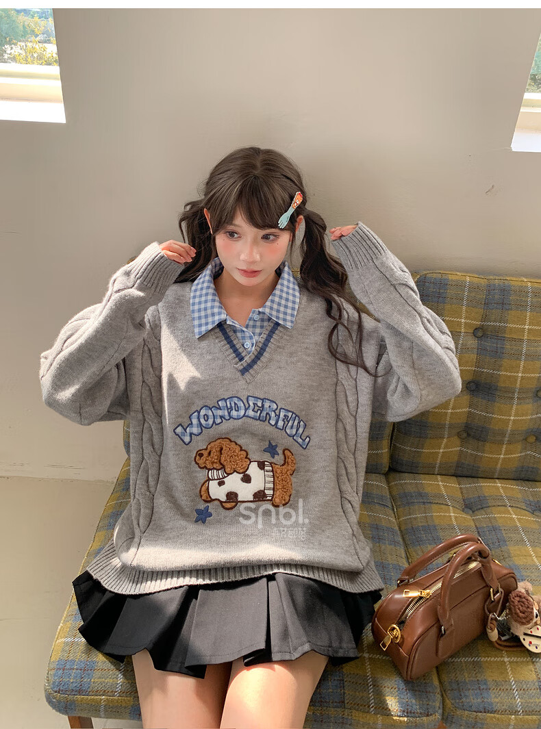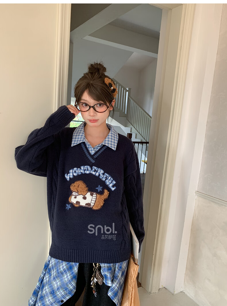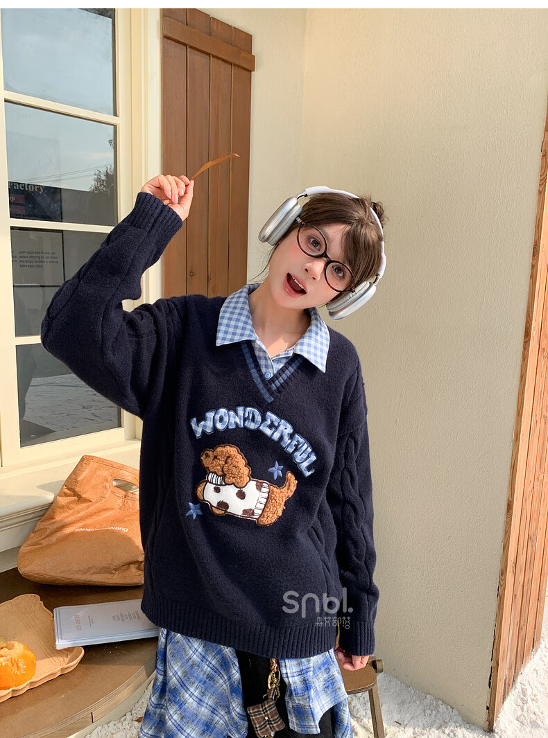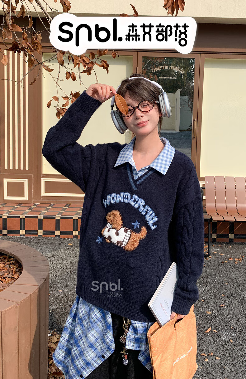 Mori Girl Tribe Mori Girl Tribe College Style Cartoon Embroidered Pullover Sweater Women's New Fake Two-piece Design Warm Sweater Winter Blue Sweater M