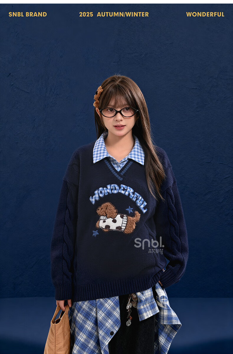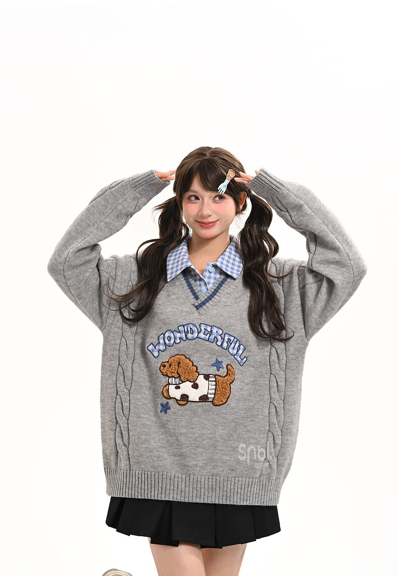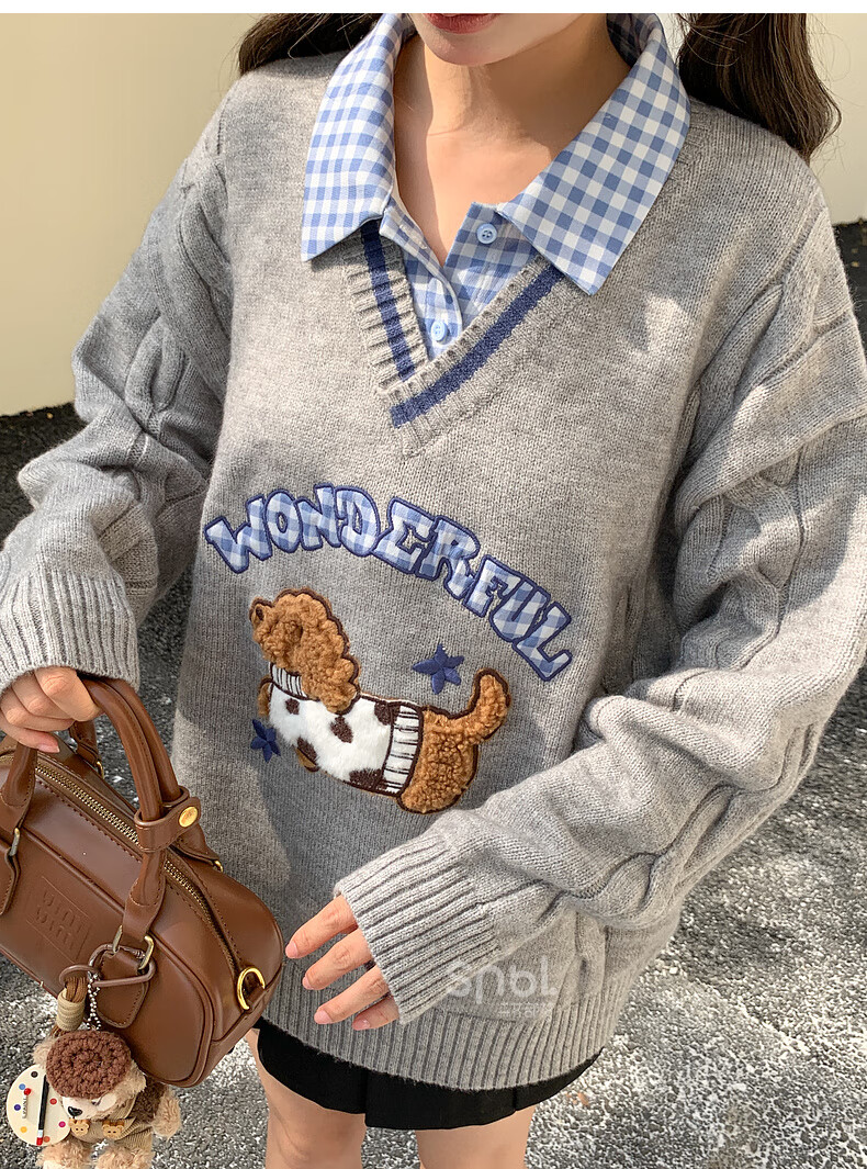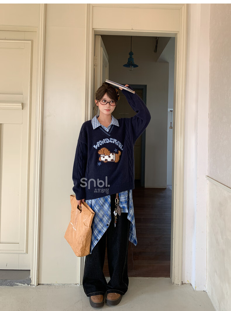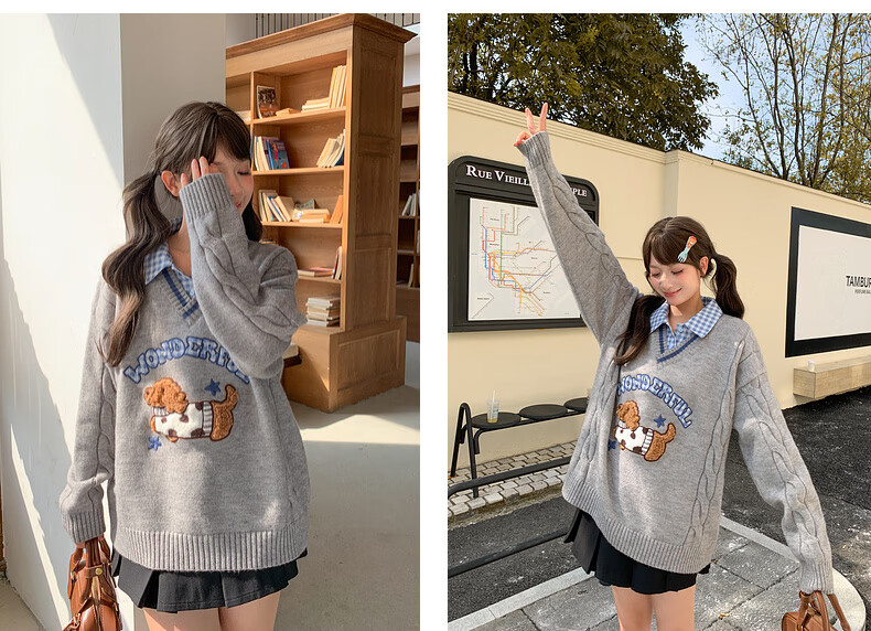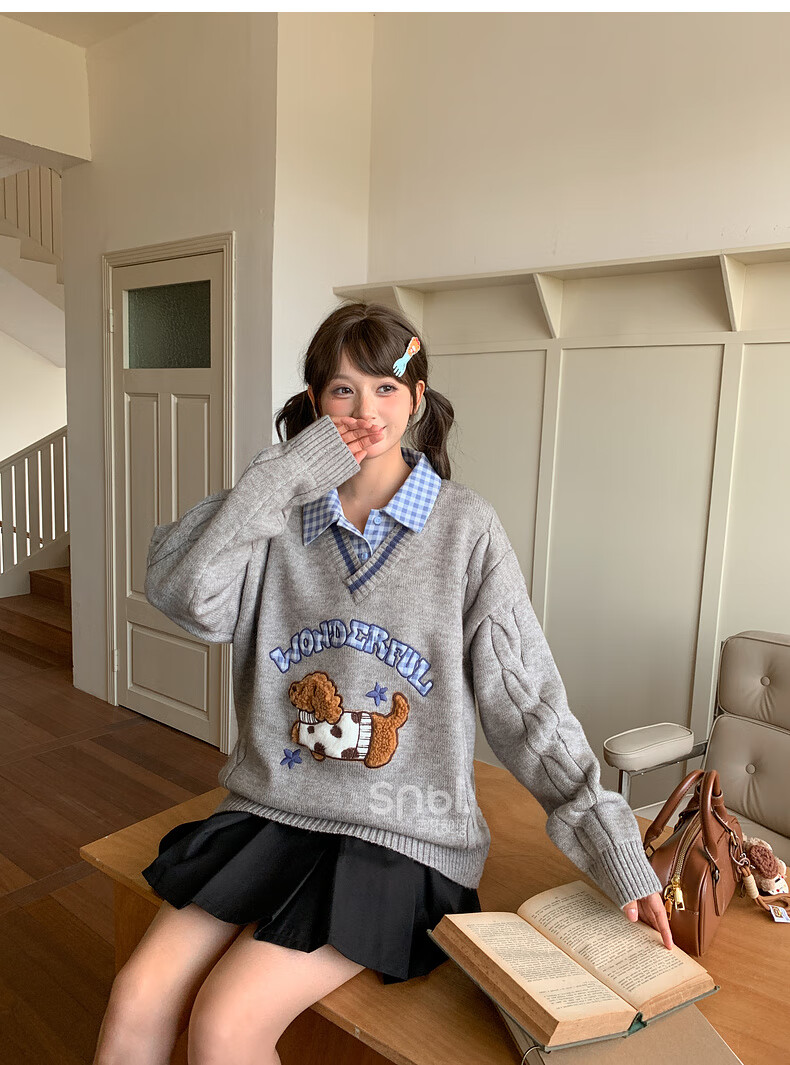 Mori Girl Tribe Mori Girl Tribe College Style Cartoon Embroidered Pullover Sweater Women's New Fake Two-piece Design Warm Sweater Winter Blue Sweater M