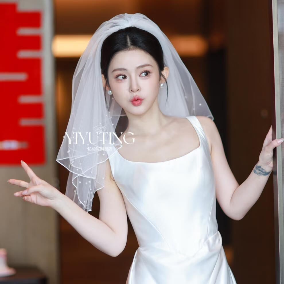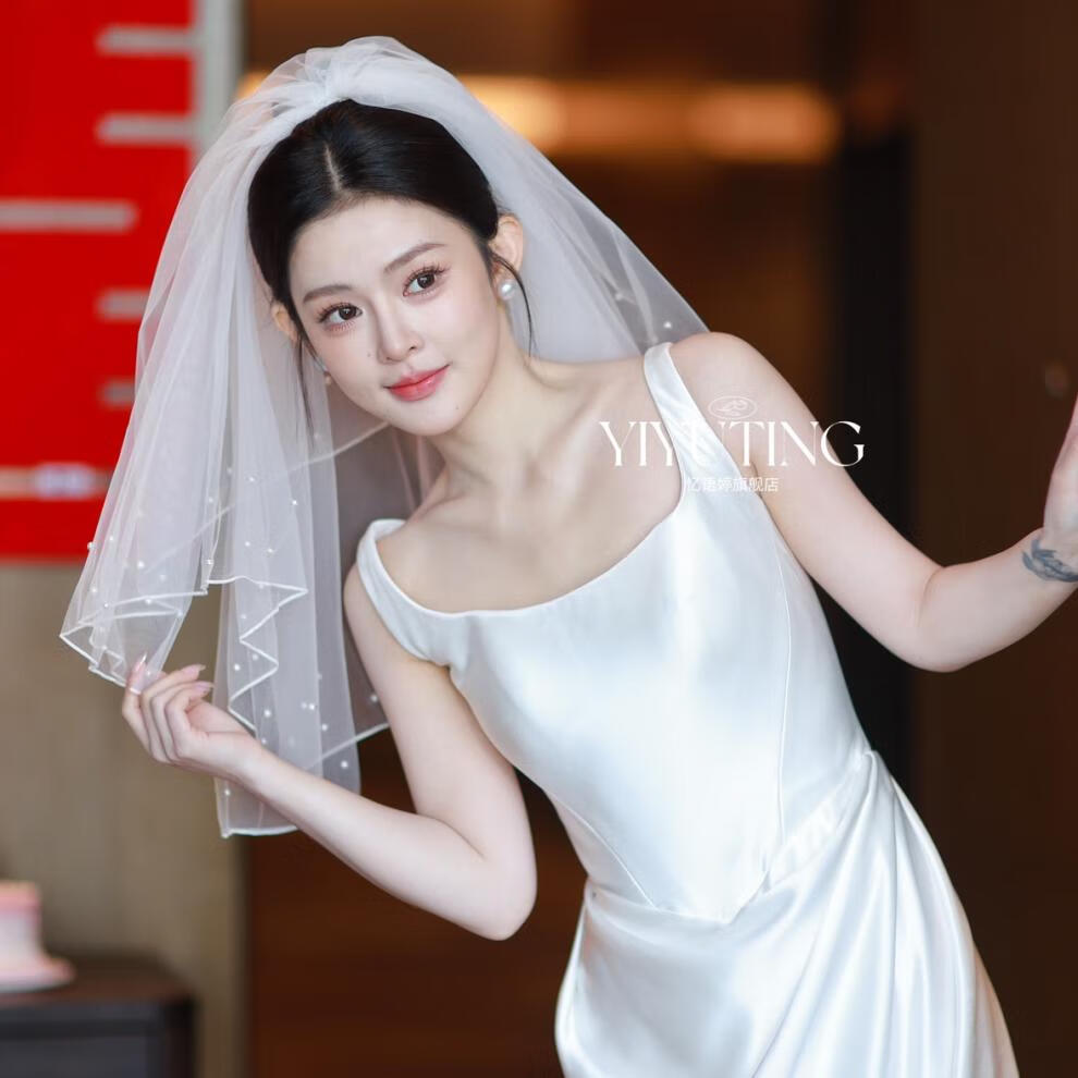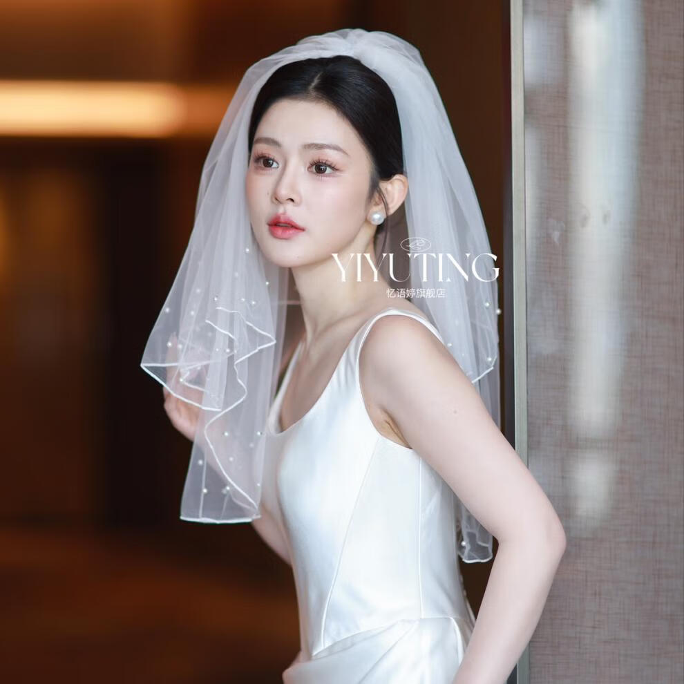 ROAR UTHAUG white imitation pearl double layer short fluffy wedding veil photo props bride wedding certificate veil white new short pearl veil