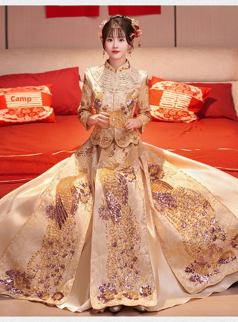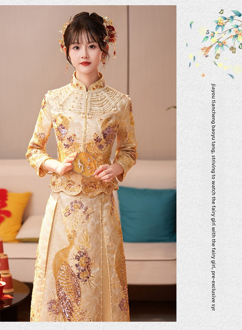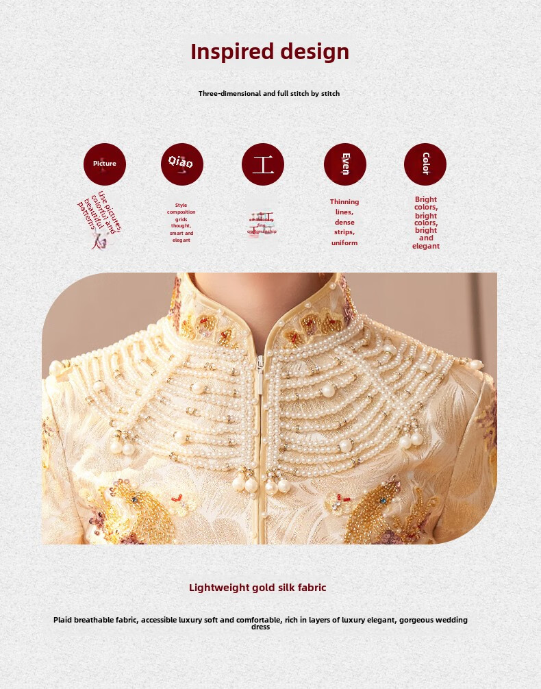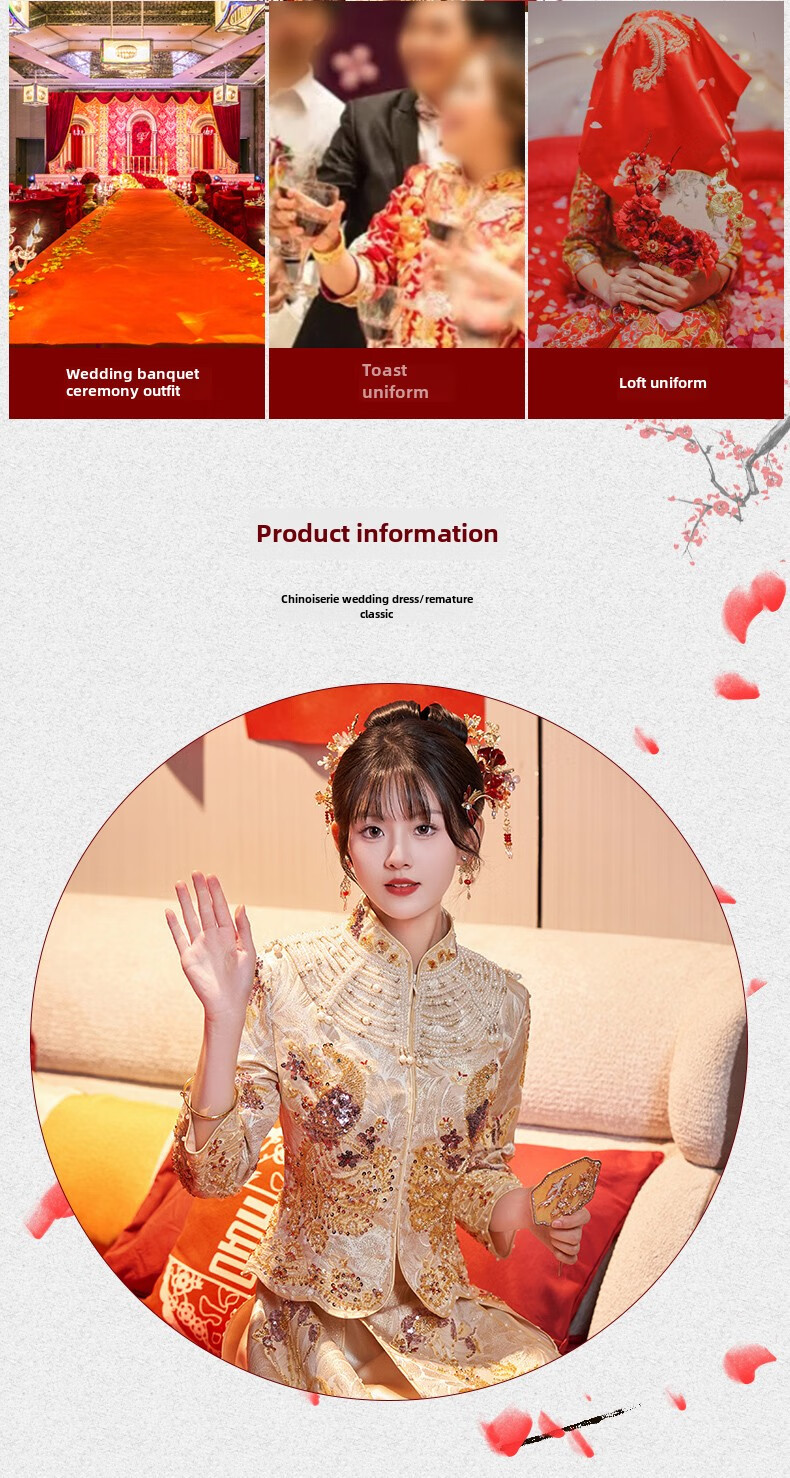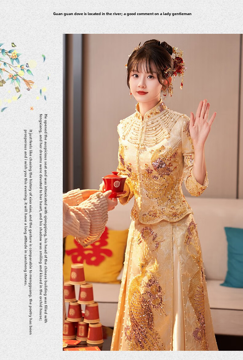ROAR UTHAUG Champagne Show and Dress Bridal 2024 New Chinese Style Wedding Dress Small Toast Dress Autumn and Winter Wedding Dress High-end Gold Beads (No Headgear) S