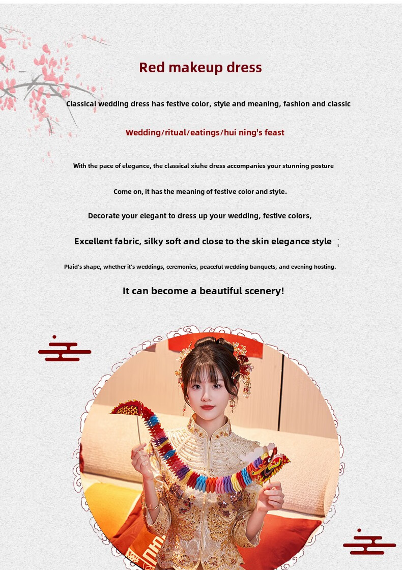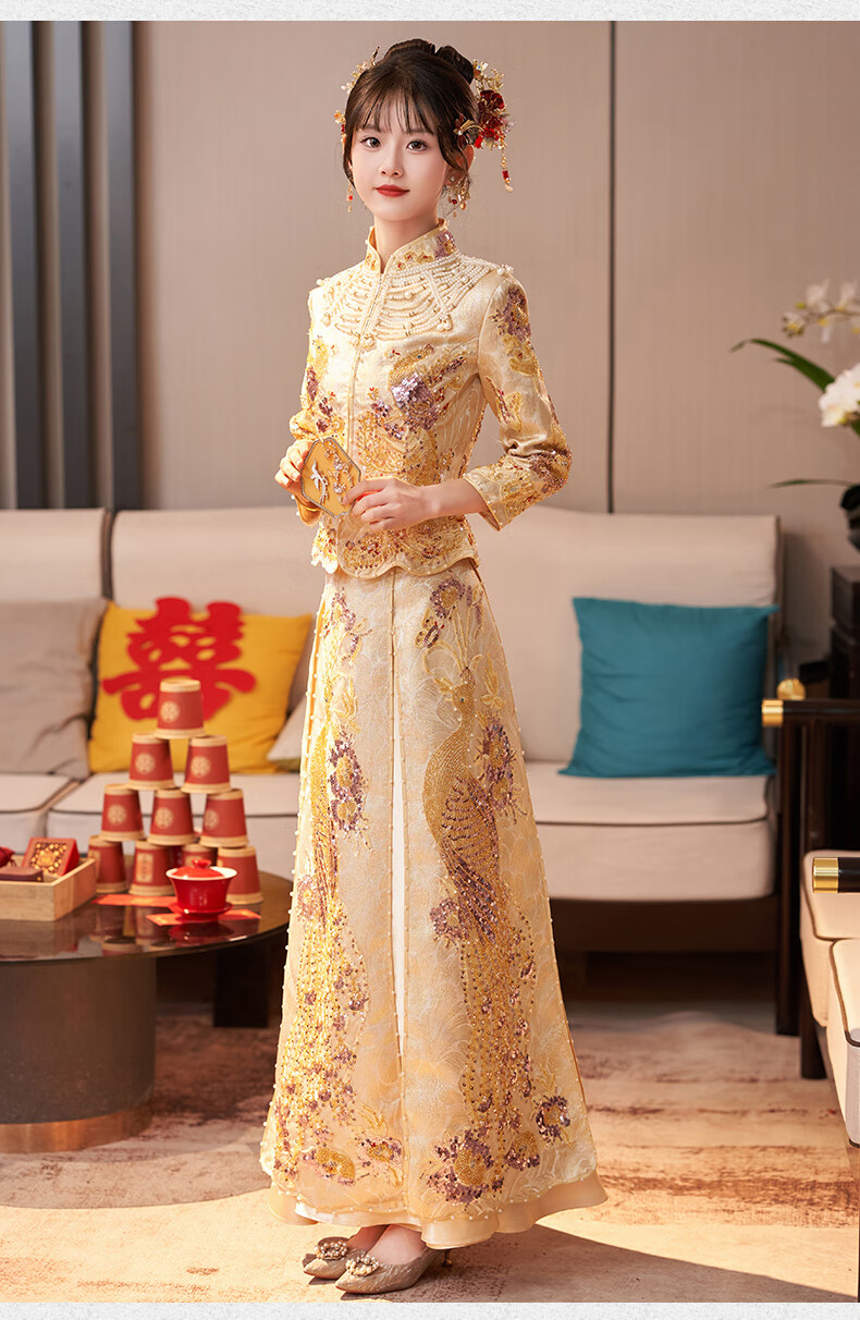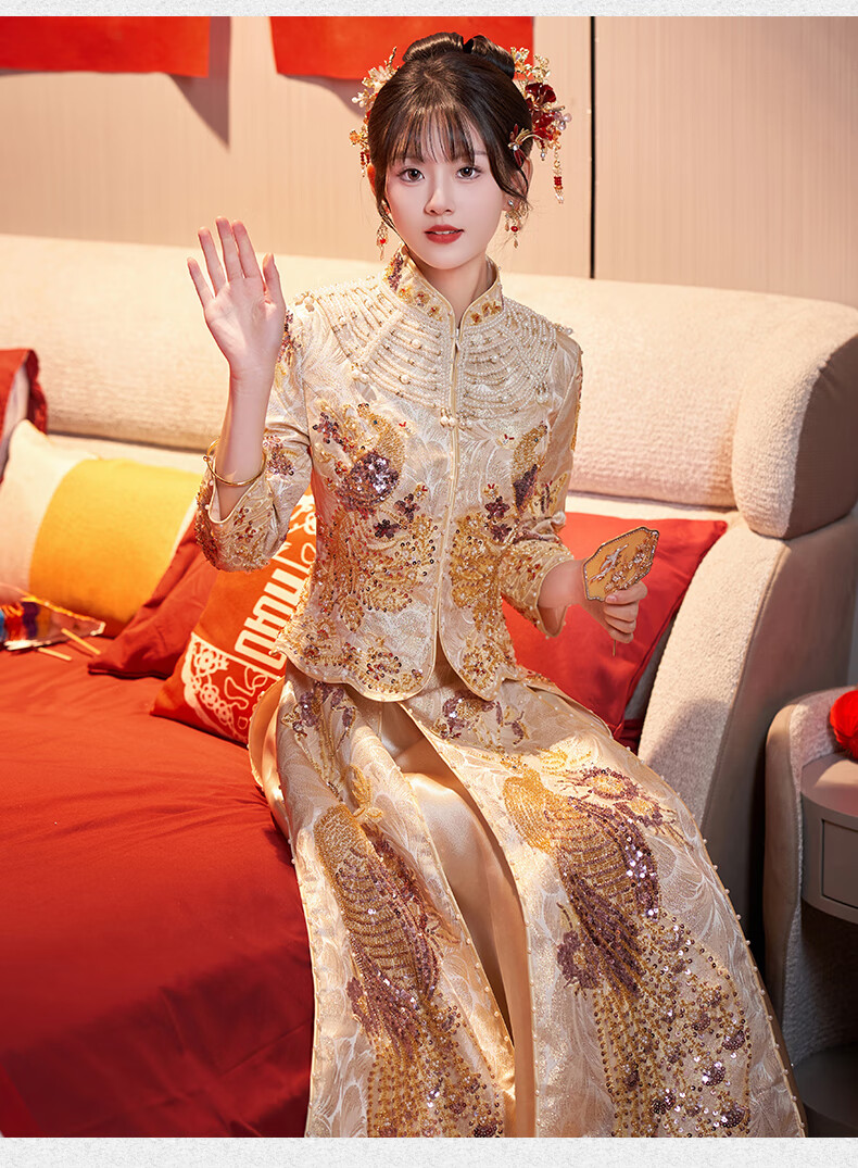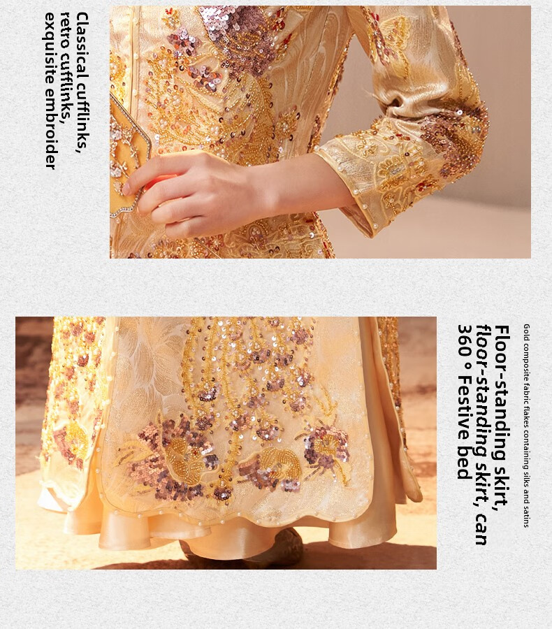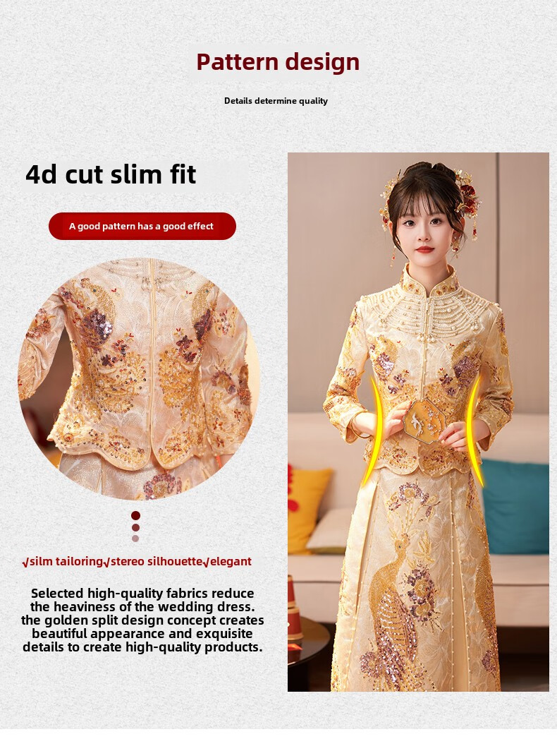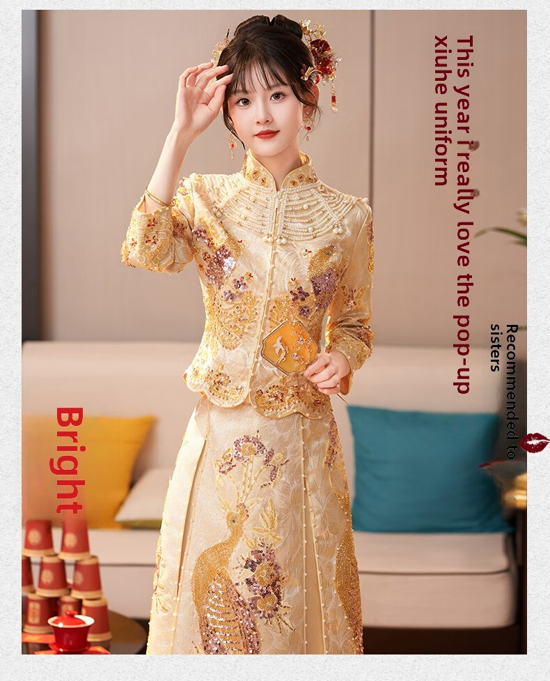 ROAR UTHAUG Champagne Show and Dress Bridal 2024 New Chinese Style Wedding Dress Small Toast Dress Autumn and Winter Wedding Dress High-end Gold Beads (No Headgear) S