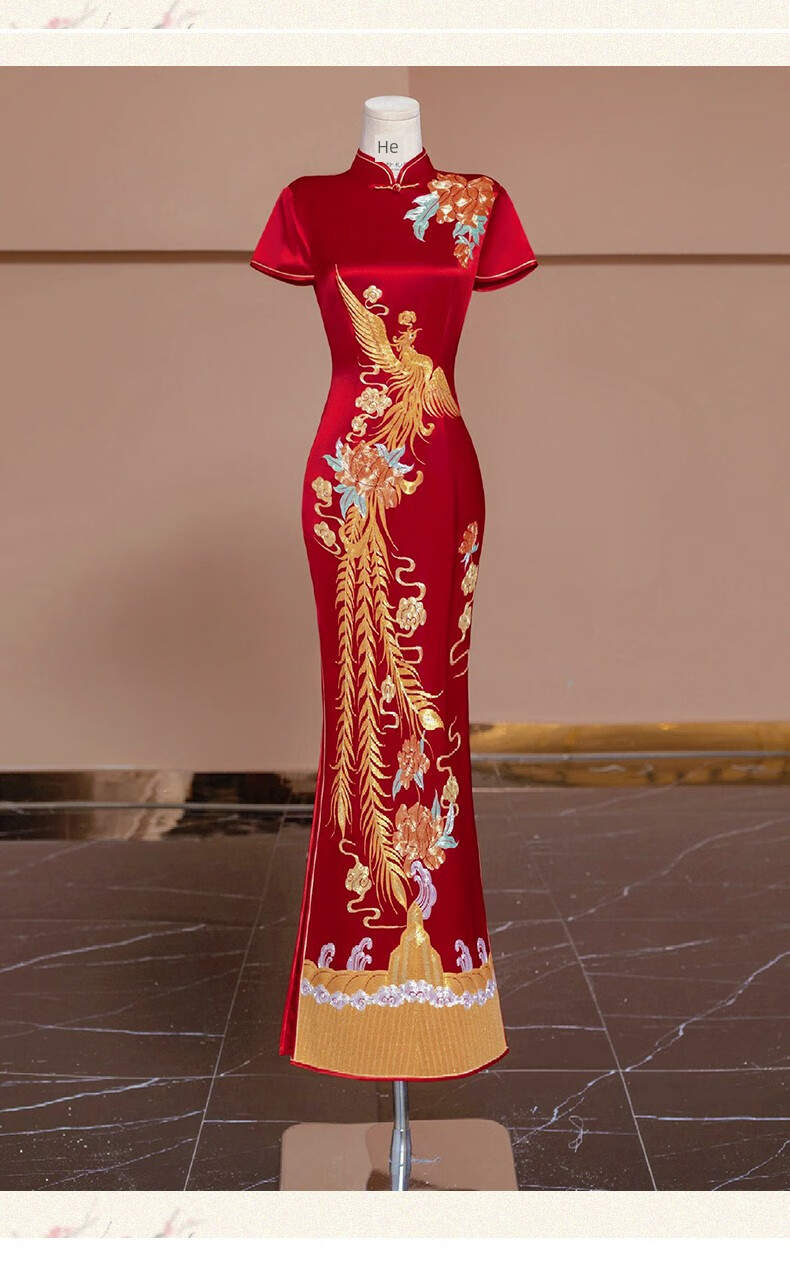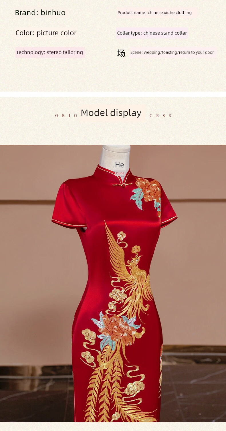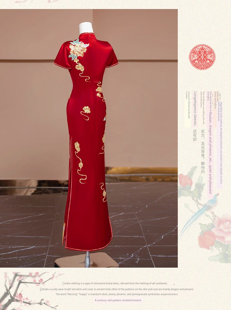 ROAR UTHAUG embroidered cheongsam embroidered and wedding dress 2025 bridal wedding dress Chinese wedding dress walk out of the pavilion toast dress engagement dress red cheongsam with free earrings S