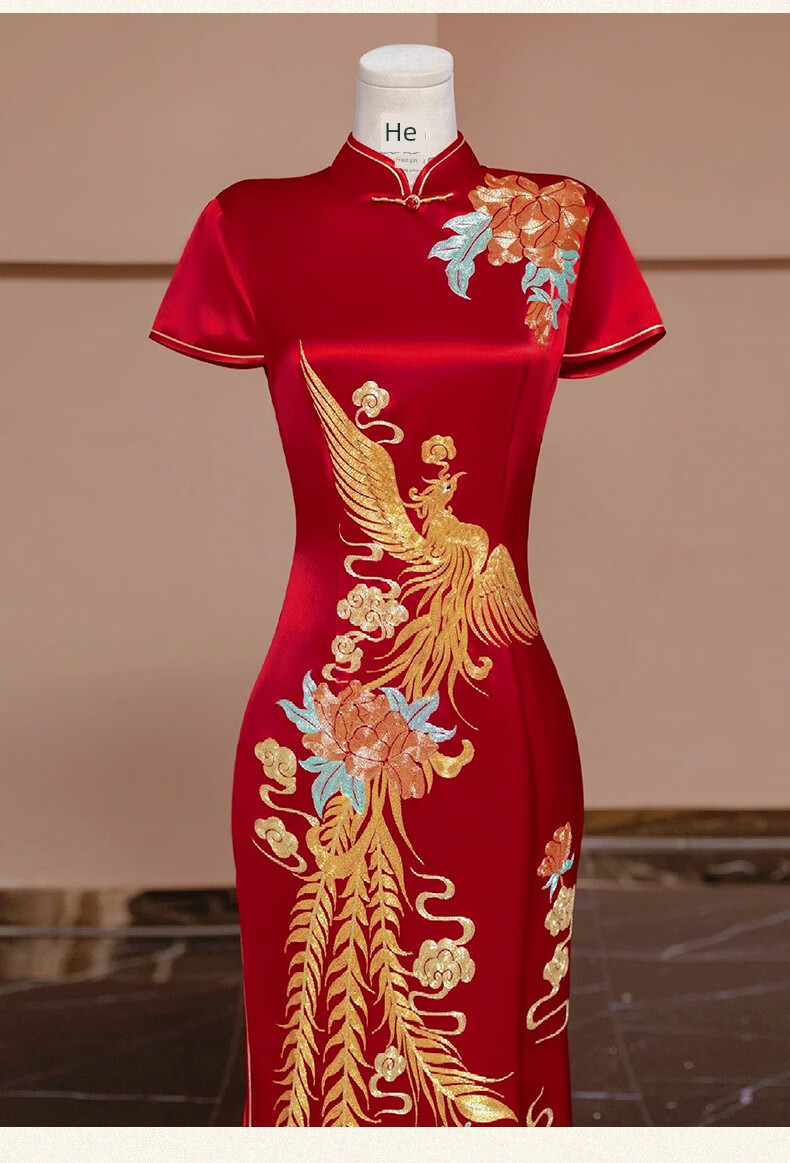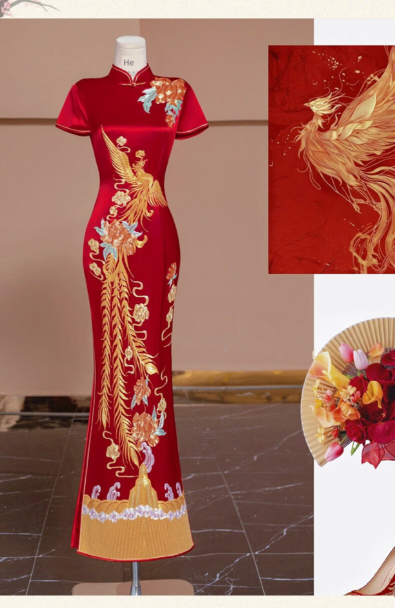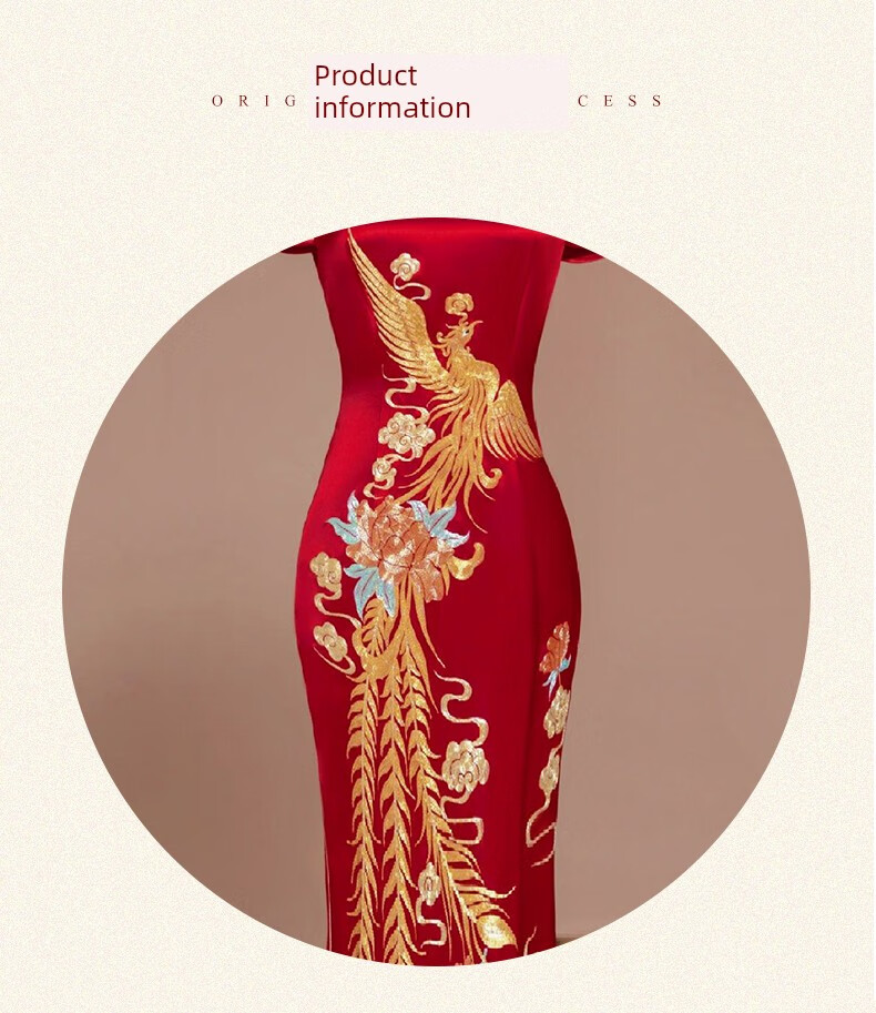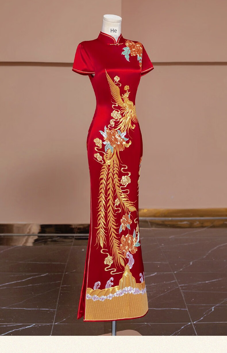 ROAR UTHAUG embroidered cheongsam embroidered and wedding dress 2025 bridal wedding dress Chinese wedding dress walk out of the pavilion toast dress engagement dress red cheongsam with free earrings S
