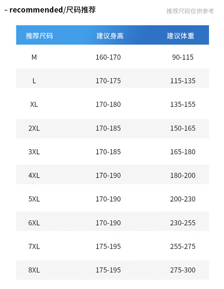 China (cm) 165 / 88-90 170 / 96-98 175 / 108-110 180 / 118-122 185 / 126-130