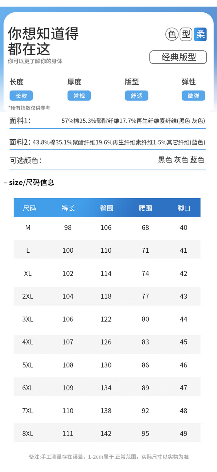 Outseam (cm) 99 cm 101.5 cm 104 cm 106.5 cm 109 cm