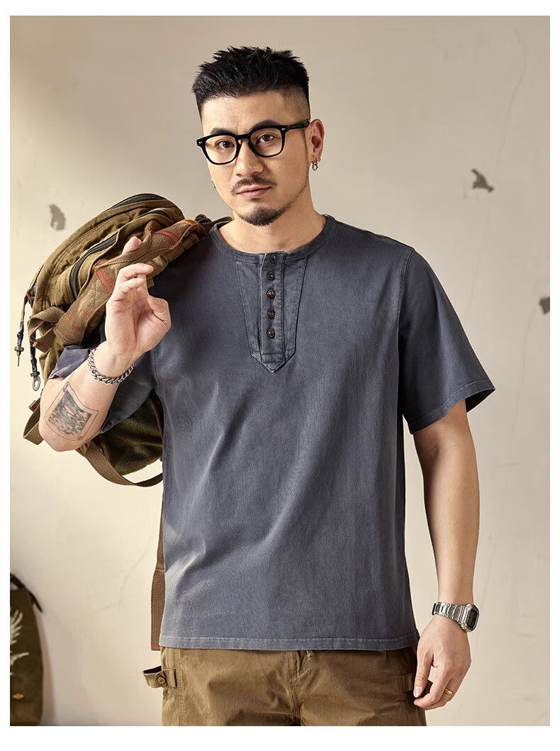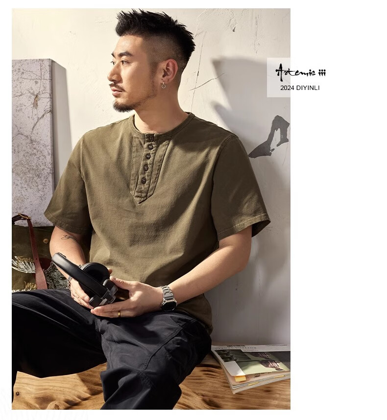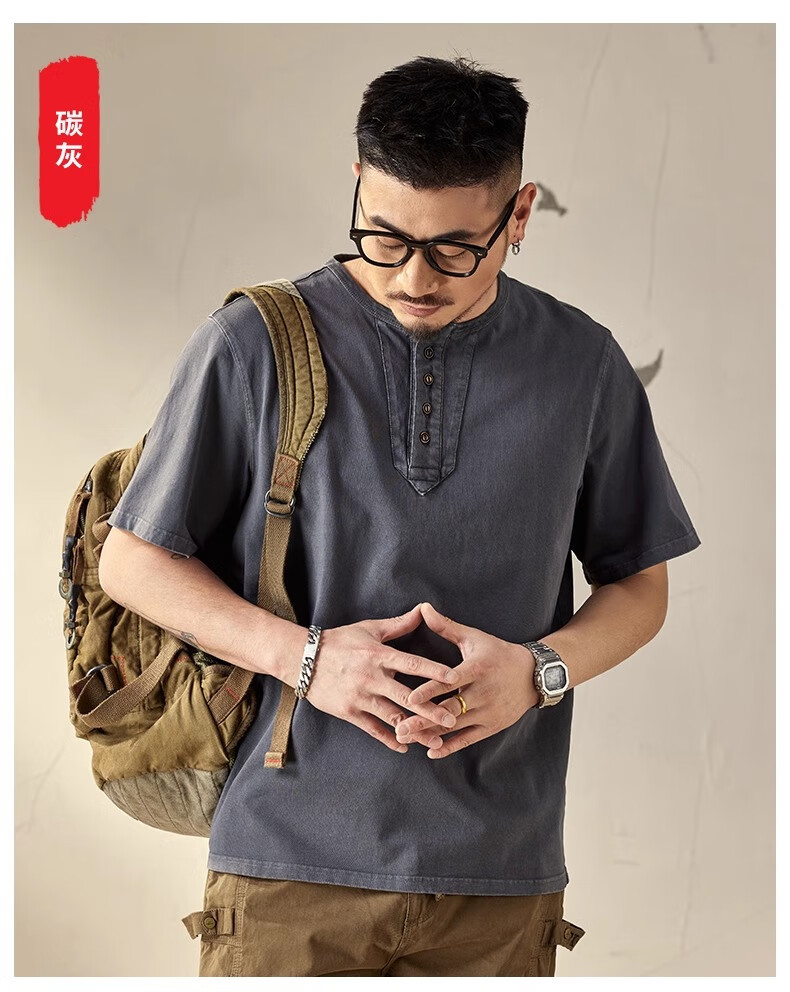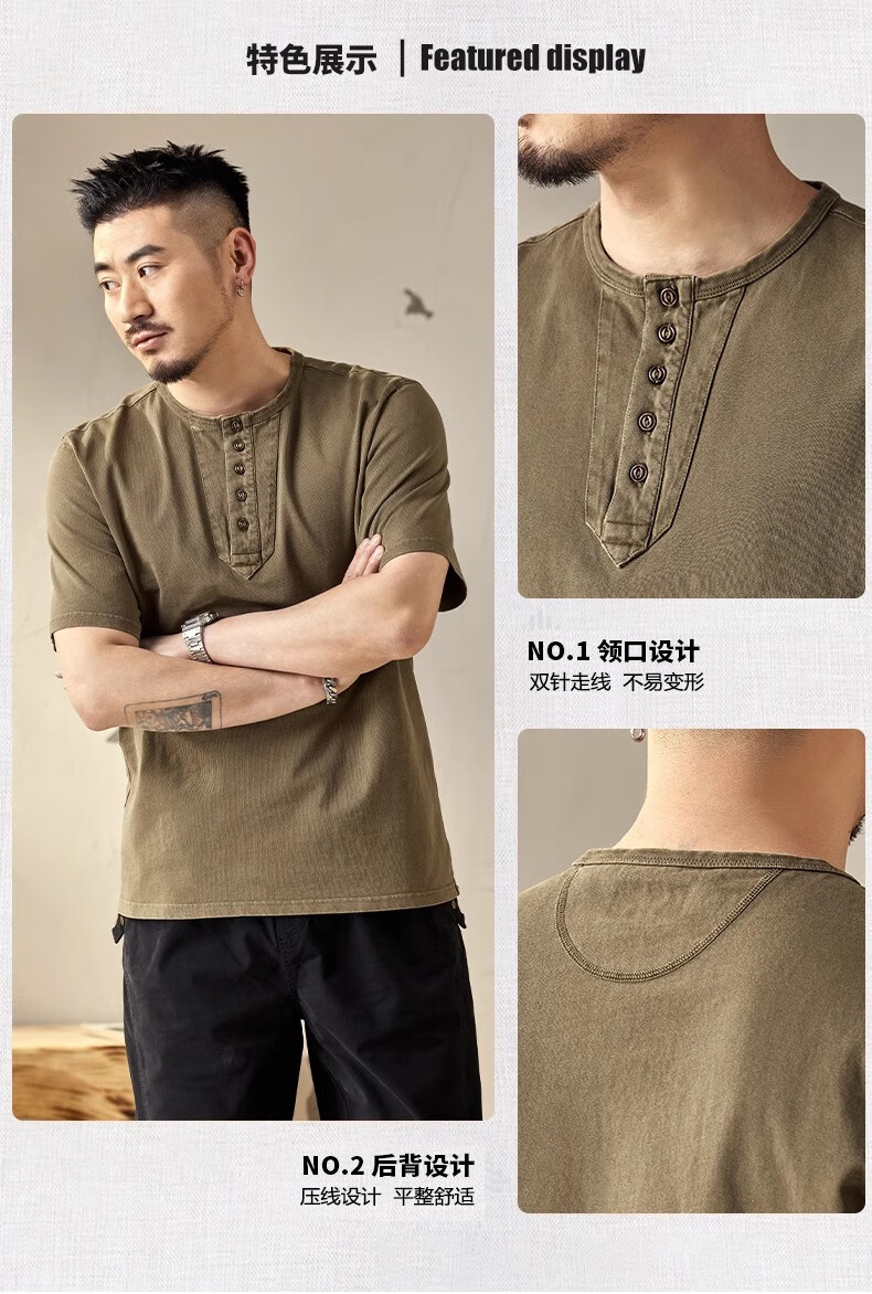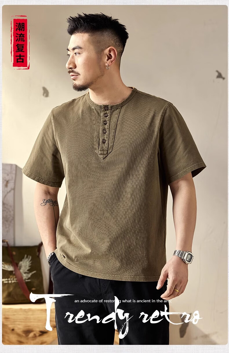 Xiaohongshu's popular high-end retro short-sleeved T-shirt for men in summer loose large size tough guy casual Henry collar bottoming shirt Mocha brown S S90-115Jin Jin is equal to 0.5 kg