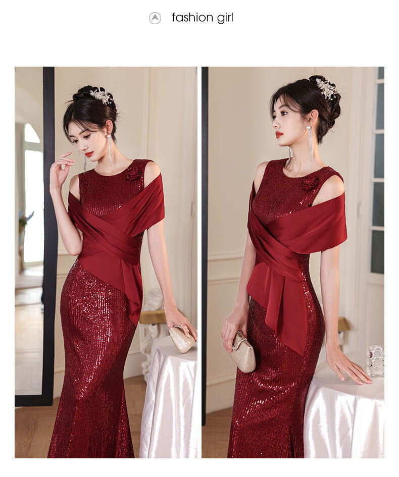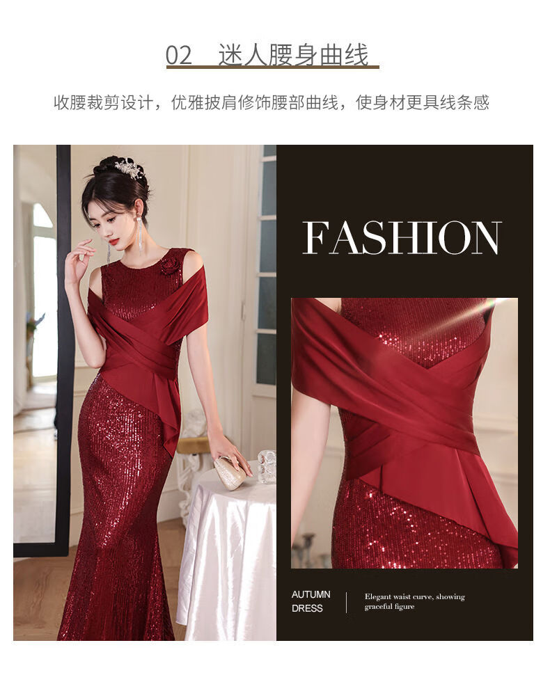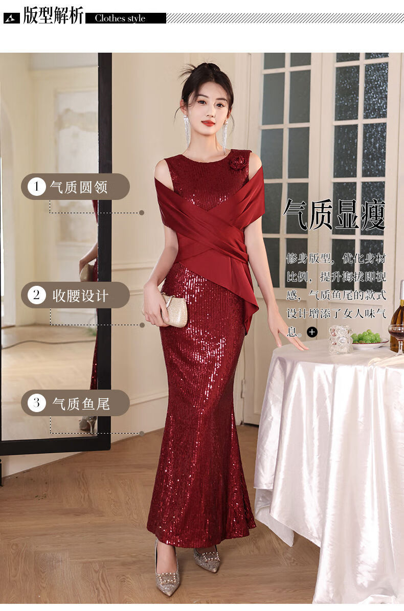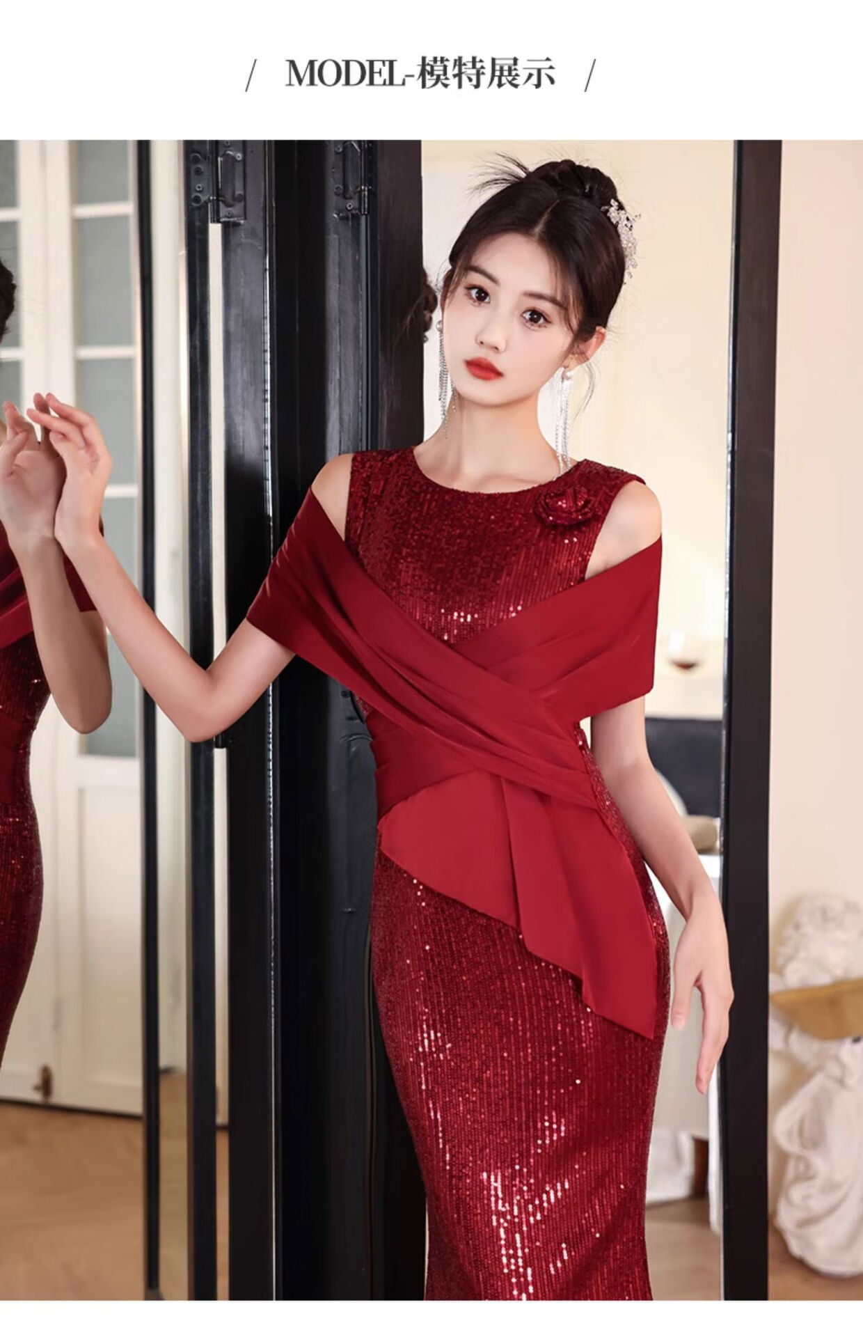 2025 new fashion off-shoulder burgundy sequined fishtail long evening dress for mother-in-law's wedding banquet burgundy skirt length 145CM 2XL 2XL