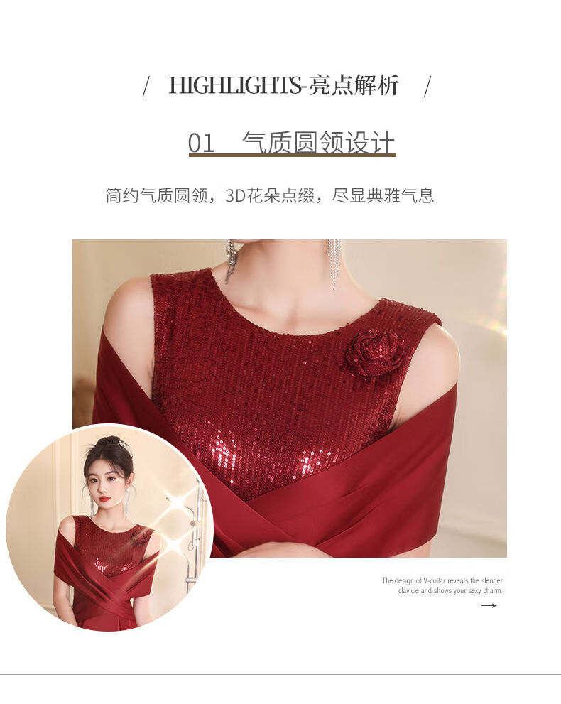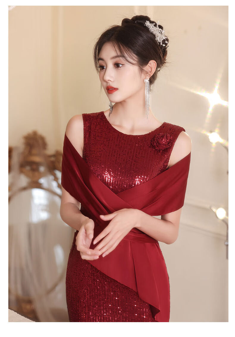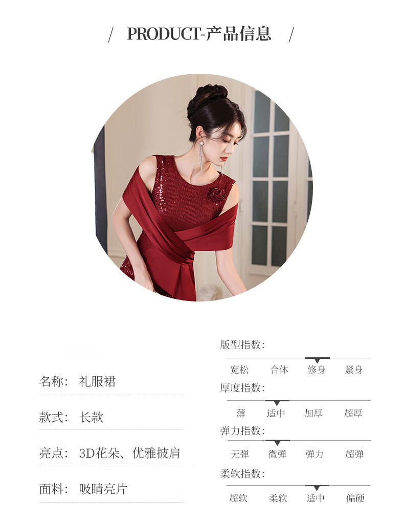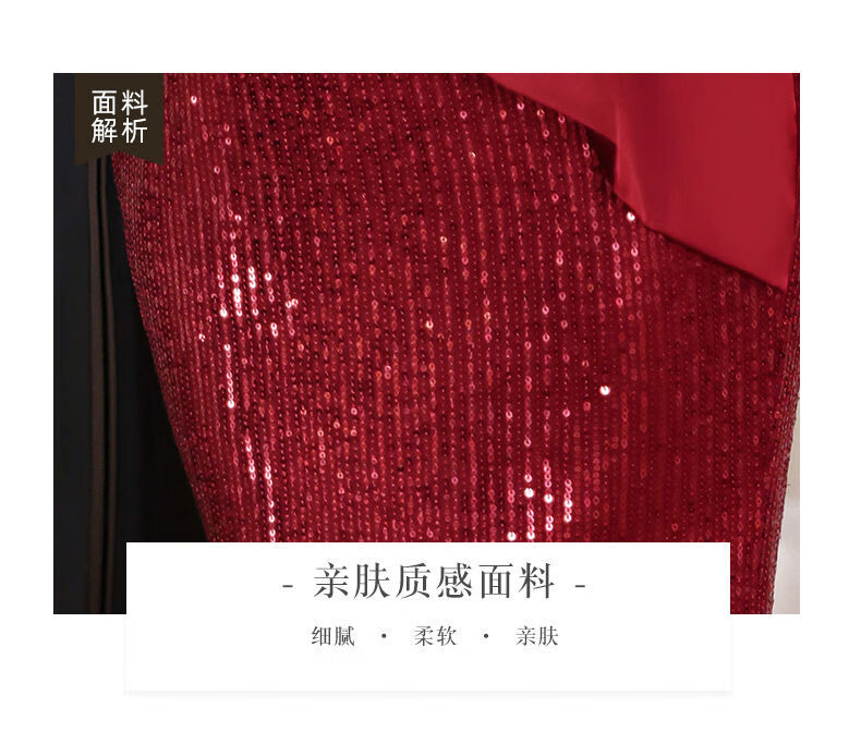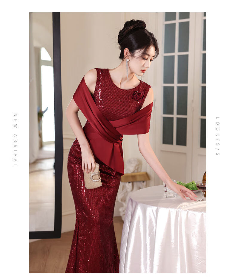 2025 new fashion off-shoulder burgundy sequined fishtail long evening dress for mother-in-law's wedding banquet burgundy skirt length 145CM 2XL 2XL