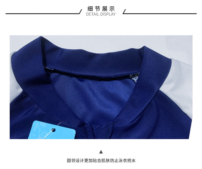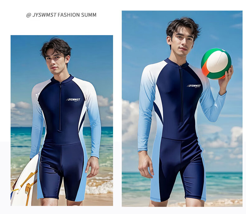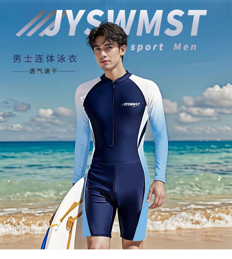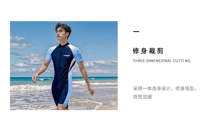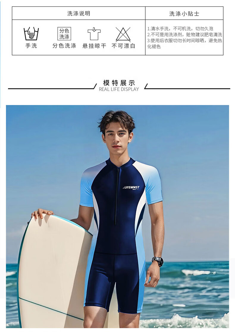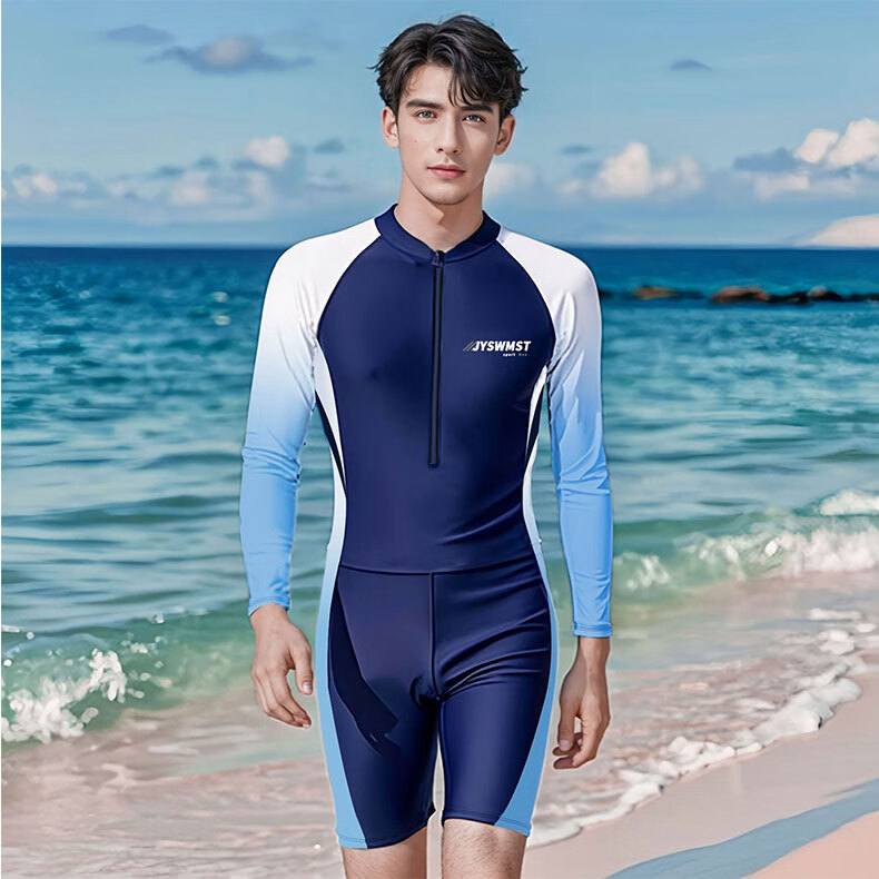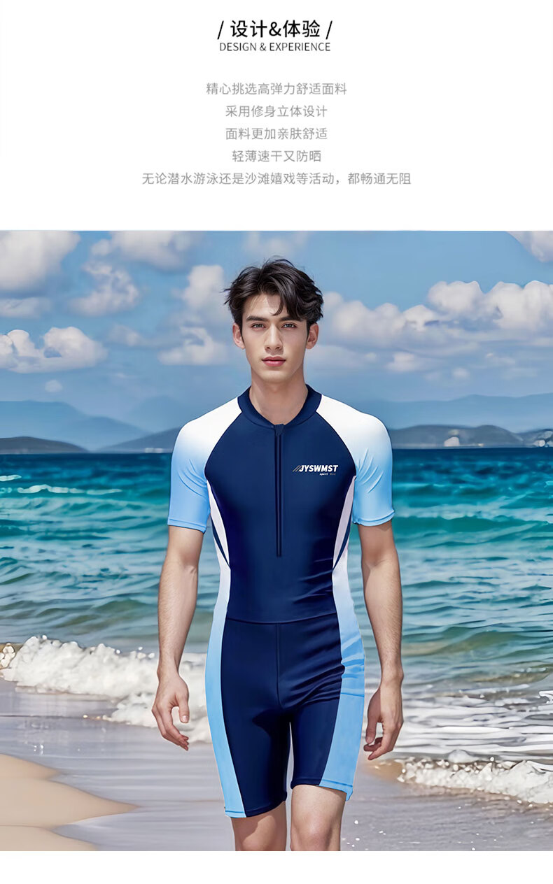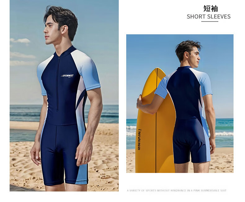 One-piece men's swimsuit for adults and teenagers plus size fat children long-sleeved five-quarter pants sun protection surfing suit swimsuit navy short-sleeved + silicone cap + flat swimming goggles + nose clip earplugs L_90-110Jin Jin equals 0.5 kg