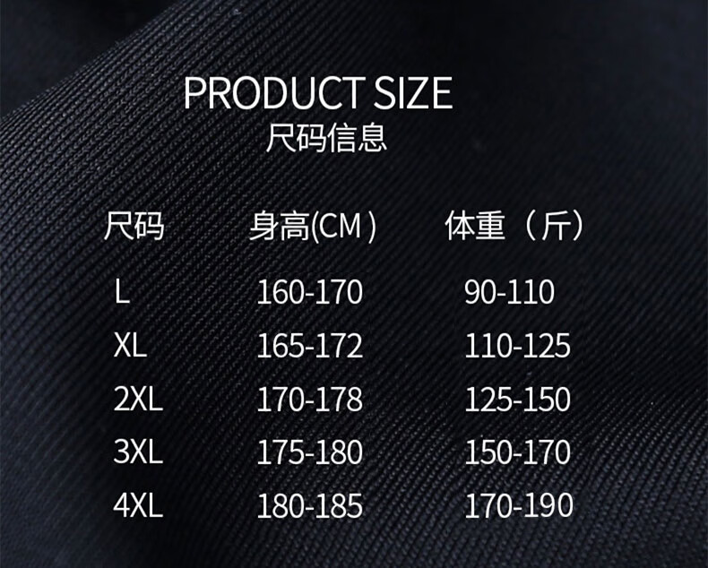 China (cm) 165 / 88-90 170 / 96-98 175 / 108-110 180 / 118-122 185 / 126-130