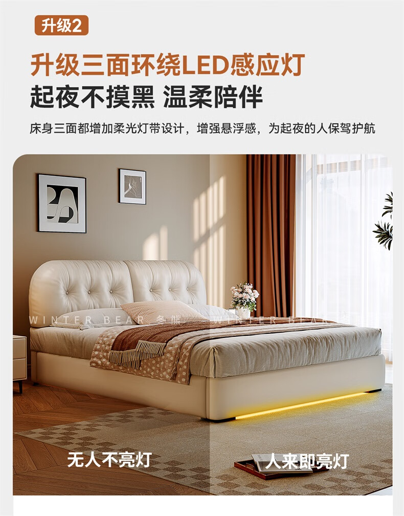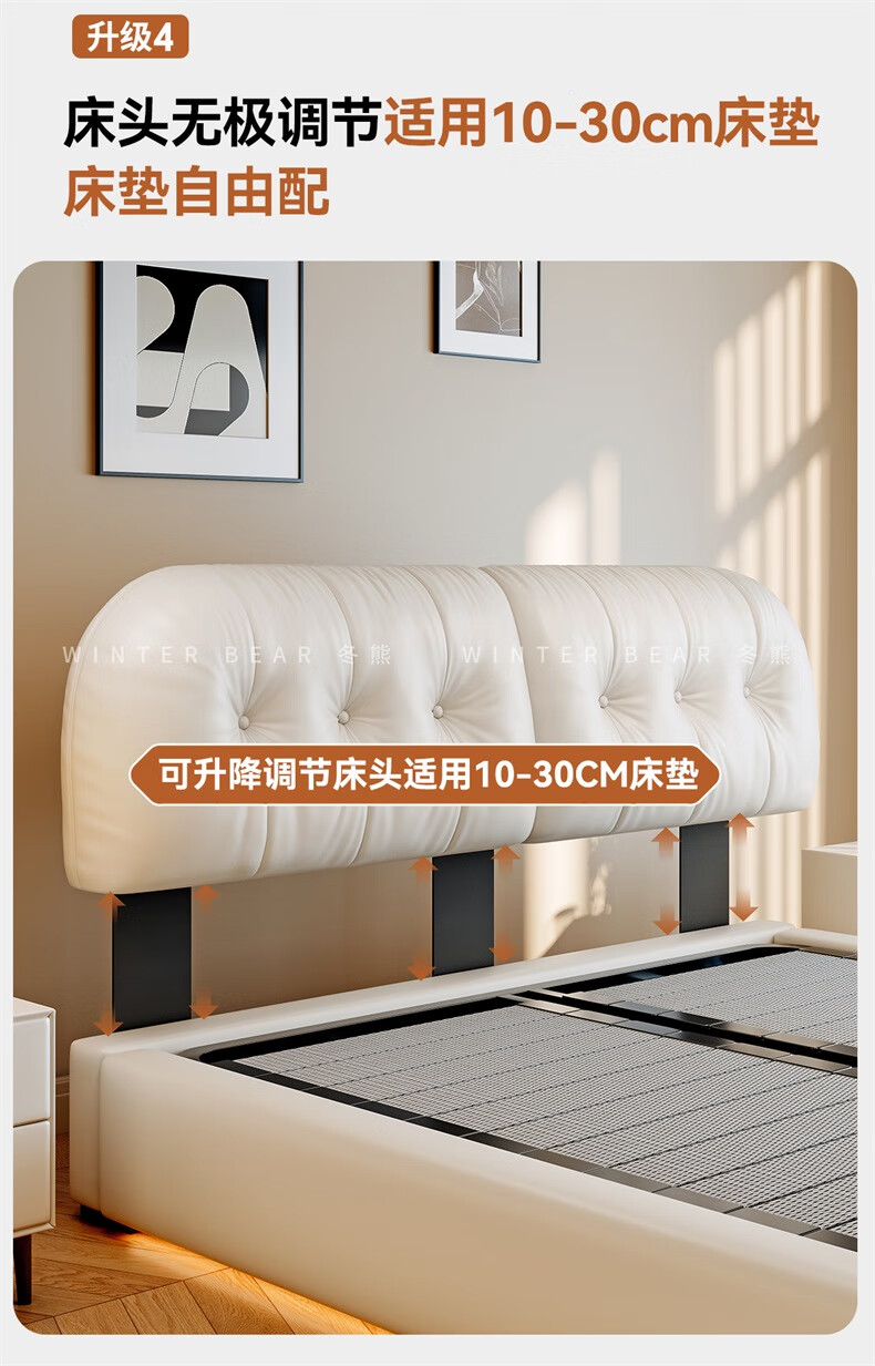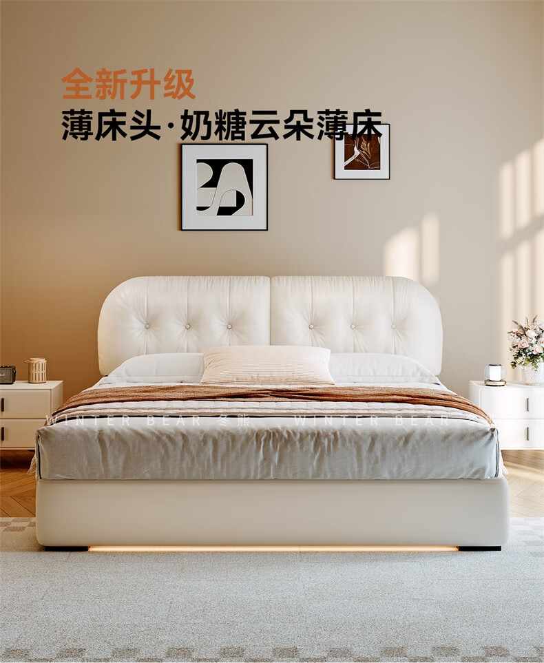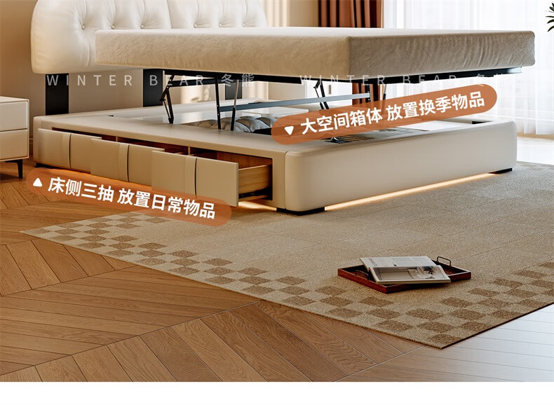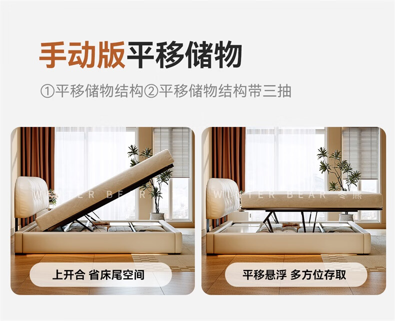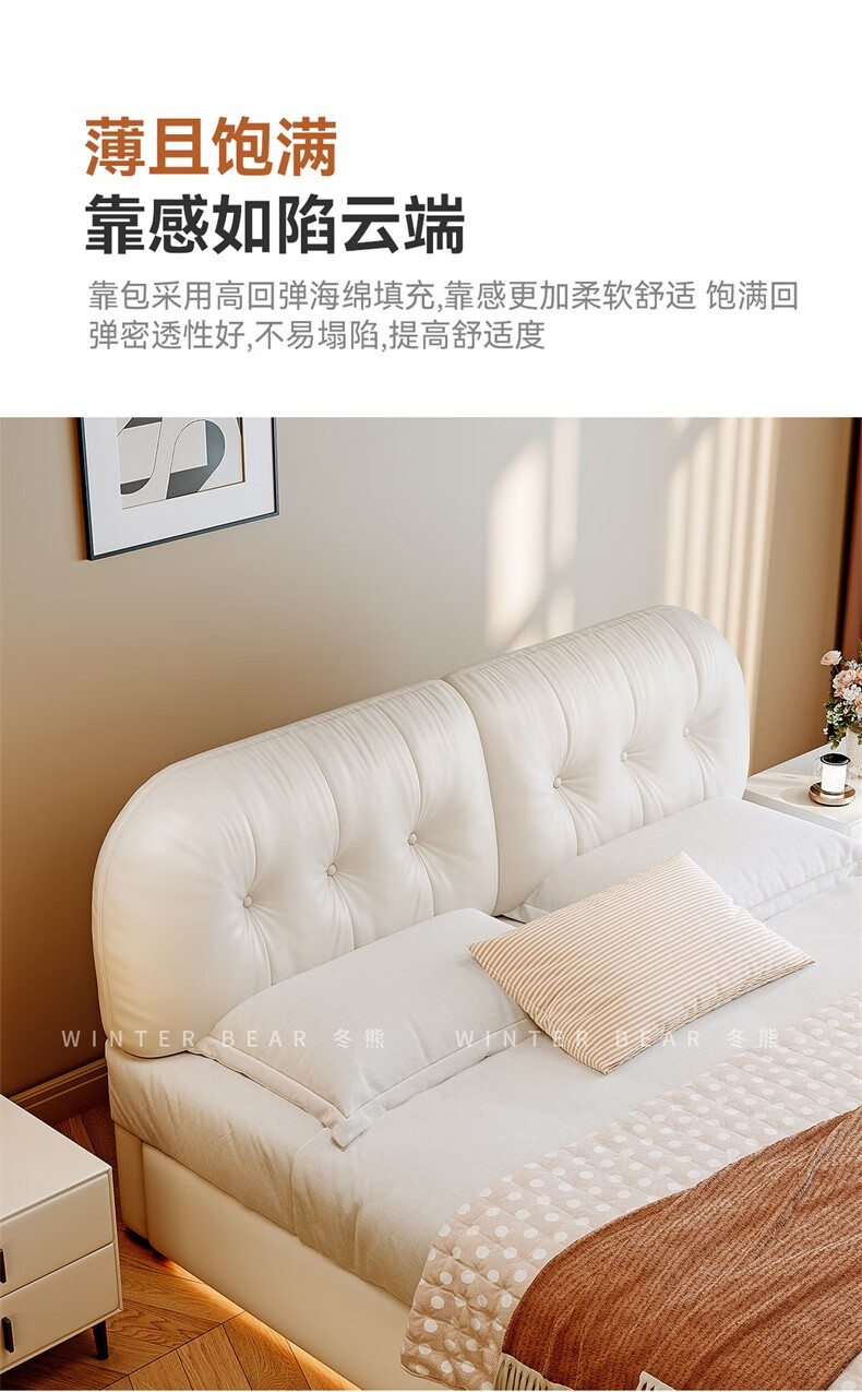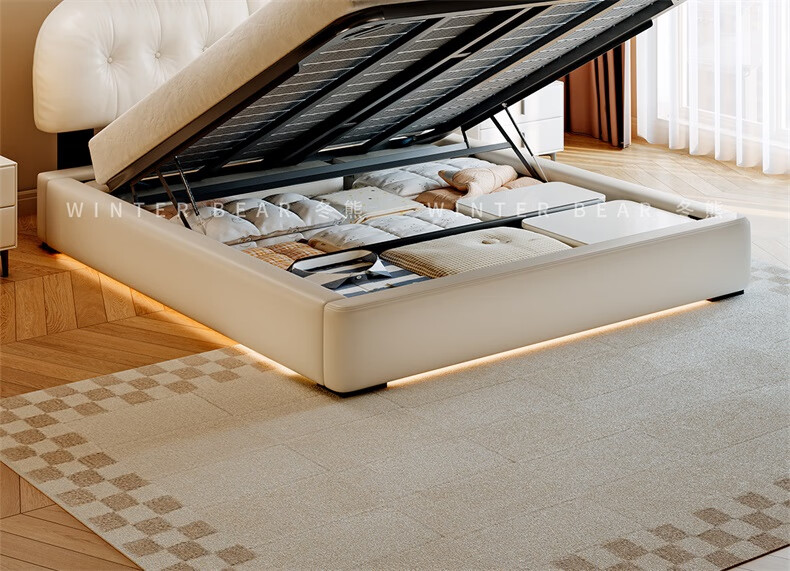 Winter Bear Toffee Cloud Bed Ultra-Thin Bedside Leather Puff Cream Style Double Master Bedroom High Box Storage Translation Bed Imported Cowhide Bed/Full Solid Wood Beech Rib Frame 1800mm*2000mm-Translation Storage Structure