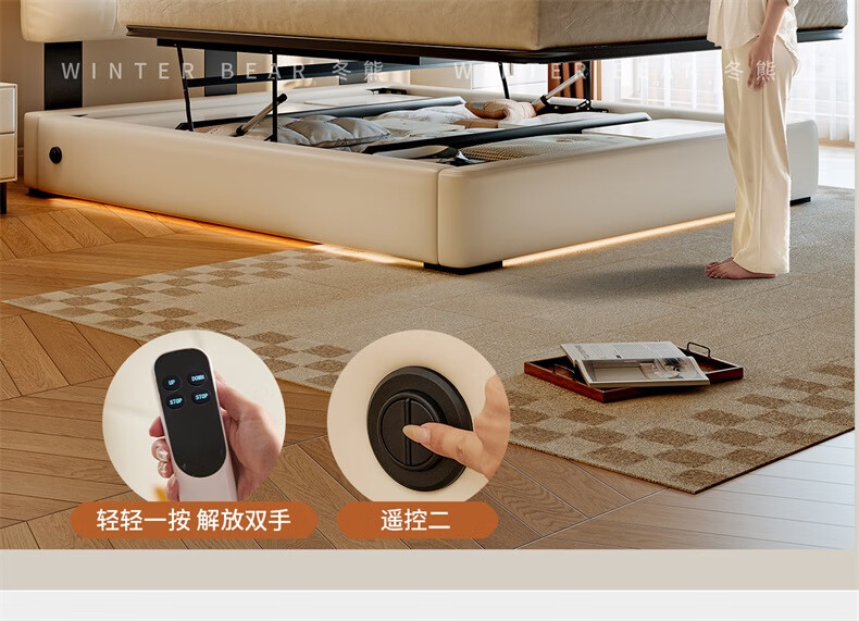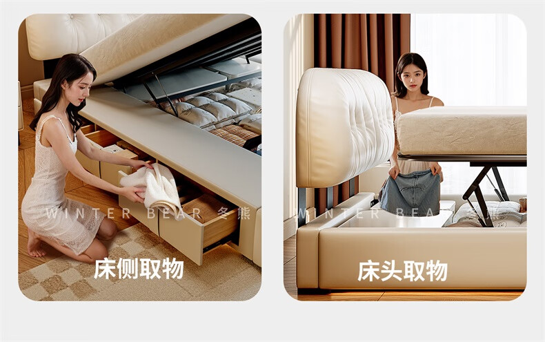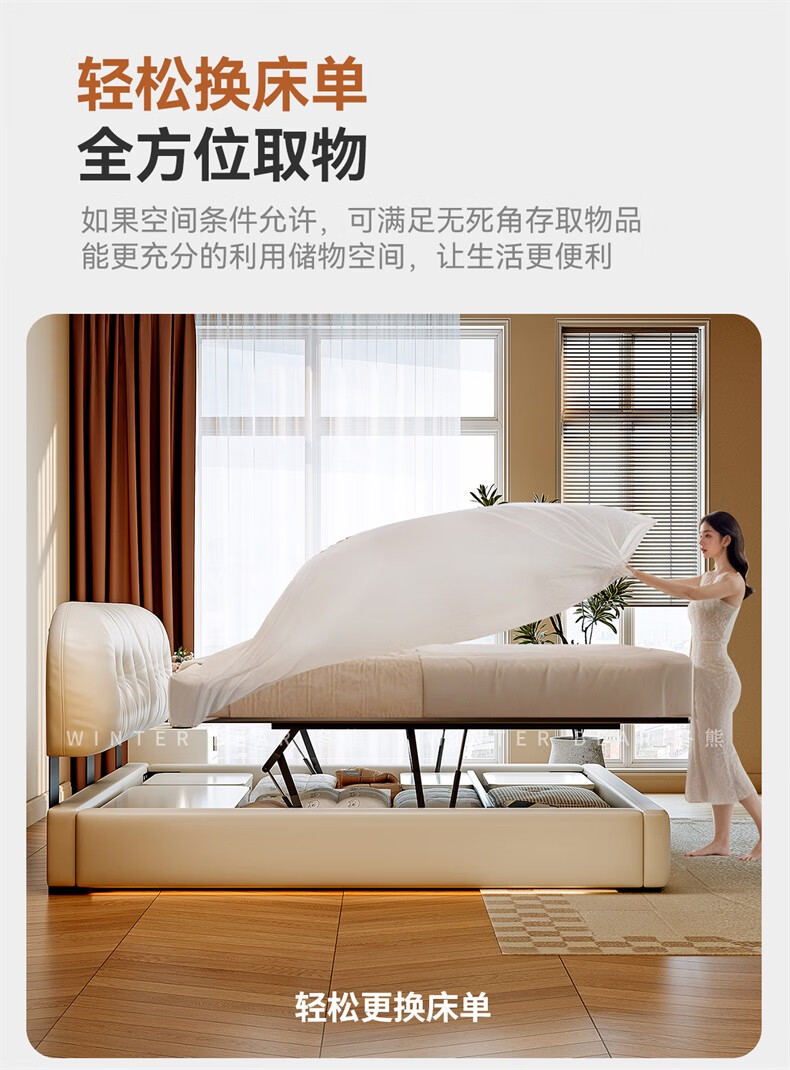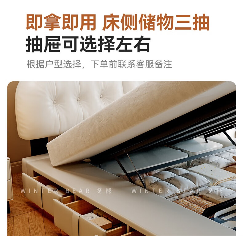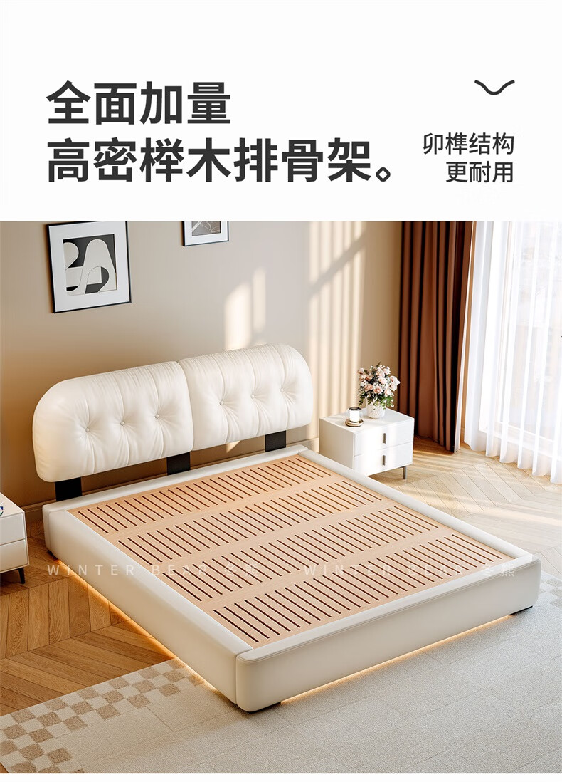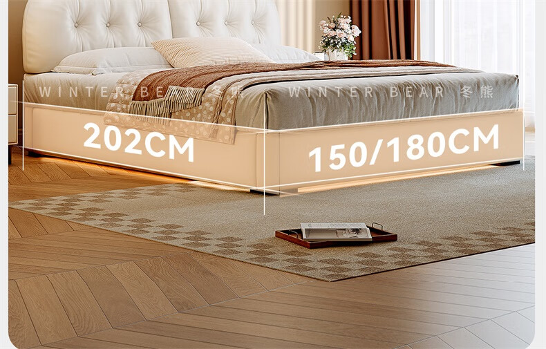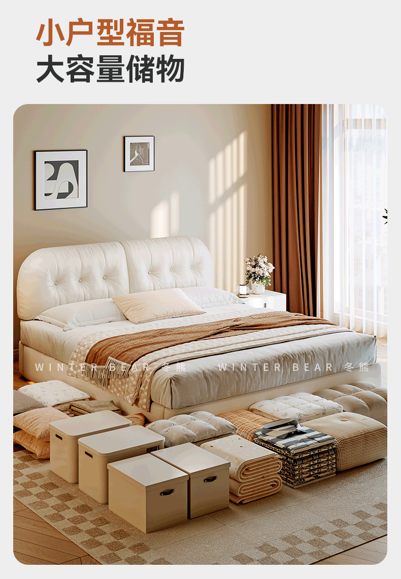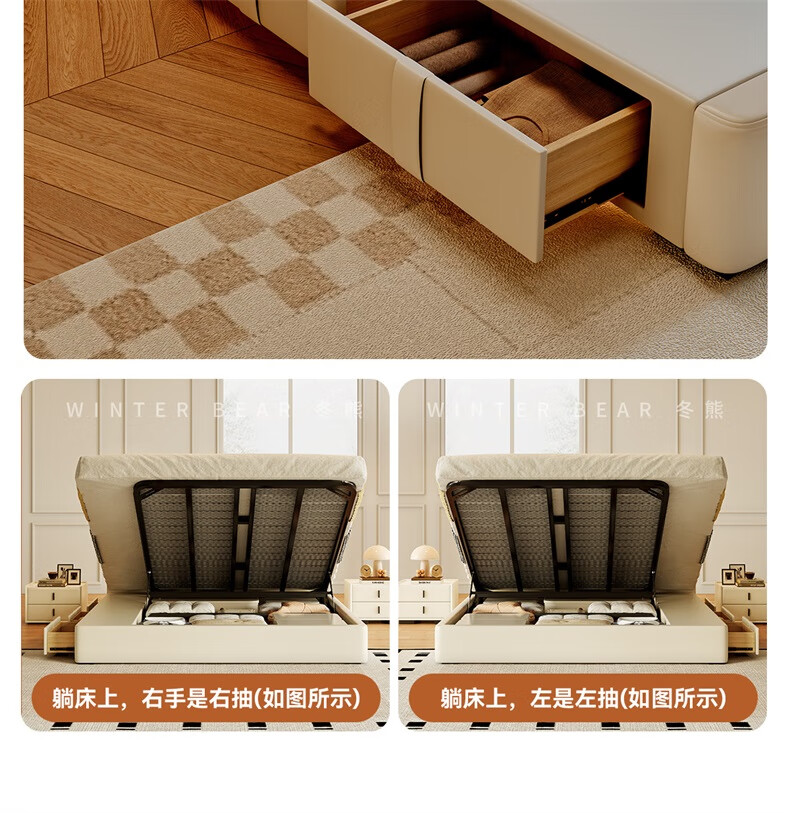 Winter Bear Toffee Cloud Bed Ultra-Thin Bedside Leather Puff Cream Style Double Master Bedroom High Box Storage Translation Bed Imported Cowhide Bed/Full Solid Wood Beech Rib Frame 1800mm*2000mm-Translation Storage Structure