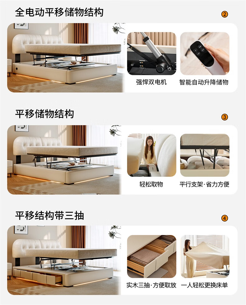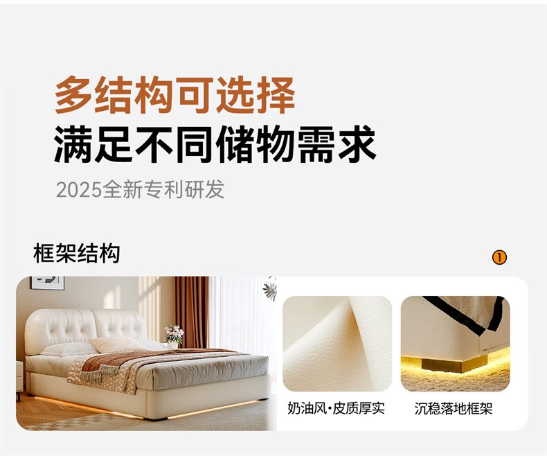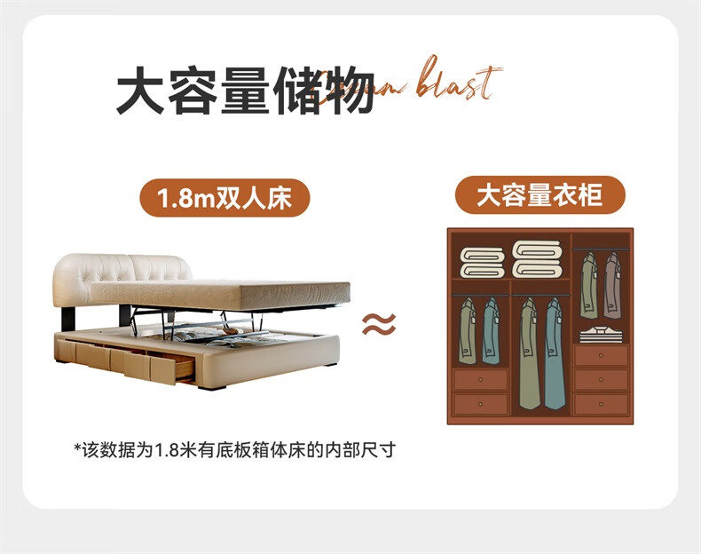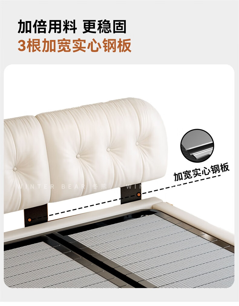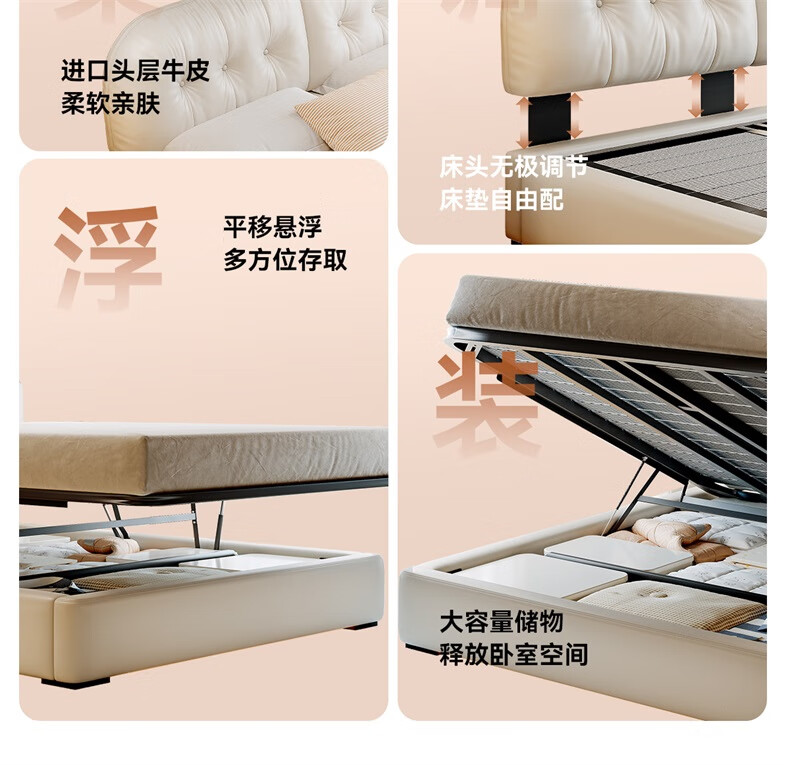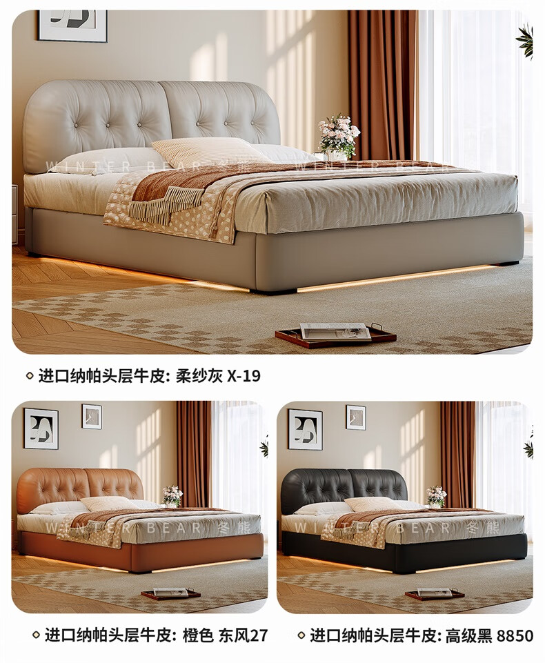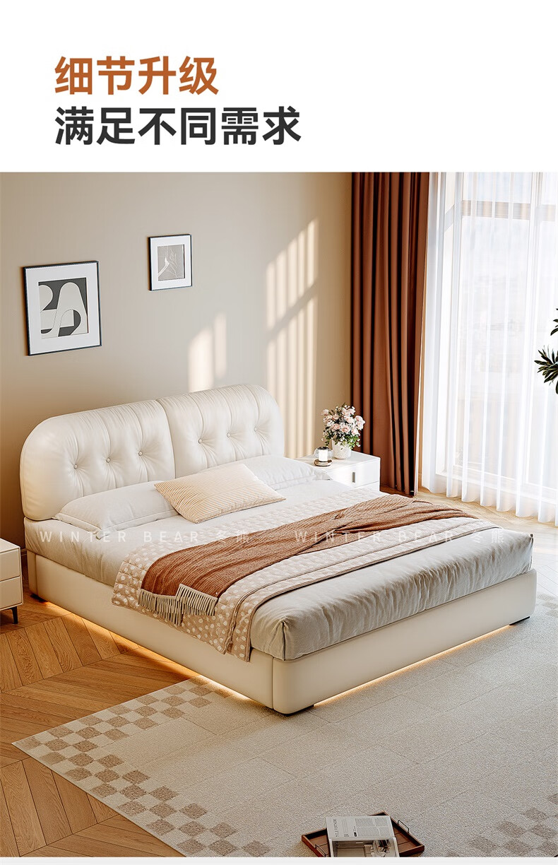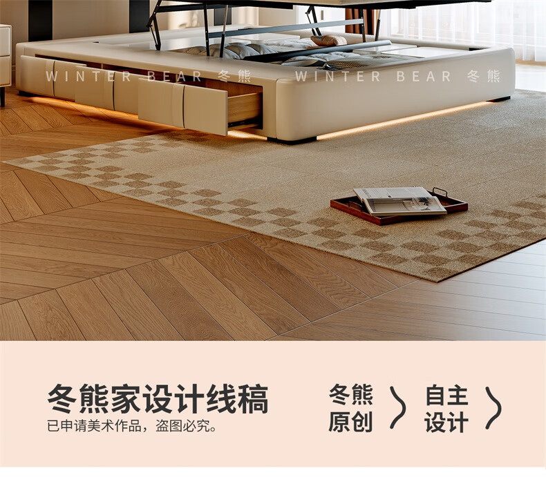 Winter Bear Toffee Cloud Bed Ultra-Thin Bedside Leather Puff Cream Style Double Master Bedroom High Box Storage Translation Bed Imported Cowhide Bed/Full Solid Wood Beech Rib Frame 1800mm*2000mm-Translation Storage Structure