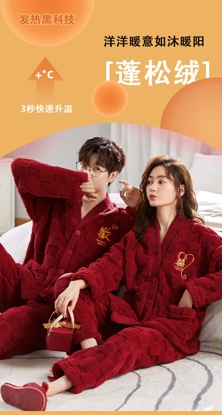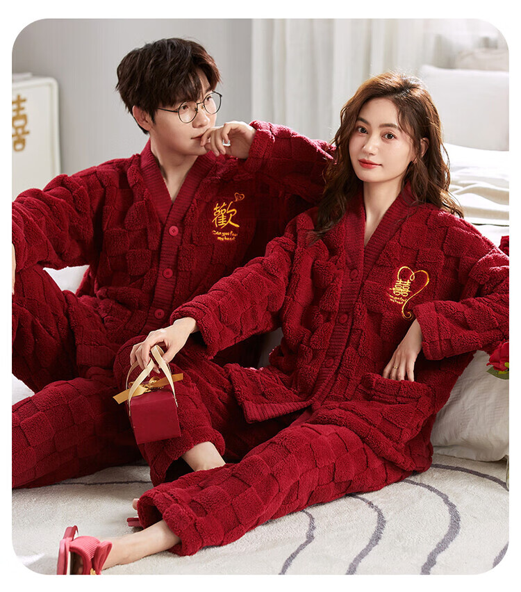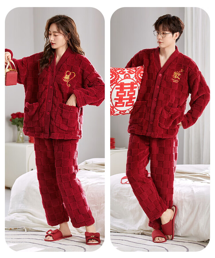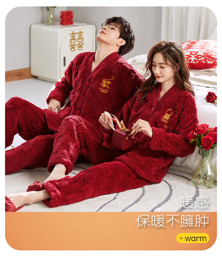 LangSha wedding couple pajamas autumn and winter style coral velvet thickened female bride bright red flannel newlywed men's home wear HMF-7815 M female M + male L