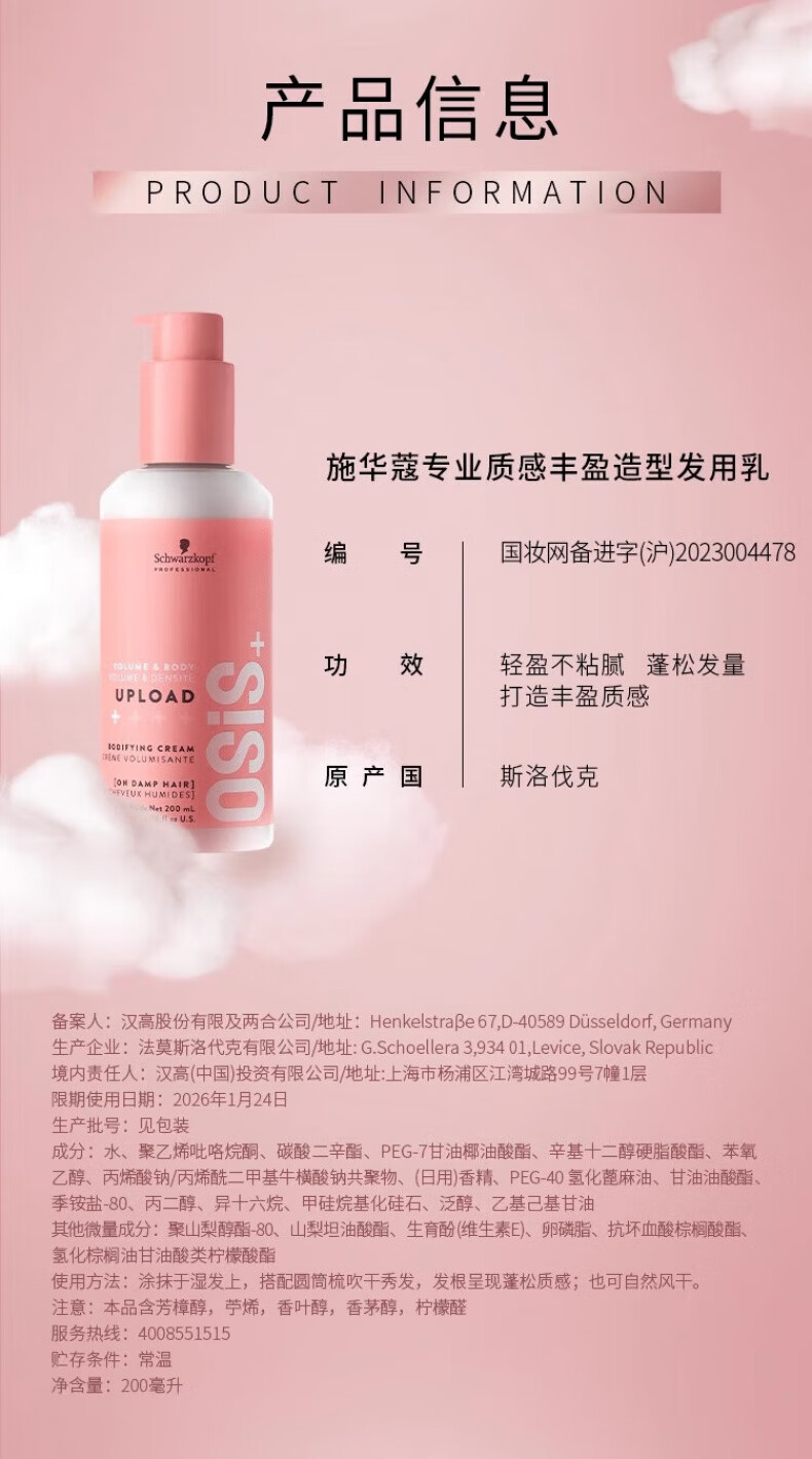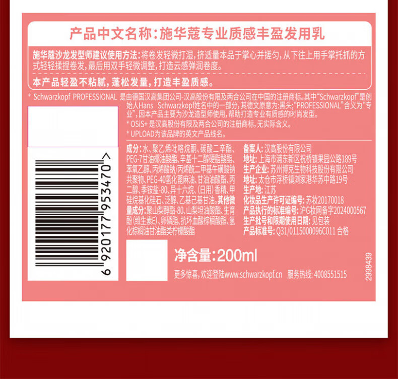Schwarzkopf No. 2 Elastin Plumping Cream Women's Volume Moisturizing Protector Long-lasting Anti-frizz Styling Moisturizing Protector Shaping Anti-Frizz Domestic Production 200ml 1 Bottle