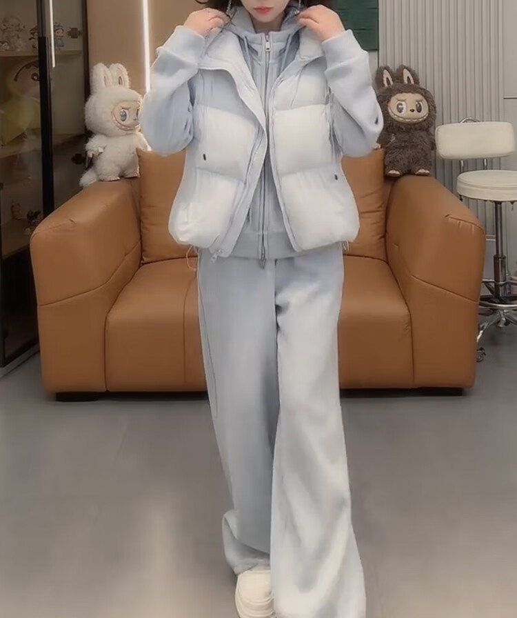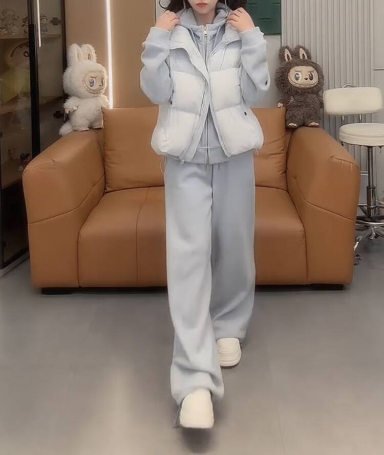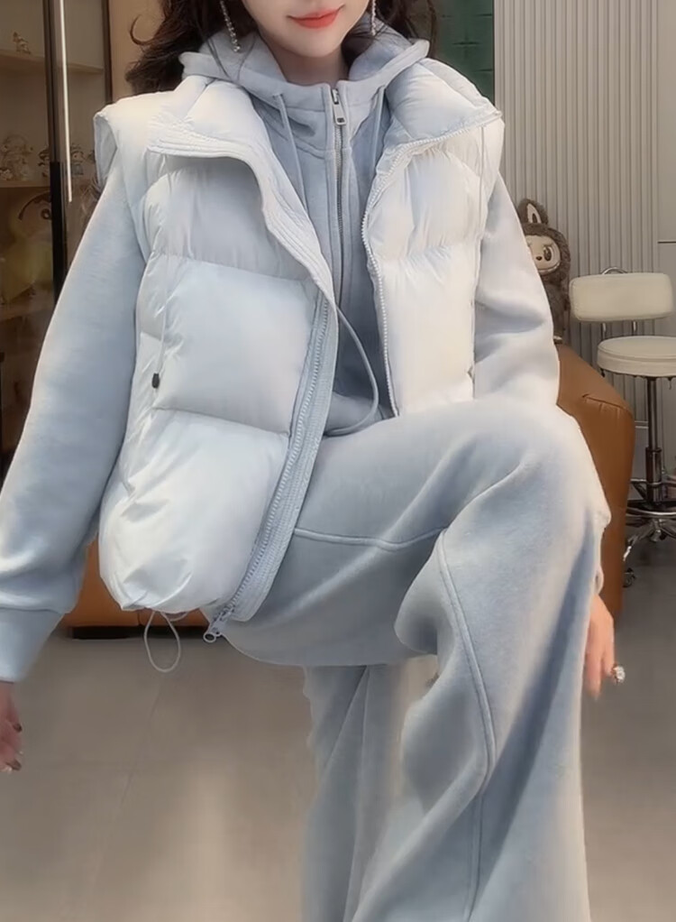 OUSIJIE large size women's Korean style stand-up collar cotton vest fashionable versatile jacket with sweatshirt and sweatpants three-piece suit for women blue vest + blue top + blue pants L 105-120Jin Jin equals 0.5 kg