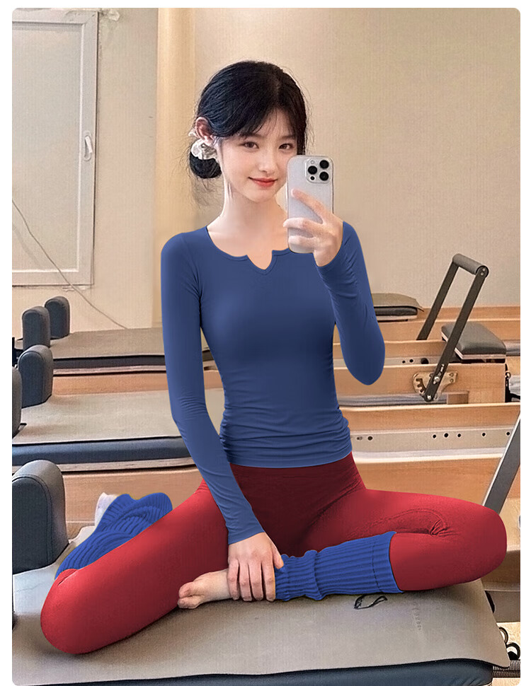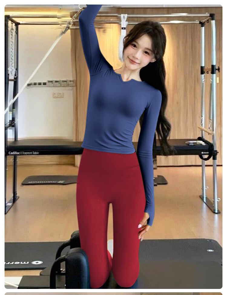 Shuangxiu's super-good-looking yoga clothing set can be worn outside with chest padded sports top, long-sleeved and beautiful Pilates training clothing for women, green top + burgundy pants L 115-125